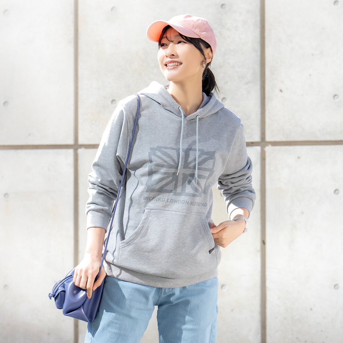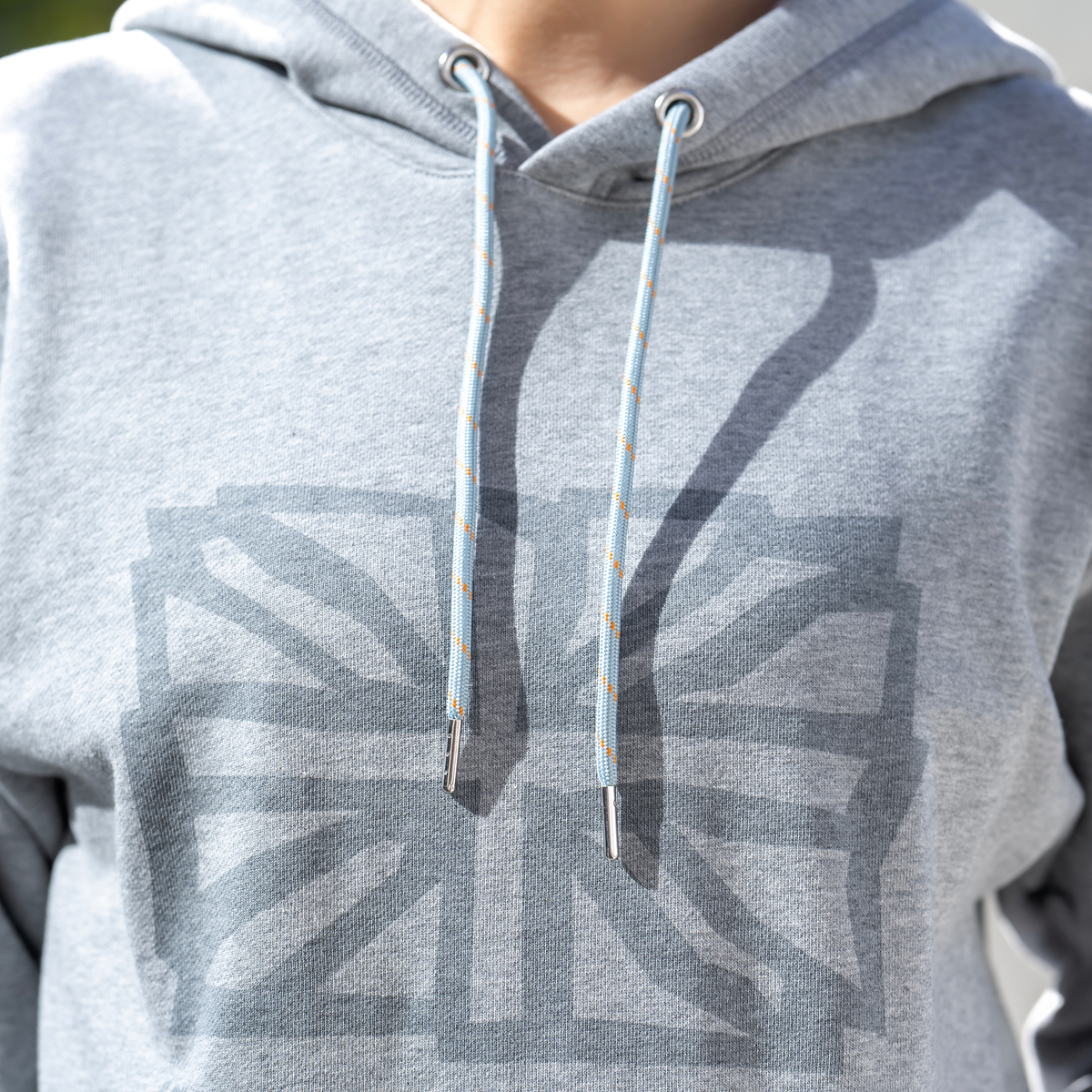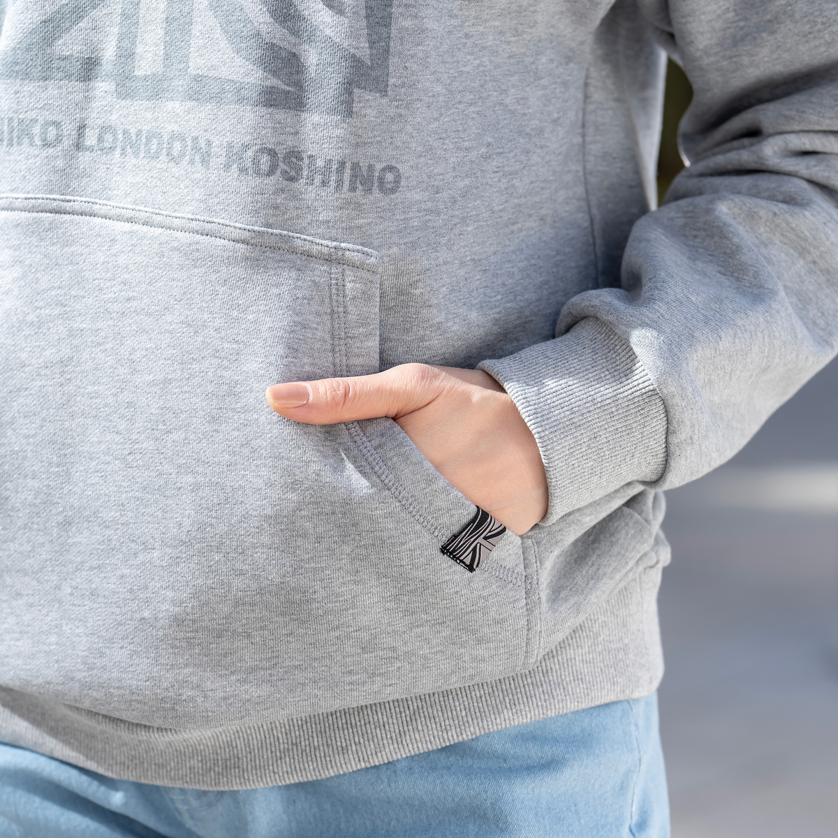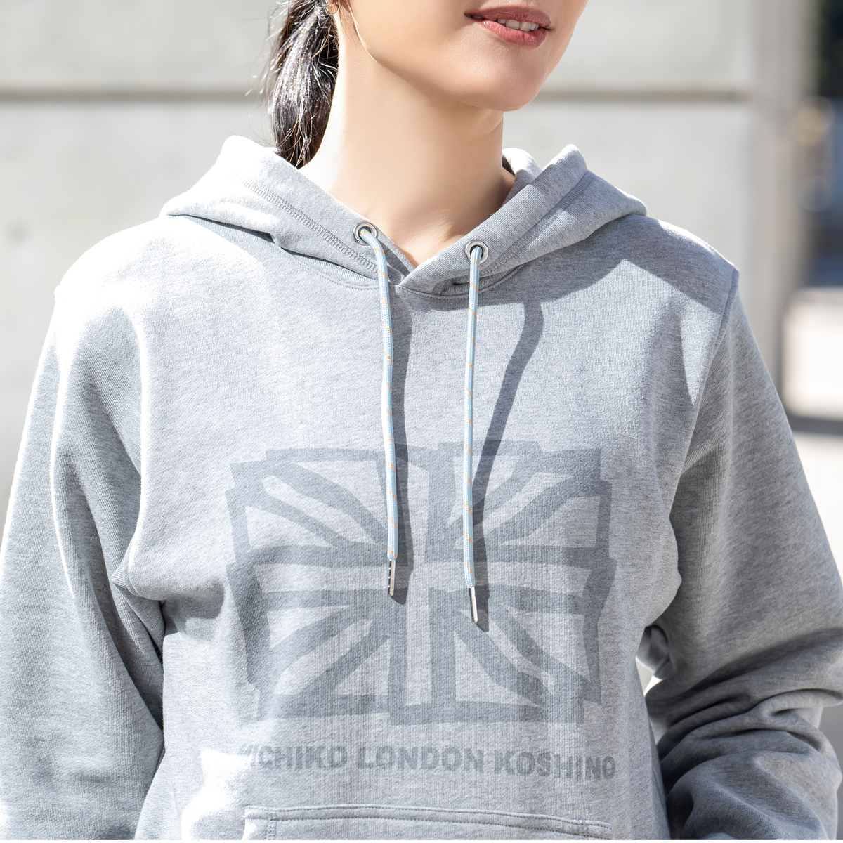 ユニオンジャックをフロントに配したフーディ。アクセントカラーのヒモが全体を引き締め、左ポケット口にはMKとユニオンジャックを合わせたデザインのピスネームでさりげなく個性を添えています
