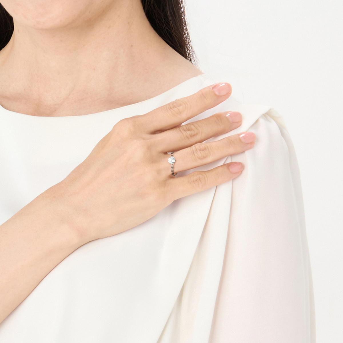 0.50ctUPの合成モアッサナイトがきらめくチェーンリングです。正面の2連のペタルチェーンがデザインに華やぎを加え、裏側はスライド式アジャスター付きでサイズ調節ができます