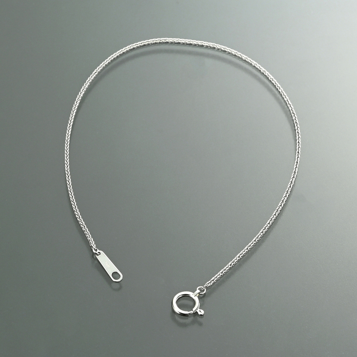 麦の穂を思わせるスピガチェーンを、純プラチナで丁寧に編み上げたブレスレット。細やかな編み目ながらしなやかに肌に沿い、ダイヤモンドカットを施した表面が光を受けて繊細にきらめきます。品のある滑らかな輝きが、手元の動きにそっと寄り添いながら落ち着いた存在感を漂わせます