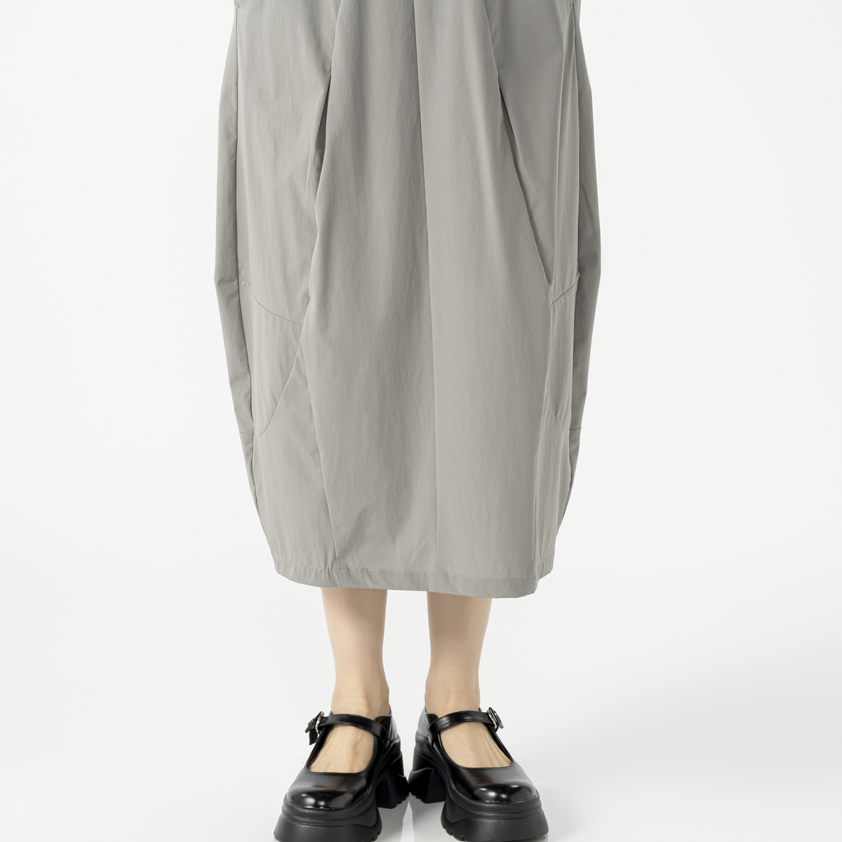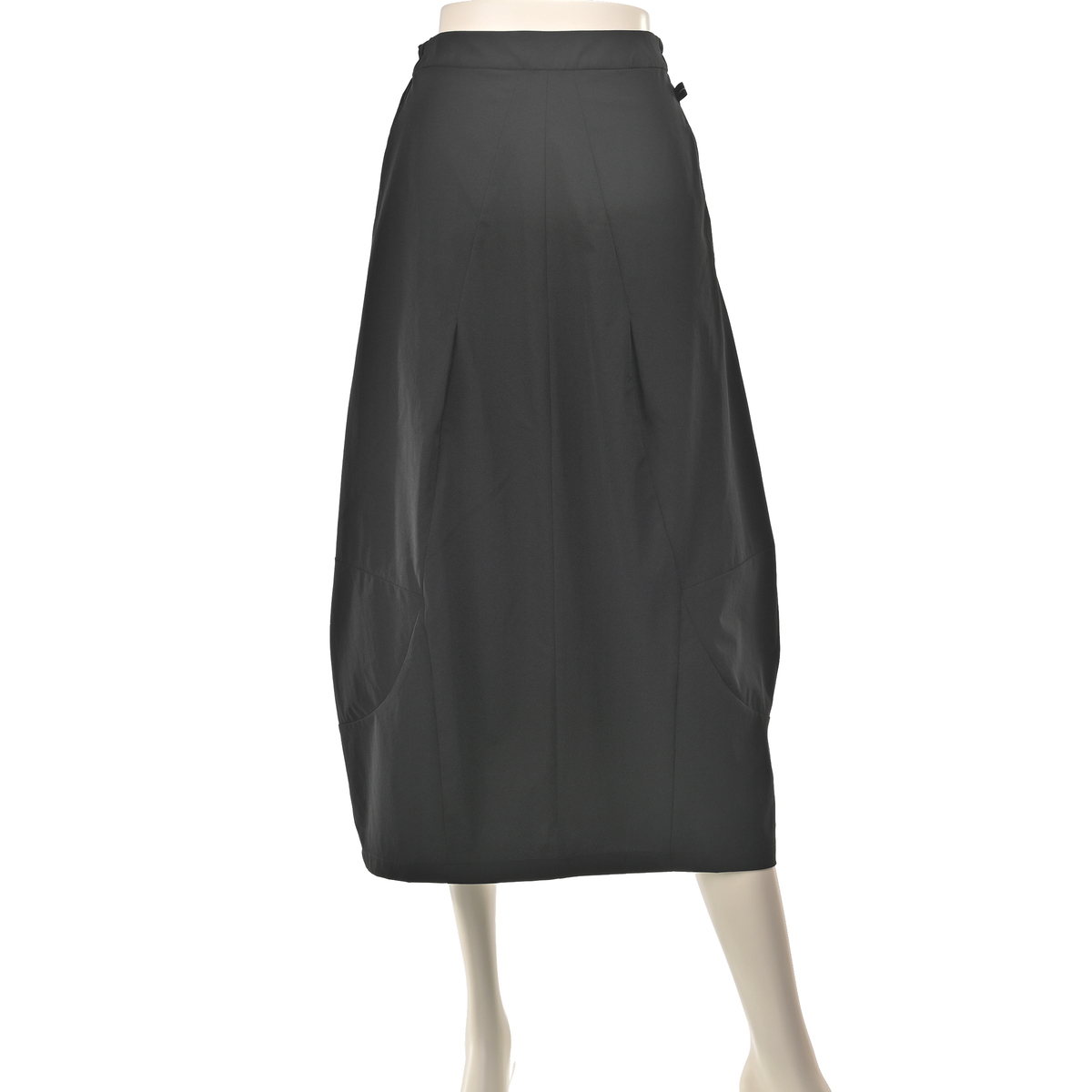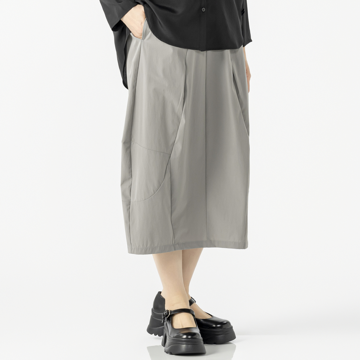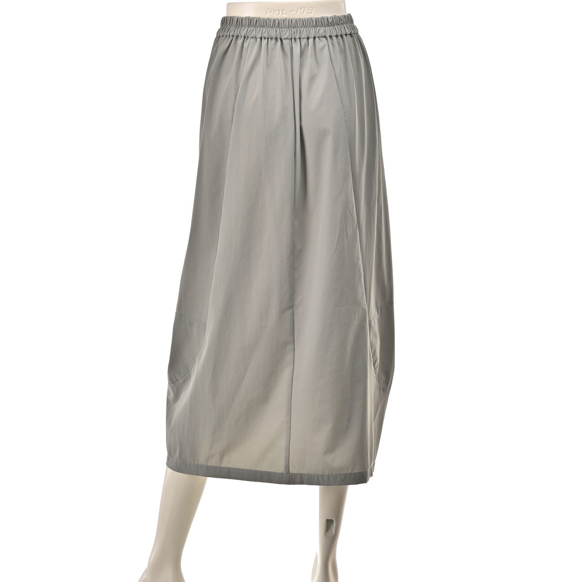 独特のコクーンシルエットがお洒落なスカート。裾の切り替え角度がデザインポイントで、穿くと立体的なラインが際立ちます。左右脇にポケットを備え、ウエストは後ろ全体がゴム仕様で快適な着用感です