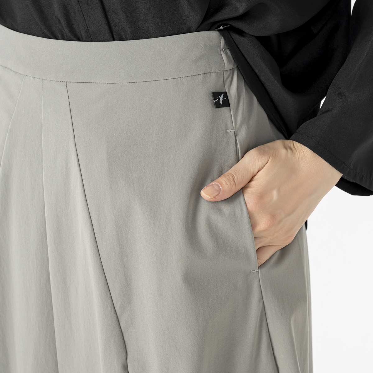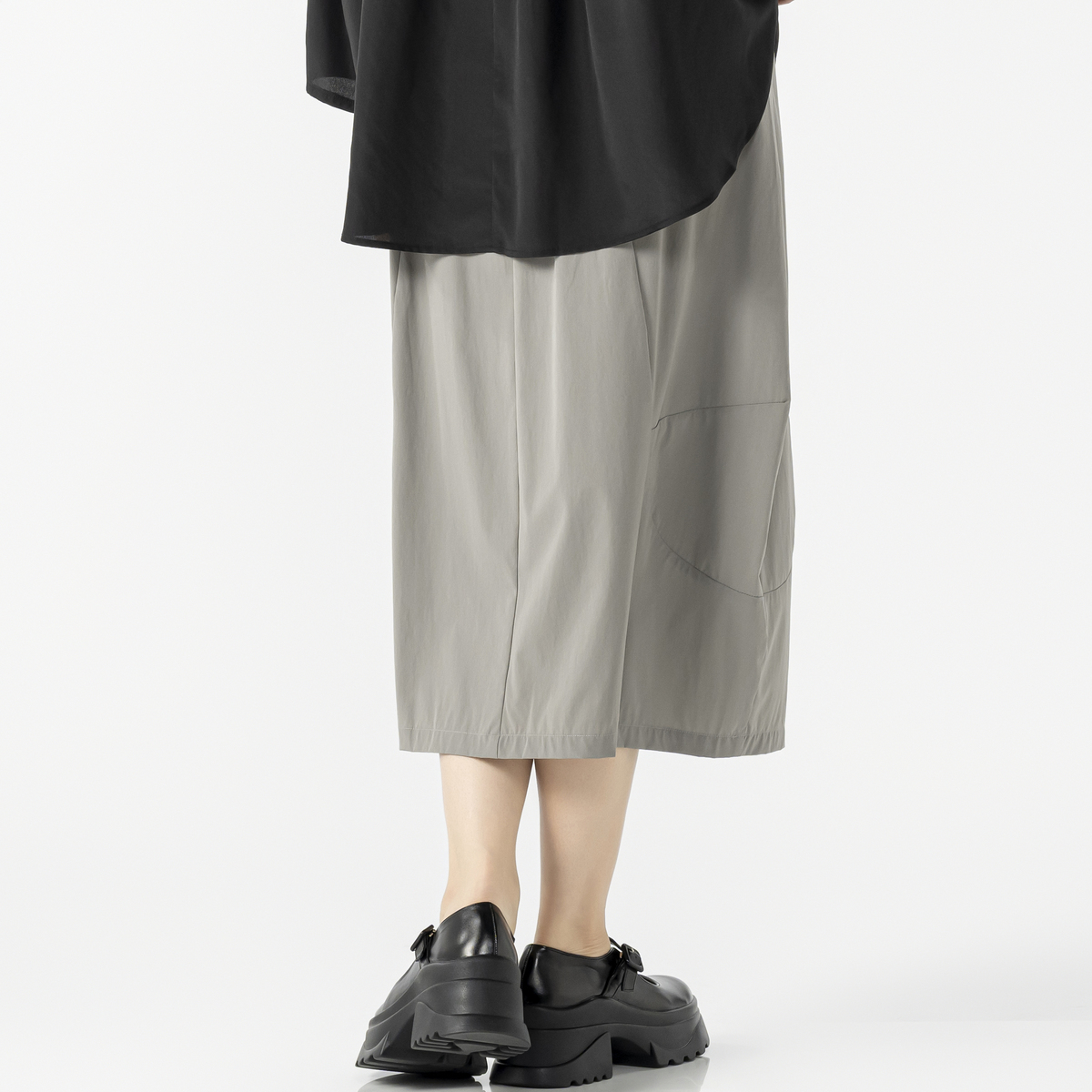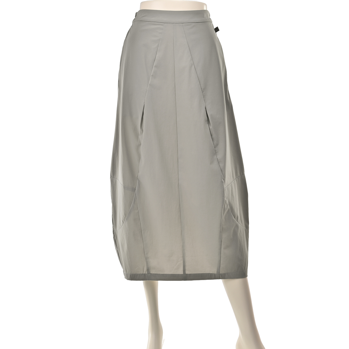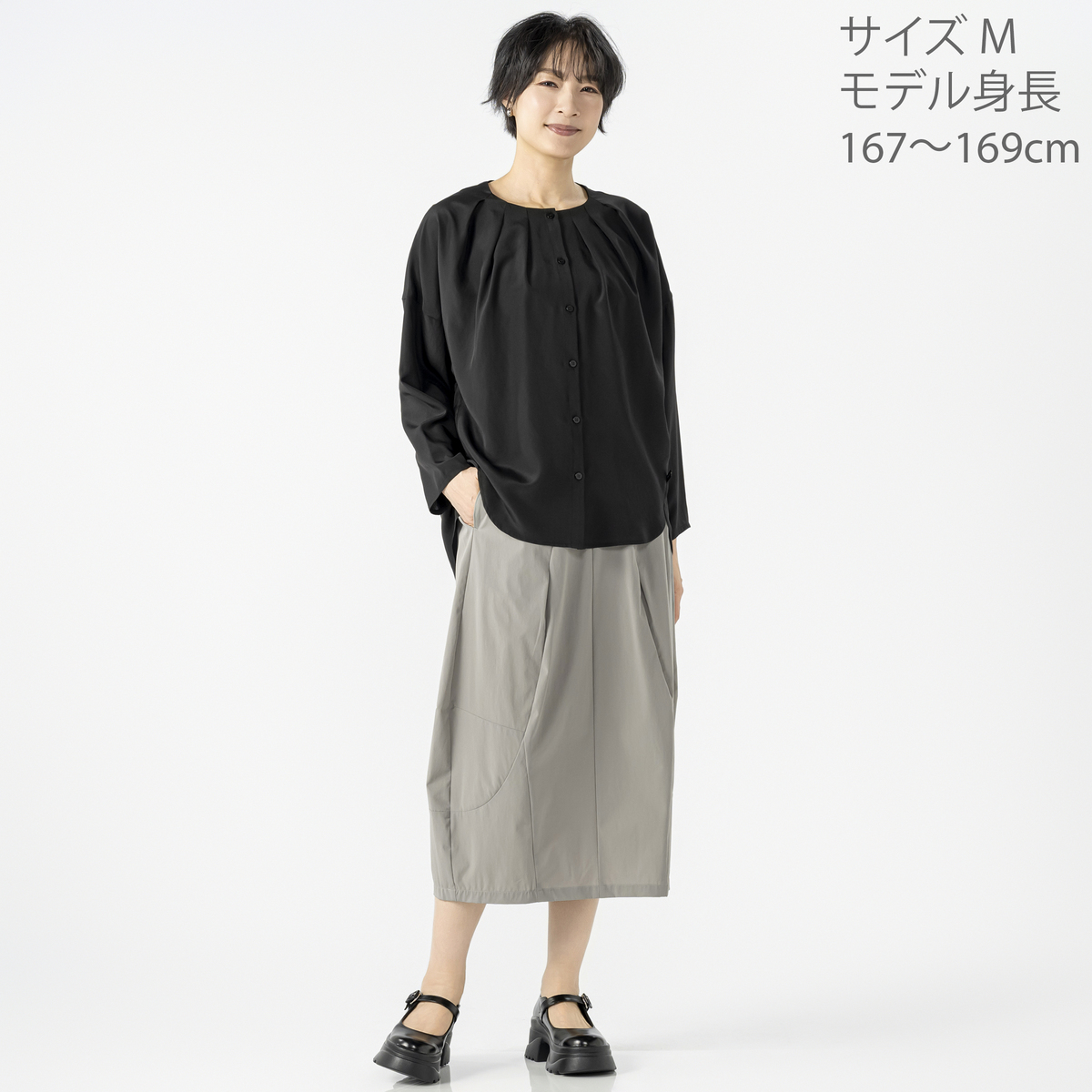 独特のコクーンシルエットがお洒落なスカート。裾の切り替え角度がデザインポイントで、穿くと立体的なラインが際立ちます。左右脇にポケットを備え、ウエストは後ろ全体がゴム仕様で快適な着用感です