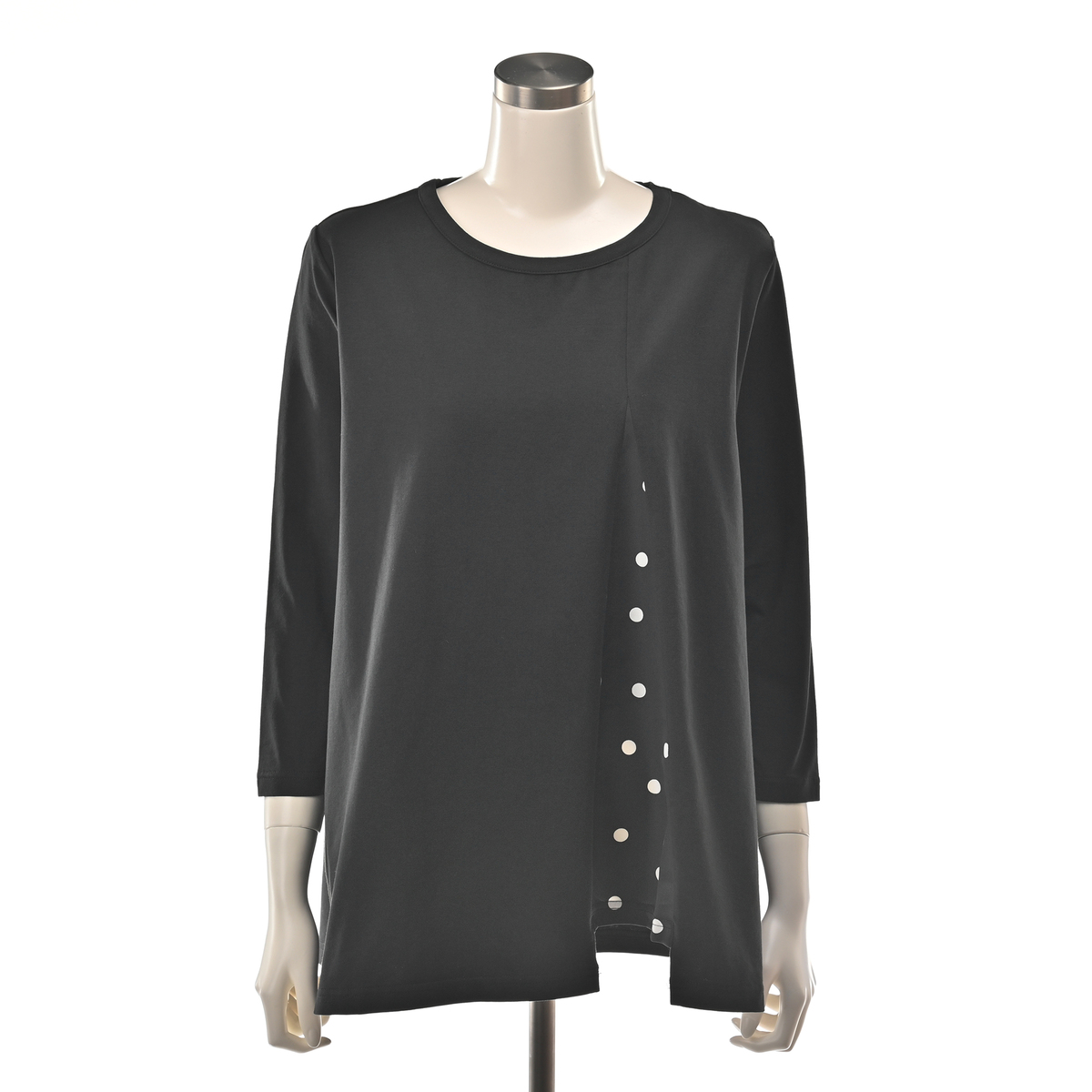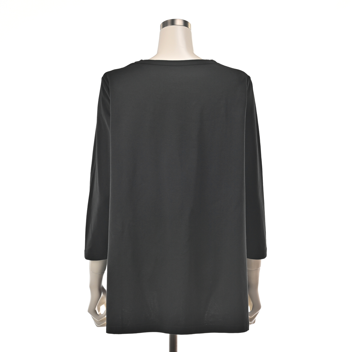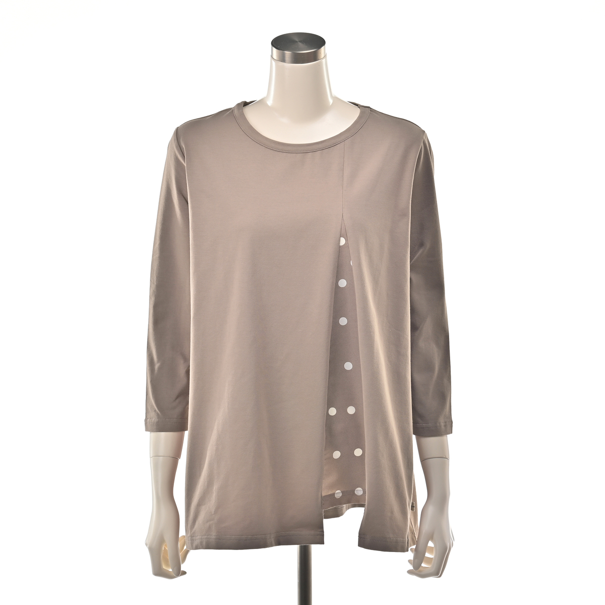 [商品寸法(ヌード)cm] サイズ バスト 着丈 肩幅 袖丈 M:106(81〜89) 66 38 45 L:112(88〜96) 67 39 46 LL:118(95〜103) 68 40 47 3L:126(102〜110) 69 41 48 [素材] 本体:綿 92%、ポリウレタン 8% 別布:ポリエステル 100% [お手入れ] 洗濯機洗い可 [注意事項] ※商品寸法の誤差は多少発生します。ご了承下さい ※洗濯後はすぐに脱水し、形を整えて干して下さい。長時間、水につけたままにしないで下さい ※デリケートな素材を使用していますので、爪やアクセサリーなどの引っ掛かりによりキズがつきやすくなっております。縫目や生地を強く引っ張らないよう注意して下さい ※素材の特性上、着用や洗濯・クリーニング時の摩擦により毛羽立ち、毛玉が発生します。その際はお早めに毛玉取り器等で手入れをして下さい ※濃色製品は着用中の摩擦により色移りすることがあります。また、雨や汗等で濡れた状態で着用すると色移りすることがあります。その際はお早めに洗濯をして下さい ※洗濯・クリーニングの際、色落ちすることがありますので他の物と分けて洗って下さい ※直射日光や蛍光灯の影響で変色することがありますのでご了承下さい ※過度な引っ張りを受けると縫い目が開くことがありますので、取扱いには注意して下さい ※この製品は生地の表面にプリントを施しています。生地の構造上、細かなひきつれが見られる場合がありますが、製品の特徴としてご理解下さい ※強い力が加わると細かなひきつれや、糸返りによる筋が発生します。摩擦や引っ掛かりにご注意下さい 【中国製】