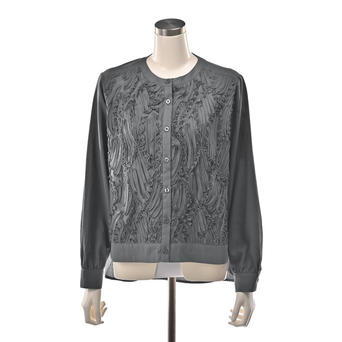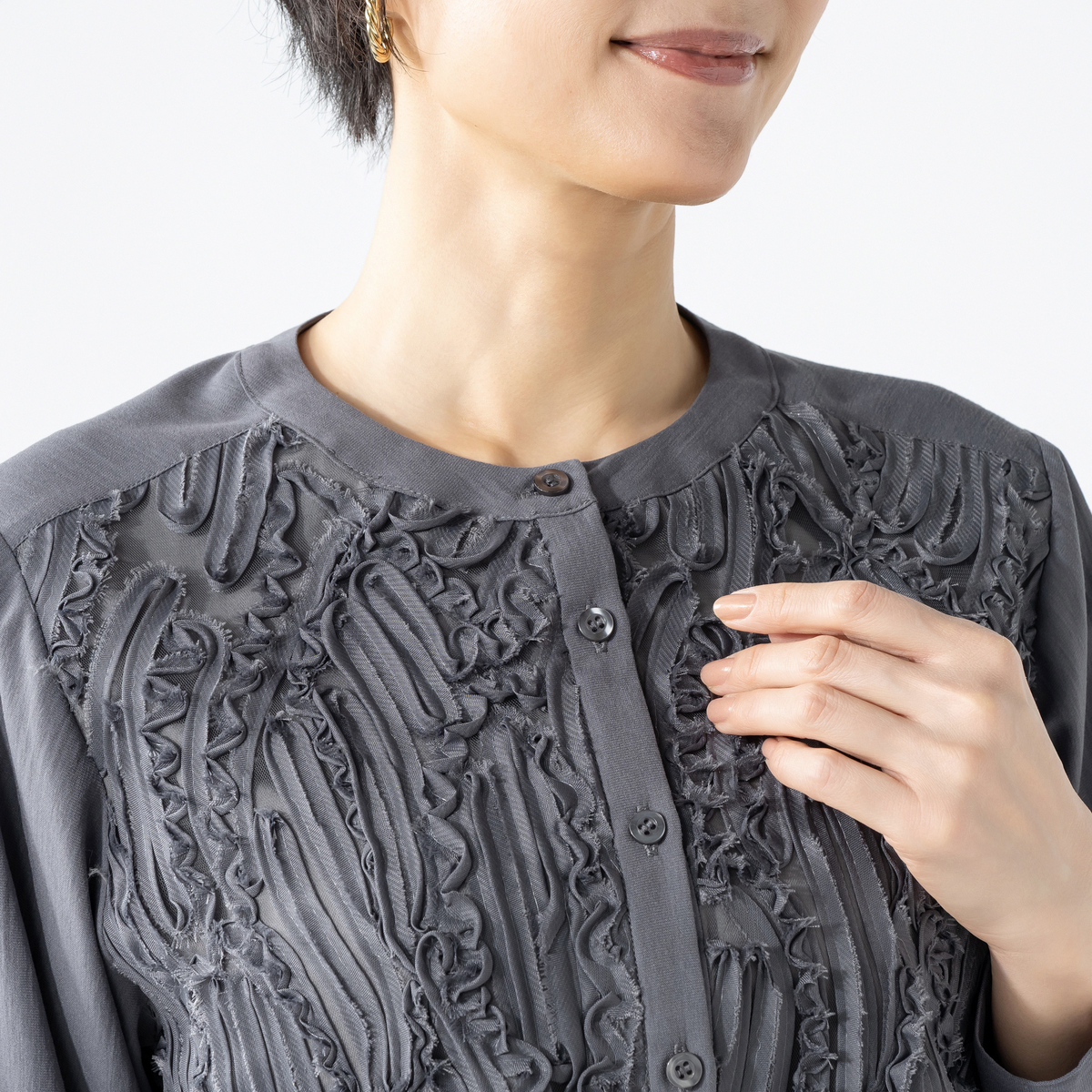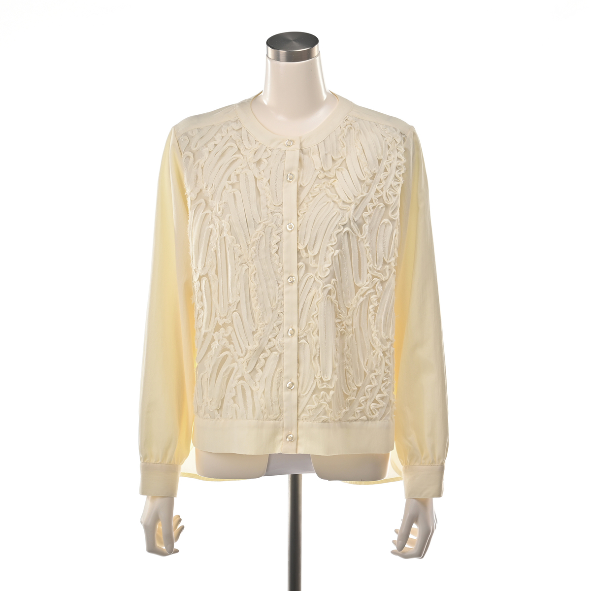 前身頃にレース生地を切り替えたノーカラーのシャツブラウスです。シフォンのリボンをあしらったチュールレースは、間に透け感があって柔らかく、無地部分は微光沢のある素材で、さりげない華やかさを添えます