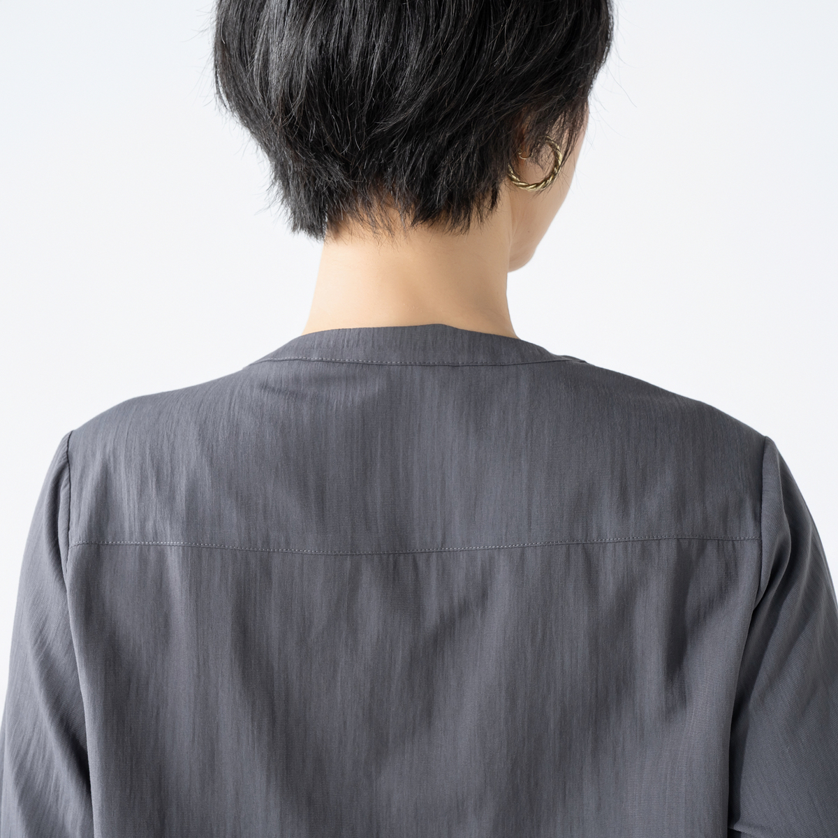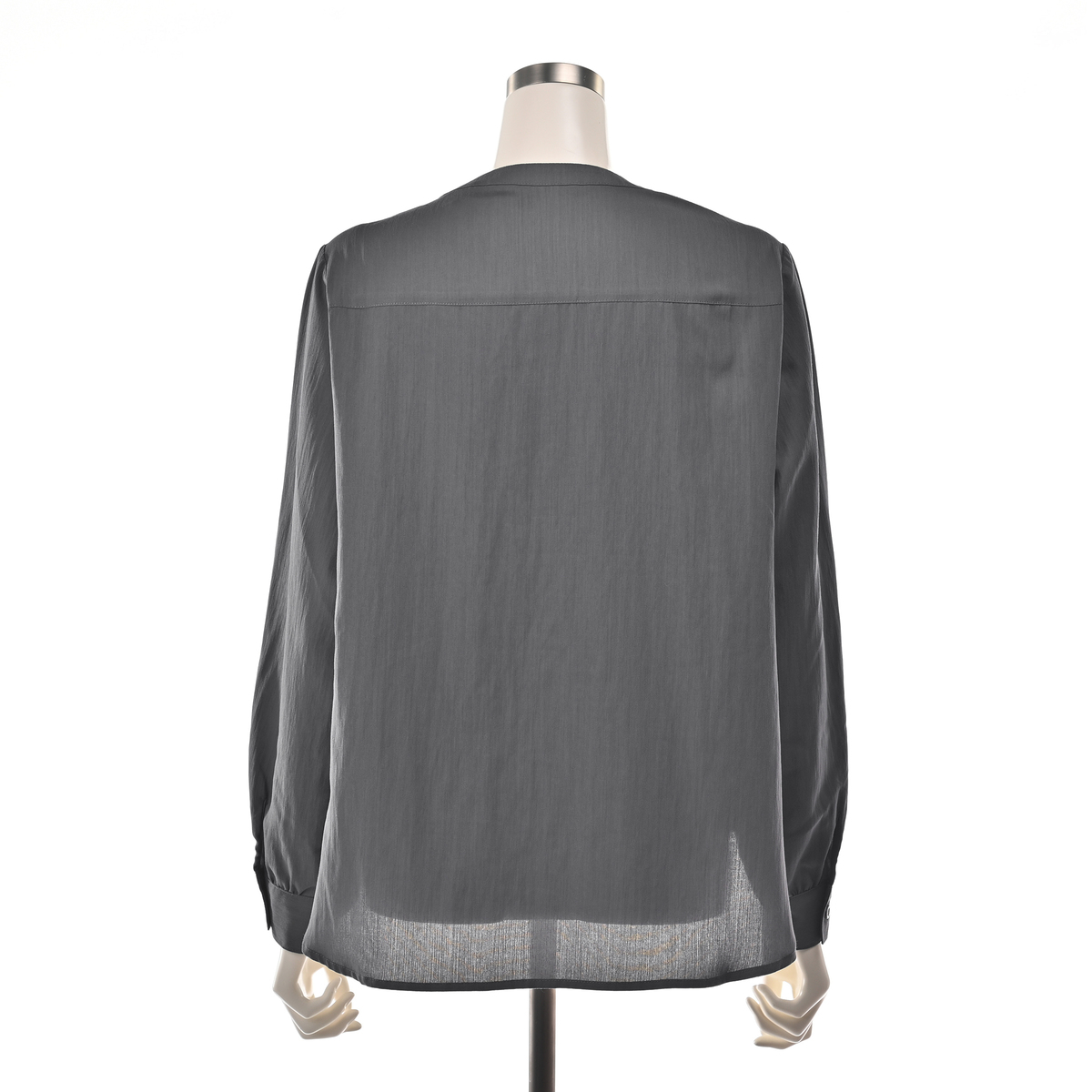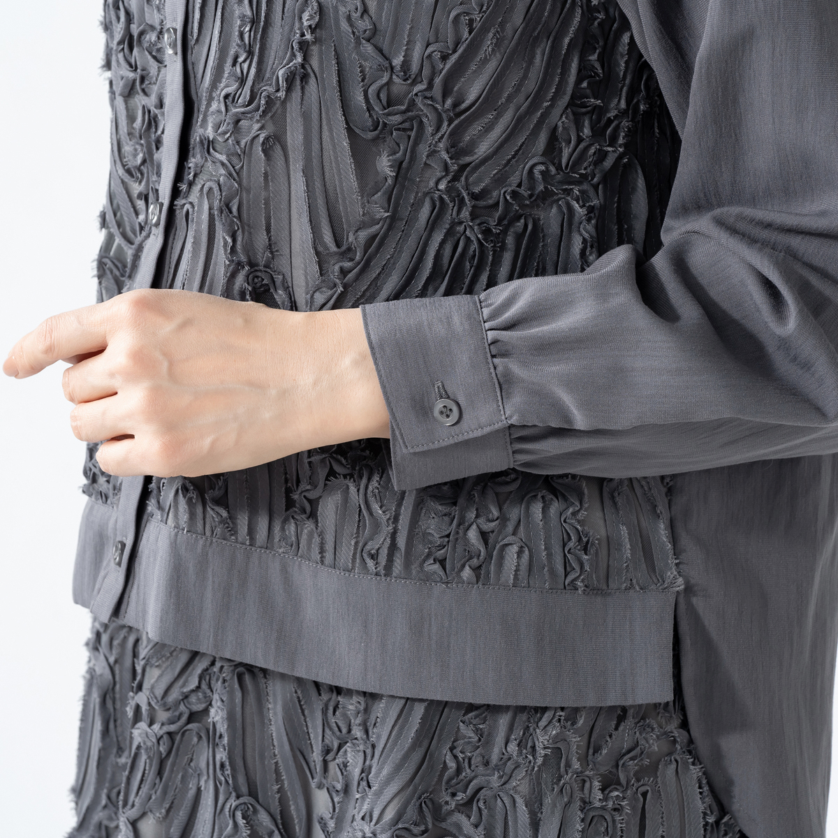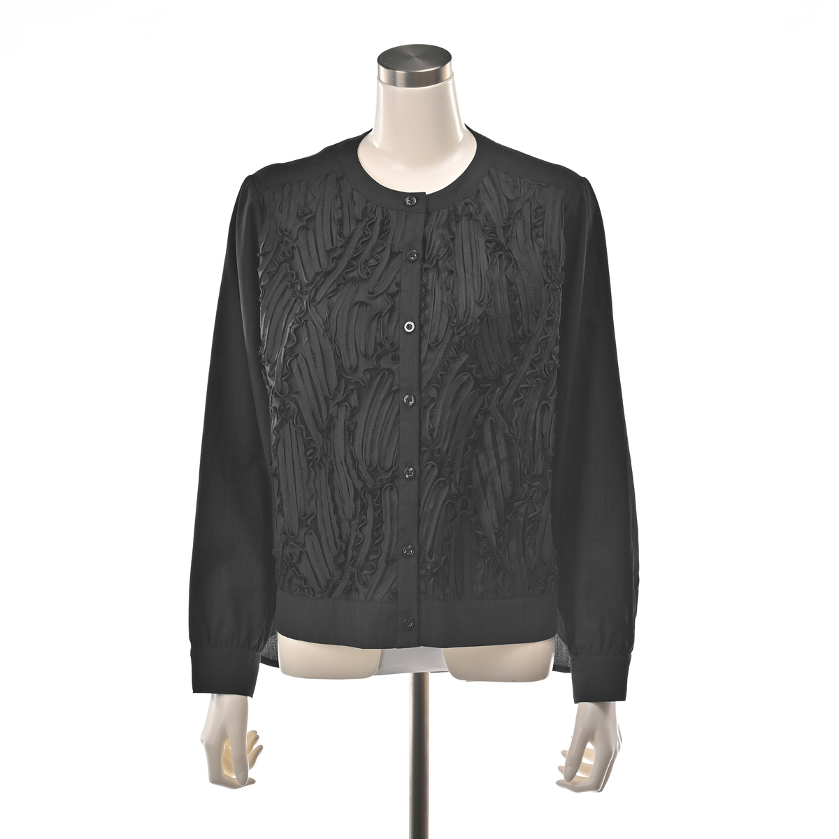 前身頃にレース生地を切り替えたノーカラーのシャツブラウスです。シフォンのリボンをあしらったチュールレースは、間に透け感があって柔らかく、無地部分は微光沢のある素材で、さりげない華やかさを添えます