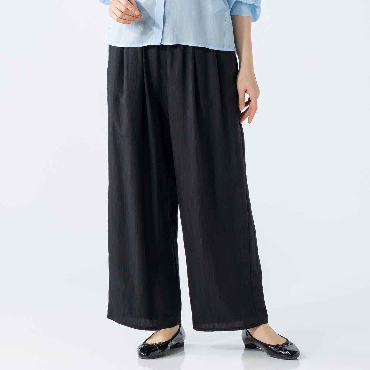 ウエストにタックとギャザーを取り入れたワイドパンツです。腰まわりをカバーしながら脚をまっすぐきれいに見せるワイドシルエット。プルオン仕様で着脱も簡単です