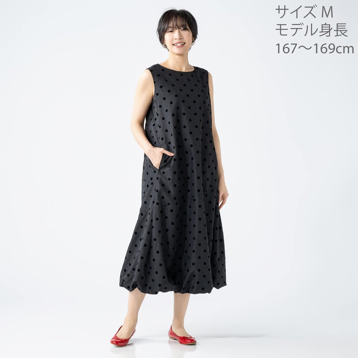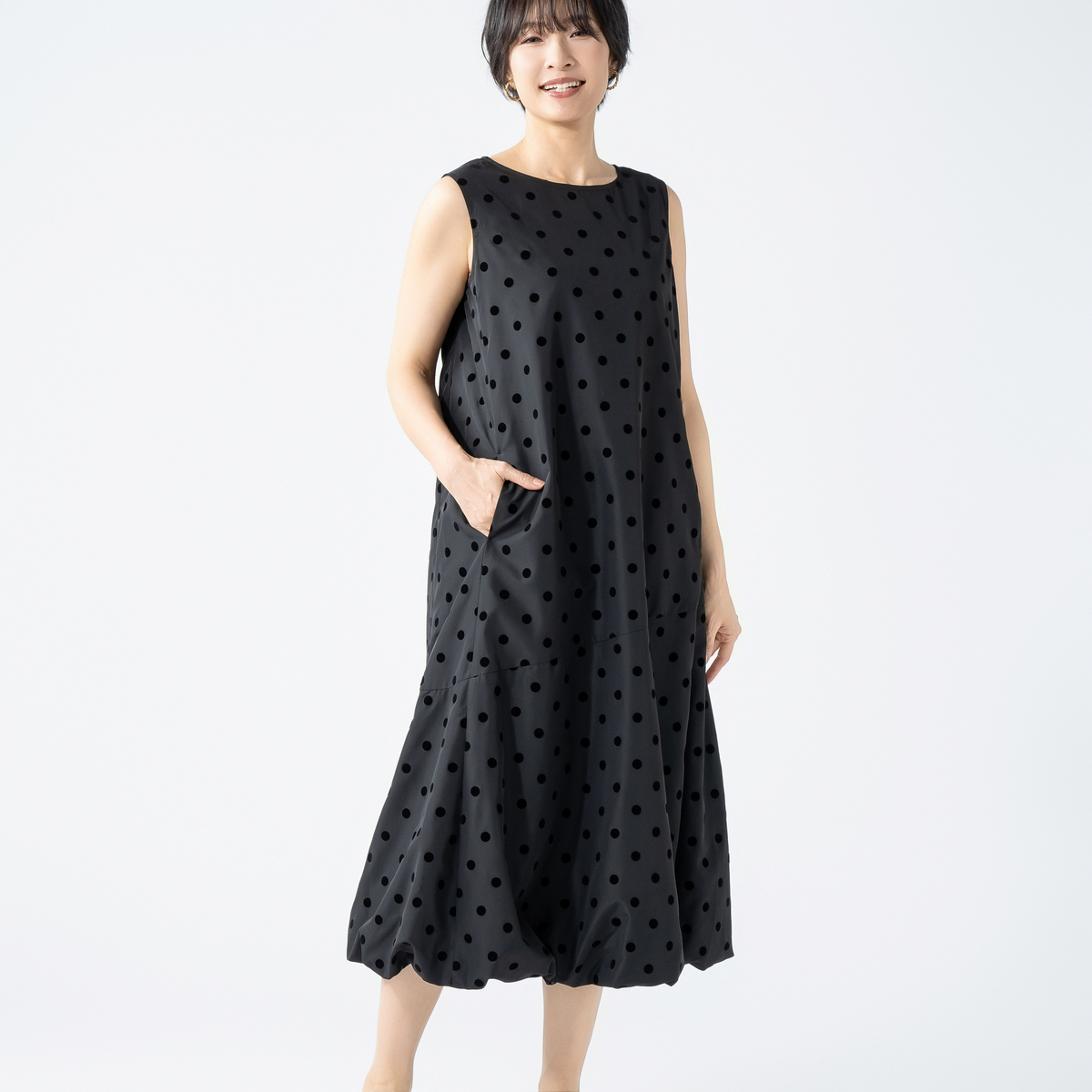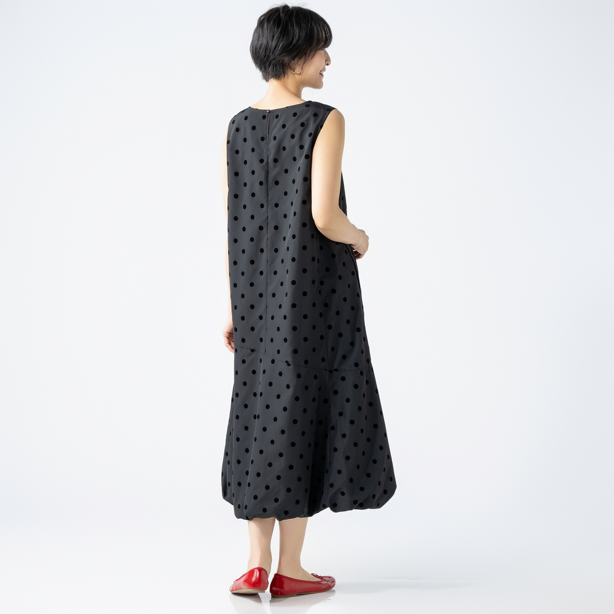 ノースリーブ仕様で一枚でも重ね着でも楽しめます。水玉が甘くなりすぎず大人の装いに程よい遊び心を添え、普段使いからお出かけまで活躍します