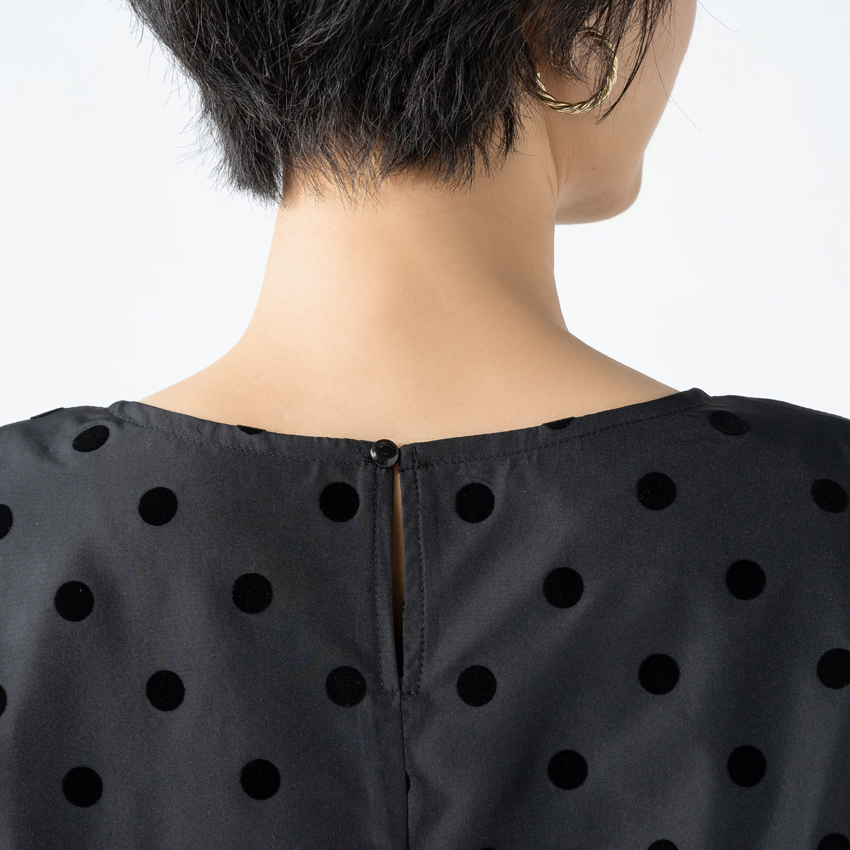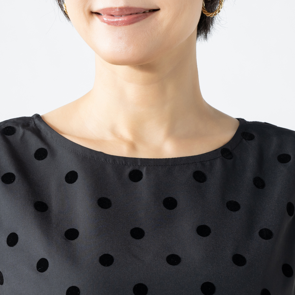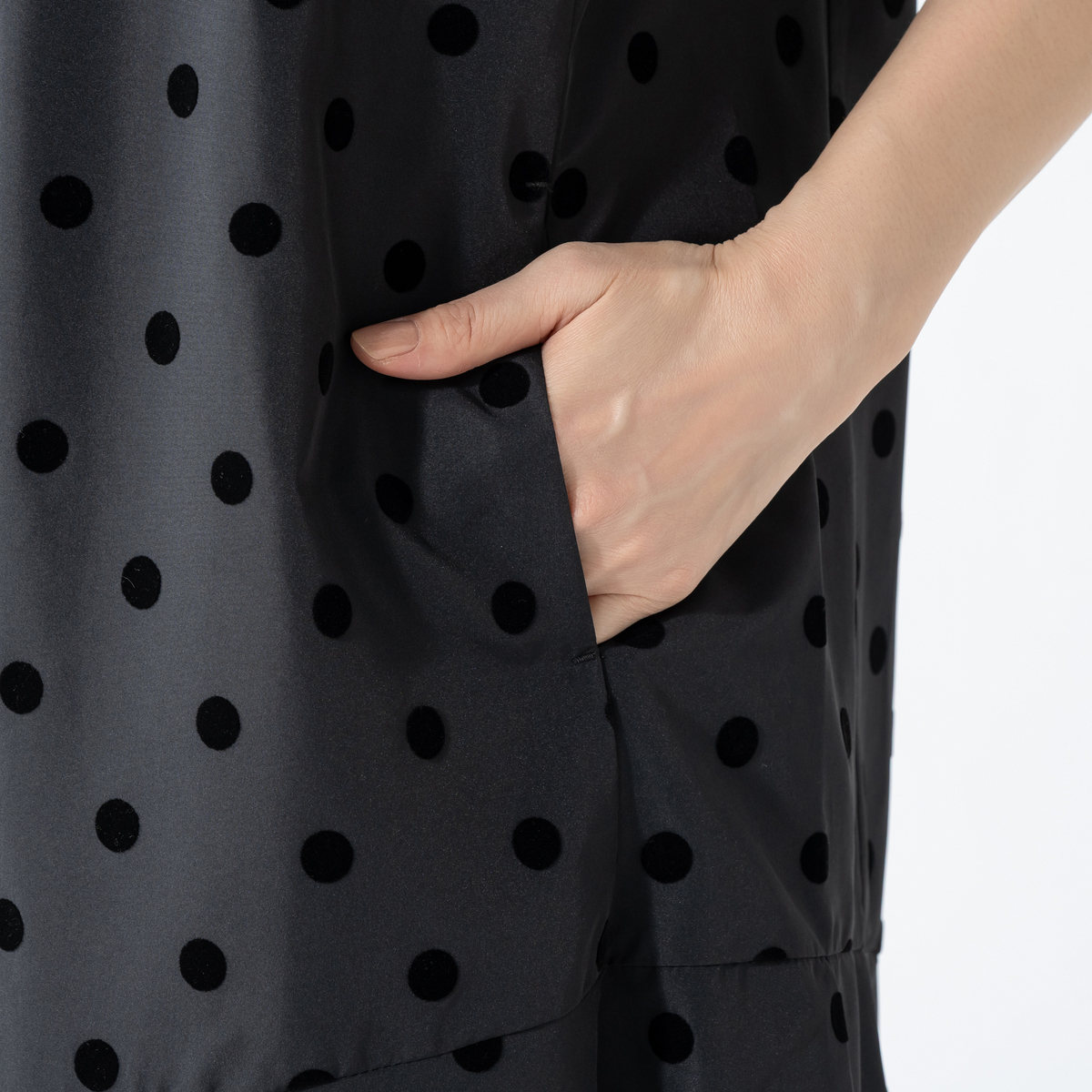 ノースリーブ仕様で一枚でも重ね着でも楽しめます。水玉が甘くなりすぎず大人の装いに程よい遊び心を添え、普段使いからお出かけまで活躍します