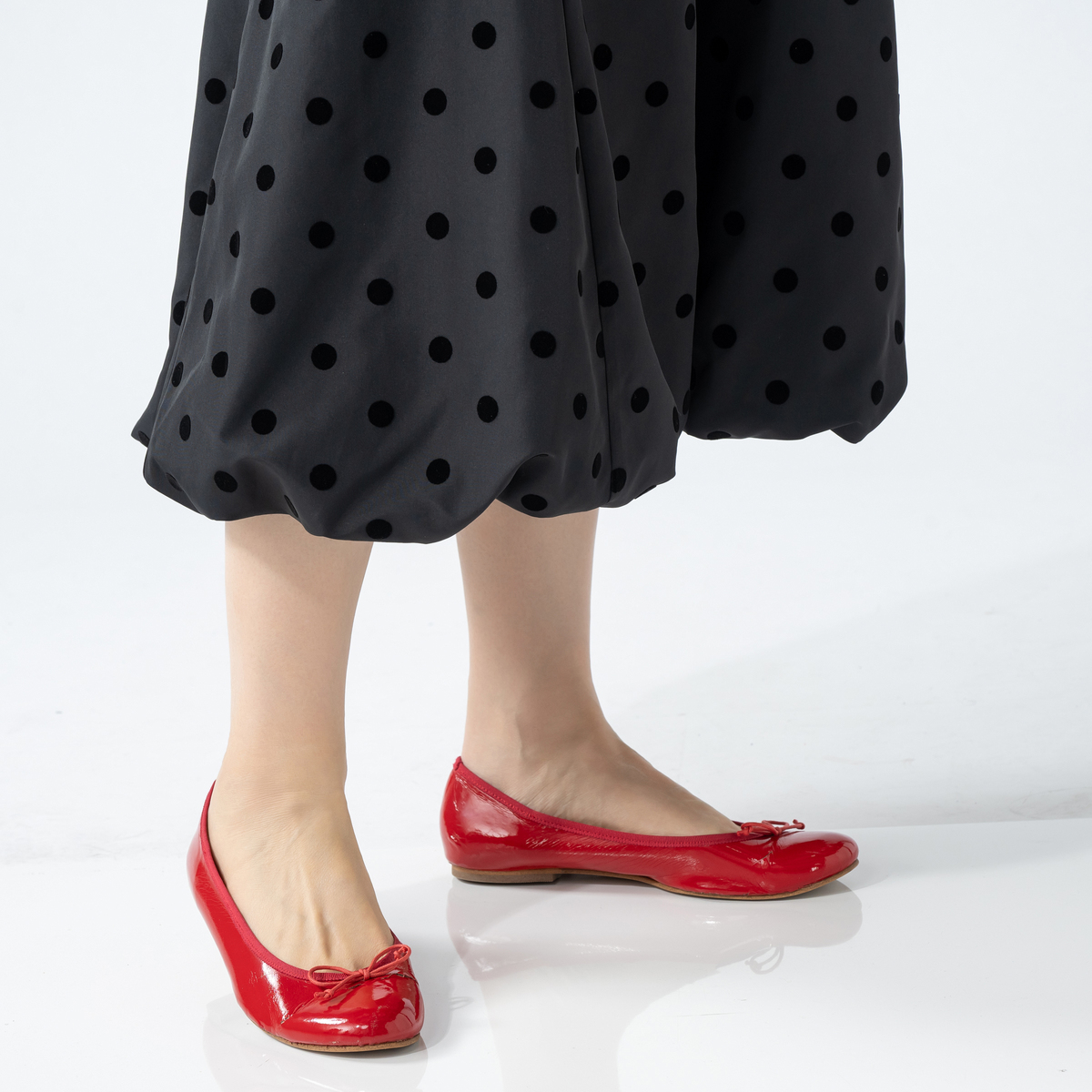軽くて薄いベース生地にフロッキードットをあしらったバルーンジャンスカです。裾のバルーン部分からふんわり広がるシルエットで、落ち感もちょうどよく、着る人の個性をさりげなく引き立てます