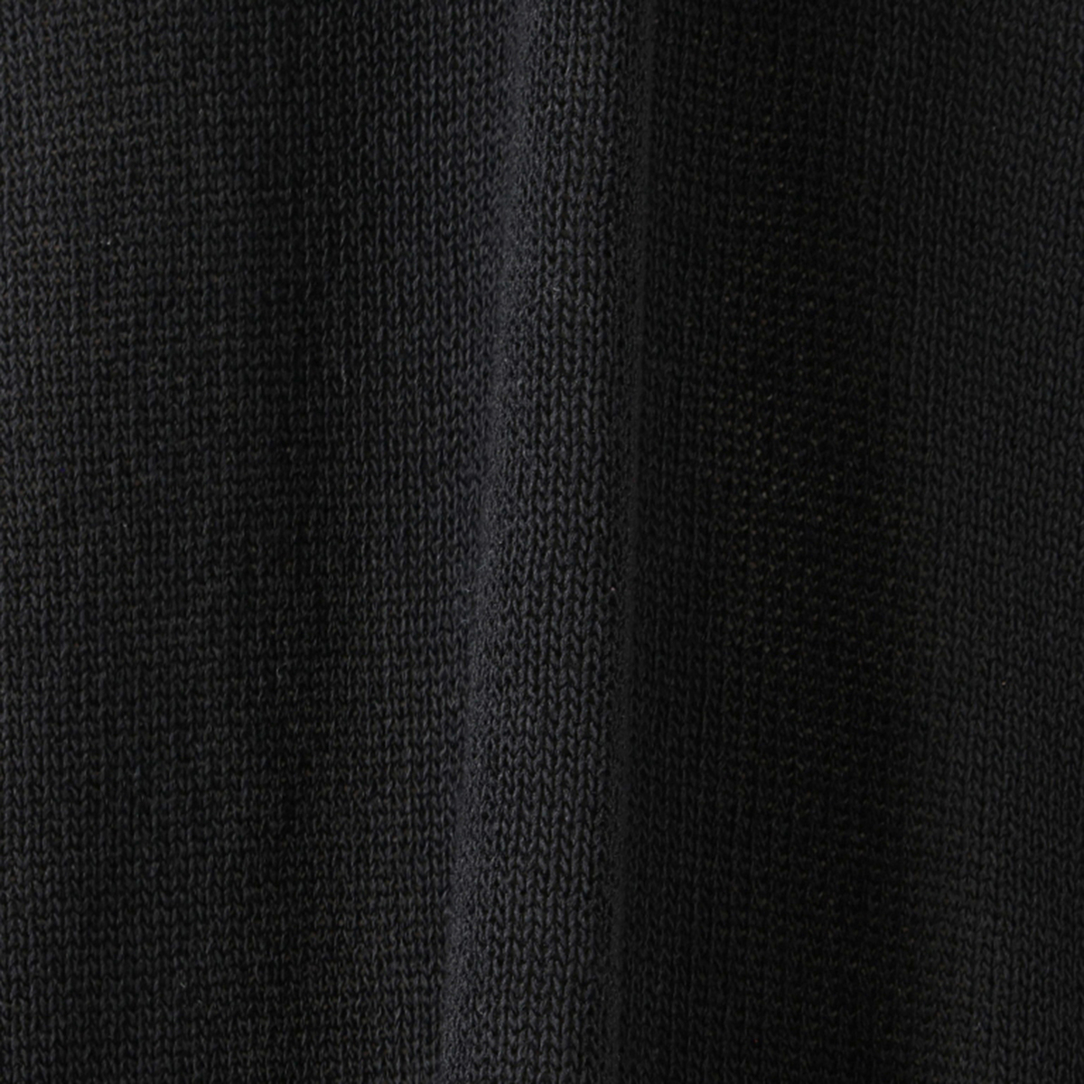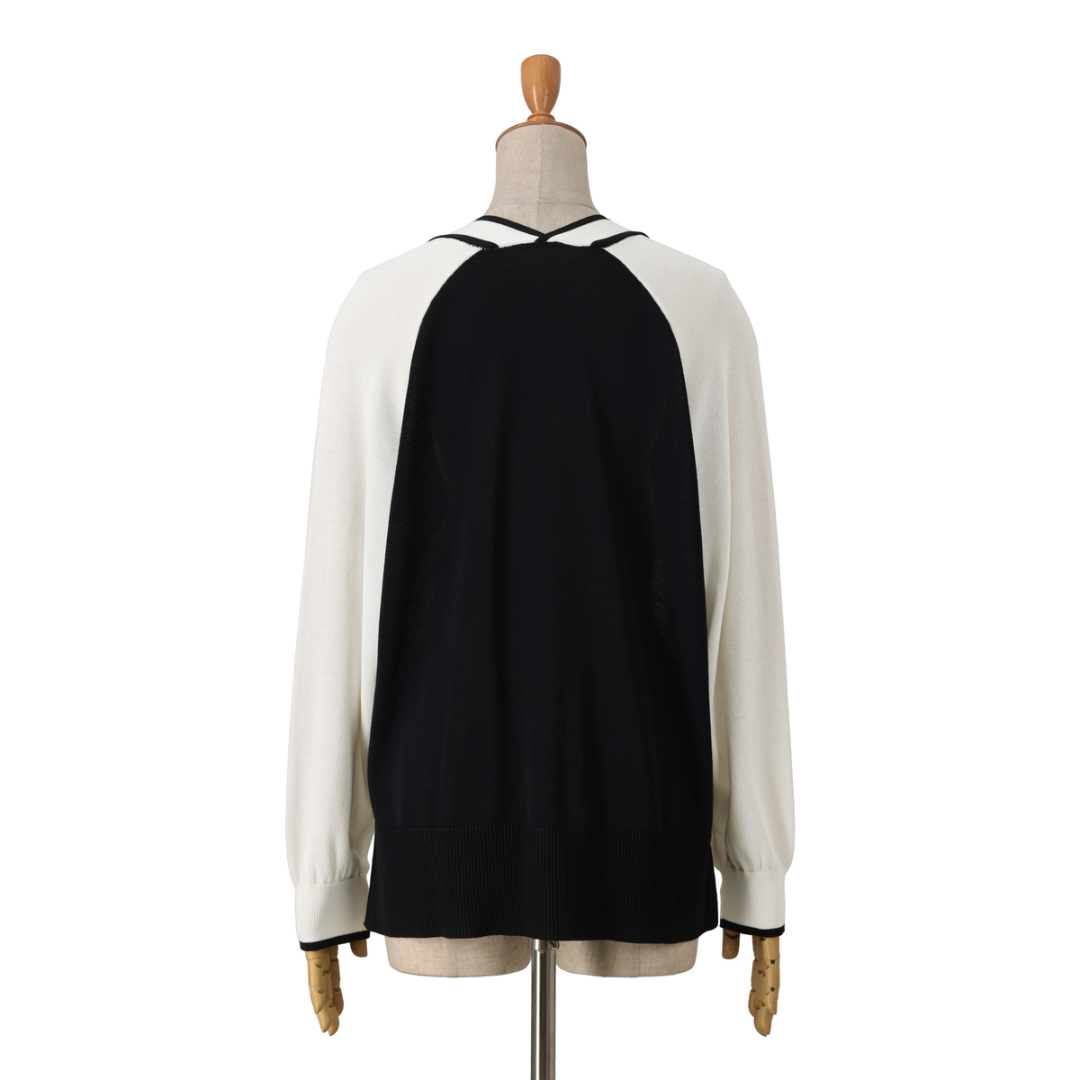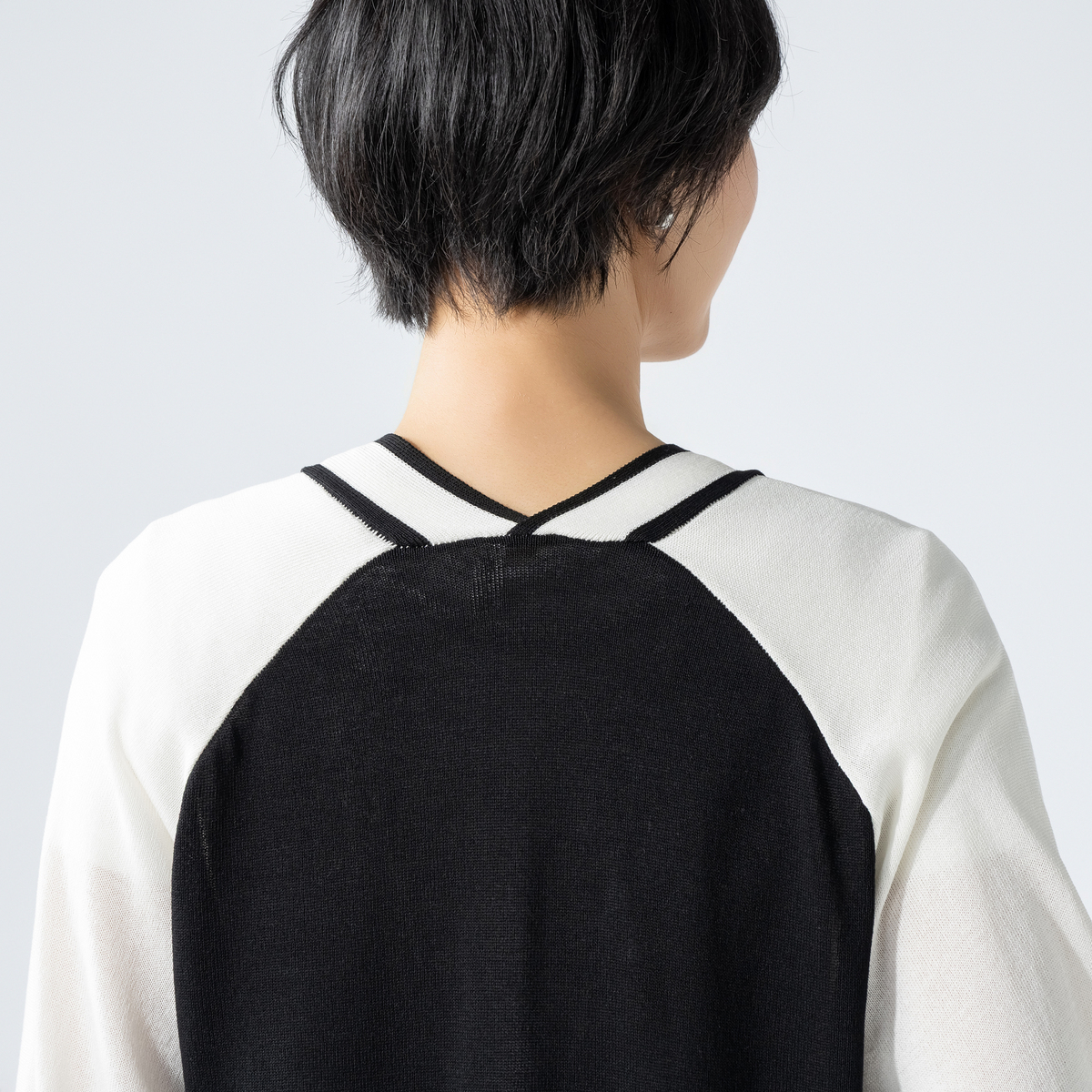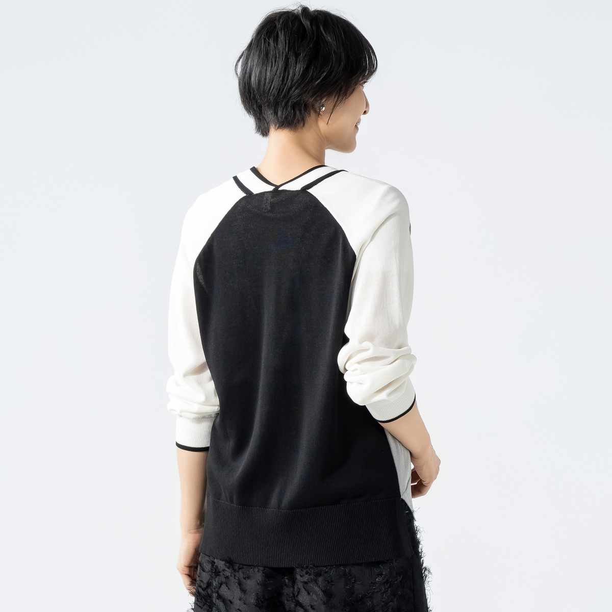 変形ラグランスリーブで、袖口はスパン入りのリブ編みで先端に細幅のラインを入れて引き締めた印象に。後ろ丈が長い前後差シルエットです