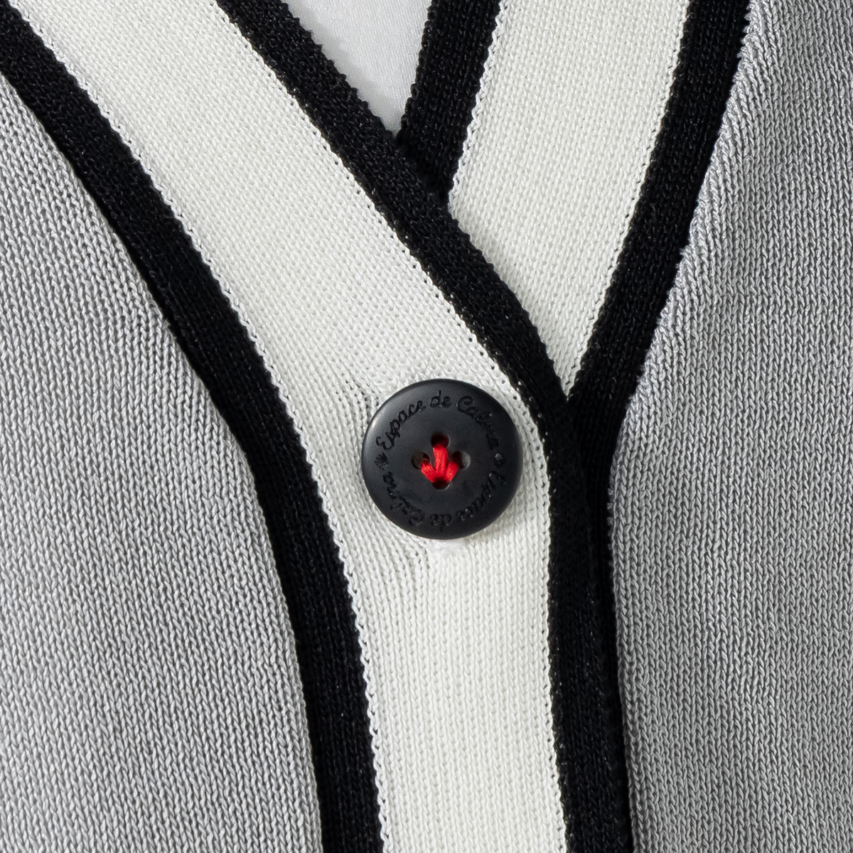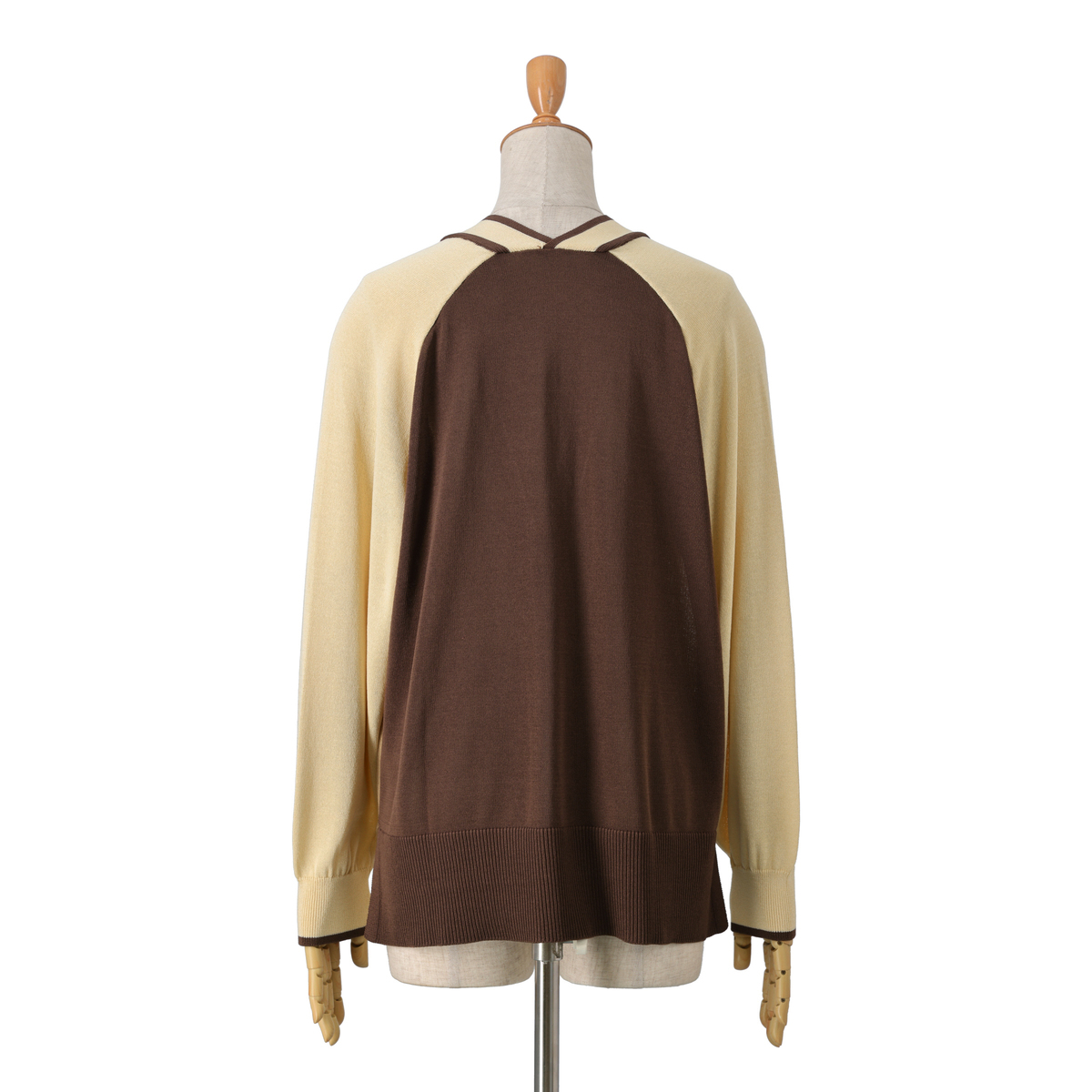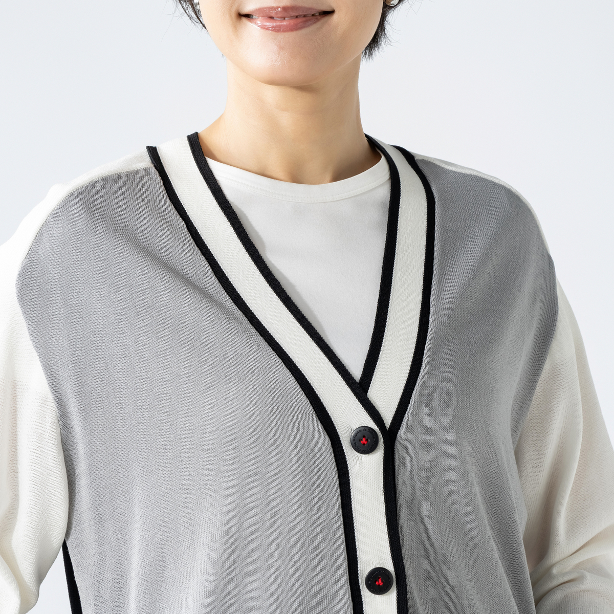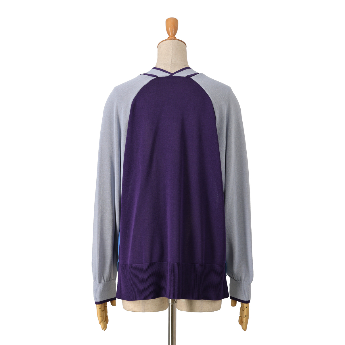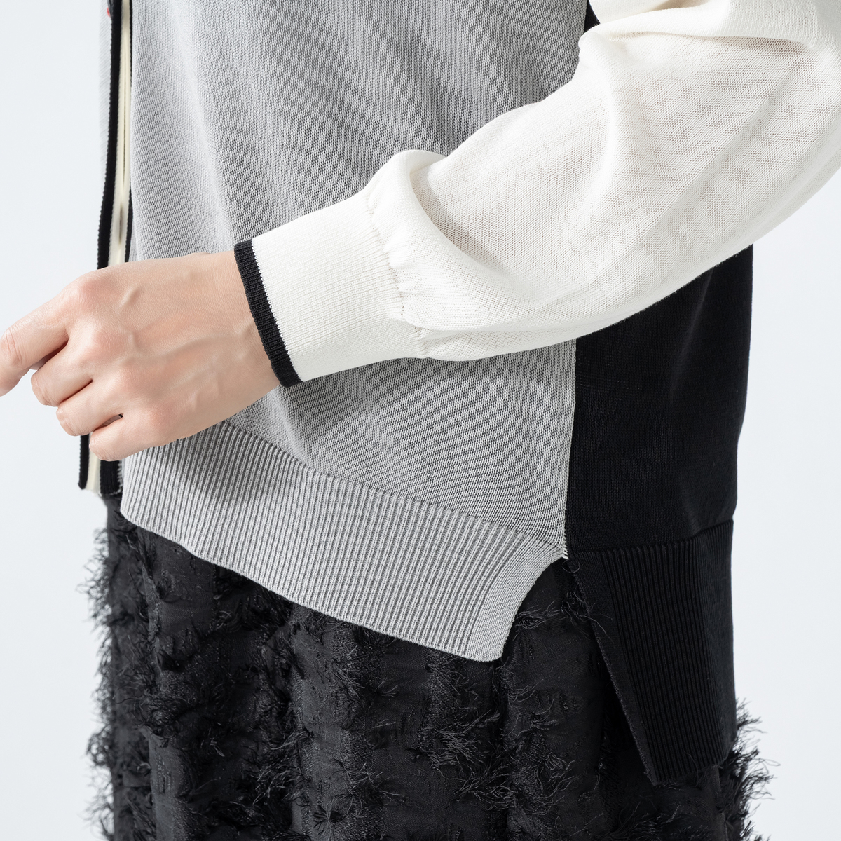 配色使いが印象的なカラーブロッキングデザイン。前後身頃と袖に3色を配し、部分的なラインで引き締めています。前後Vネックは前立ての配色で縦のラインを強調し、後衿ぐりの見え方にもこだわりました。細幅のライントリミングが全体をすっきり整えます