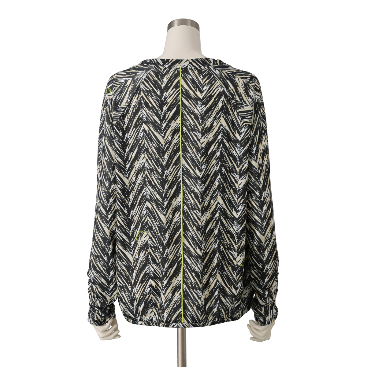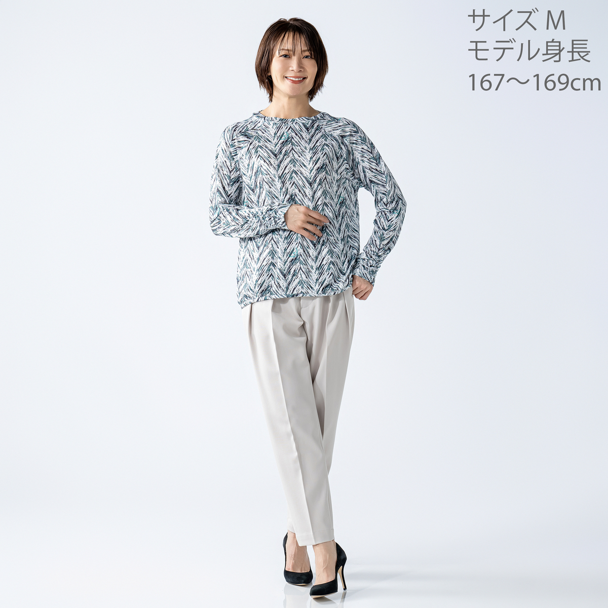 すっきりと見える傾斜にこだわったラグランスリーブが特徴。ゆとりを持たせた袖ぐりが上半身を軽やかに見せ、長めの裄丈はダーツとゴムシャーリングでくしゅっとした表情に。程よく体から離れるシルエットと前後差のある裾で、自然なラインに整います