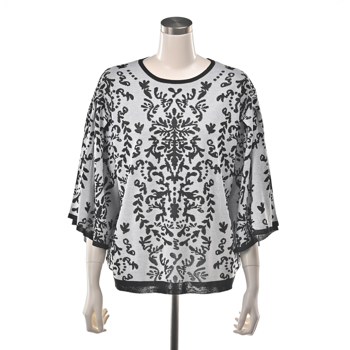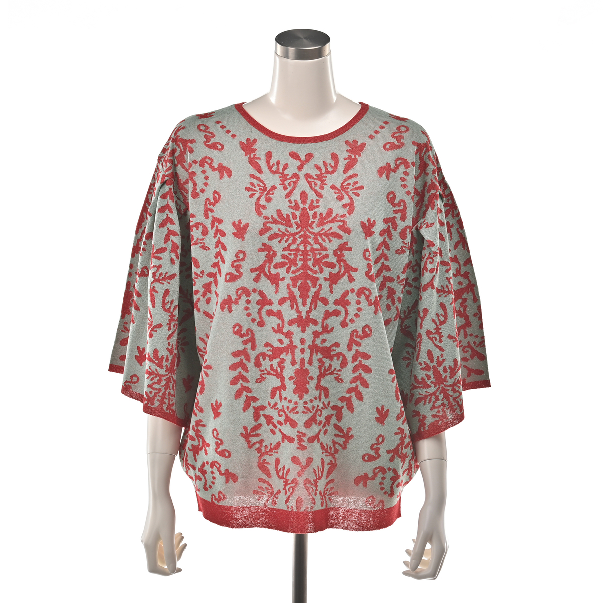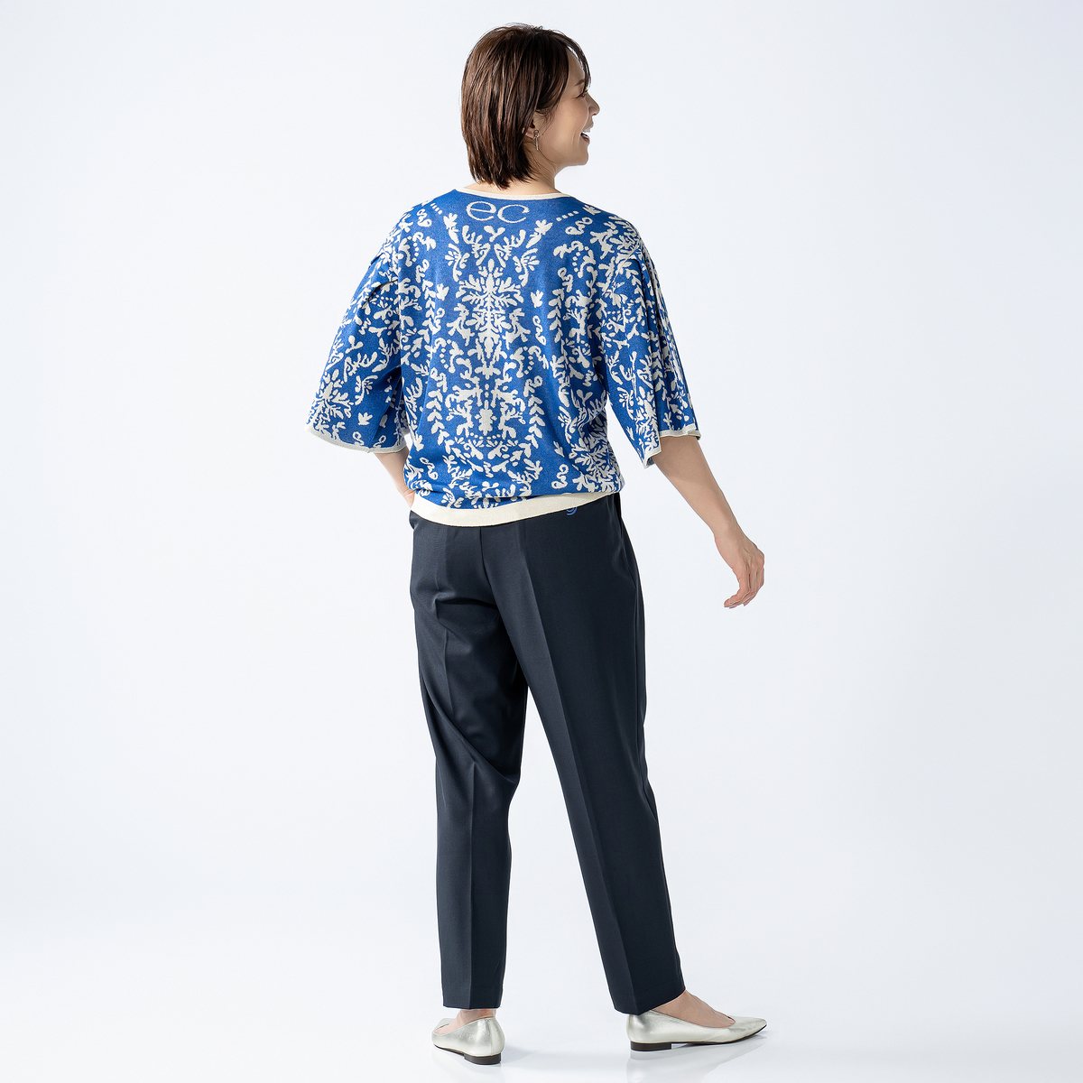 デザイナーによるダマスク柄のパネルジャガードは、中央のモチーフを取り囲むように、植物モチーフを左右対称に配置。衿ぐりは袋編みで仕上げ、後ろにはブランドロゴをさりげなく取り入れました。裾のタックがバルーン風のシルエットを作ります