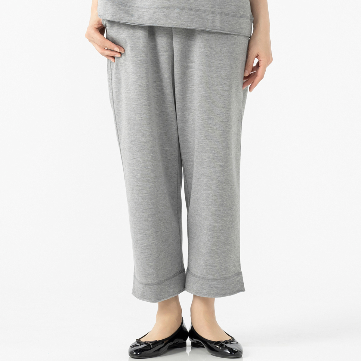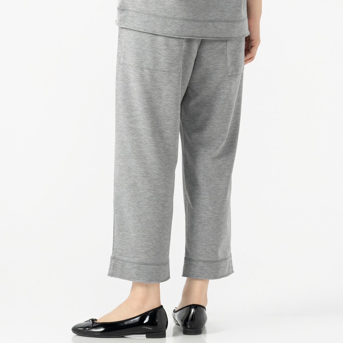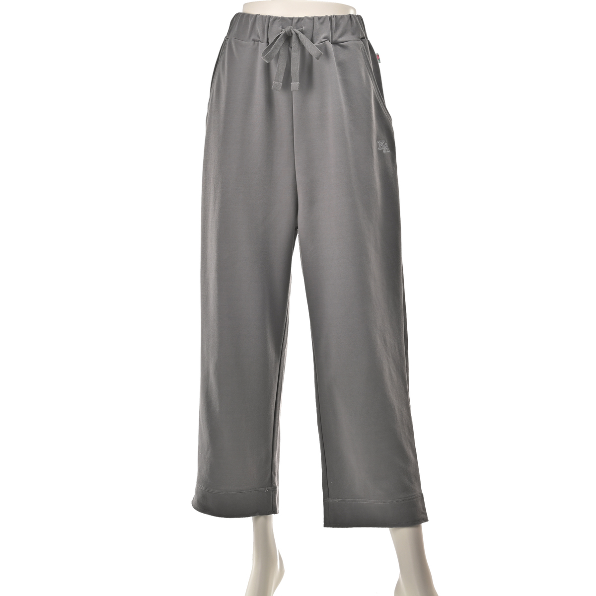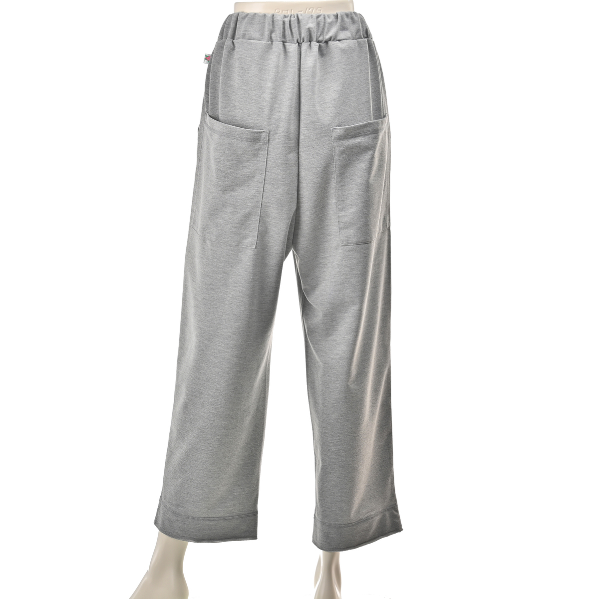 インレイ素材を使用したワイドパンツ。ベーシックなデザインで、ウエストは紐で調整可能です。軽く、肌触りにこだわった一本です