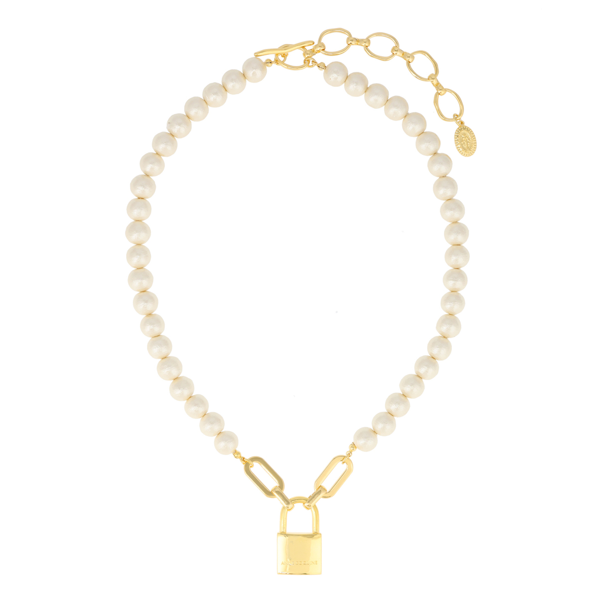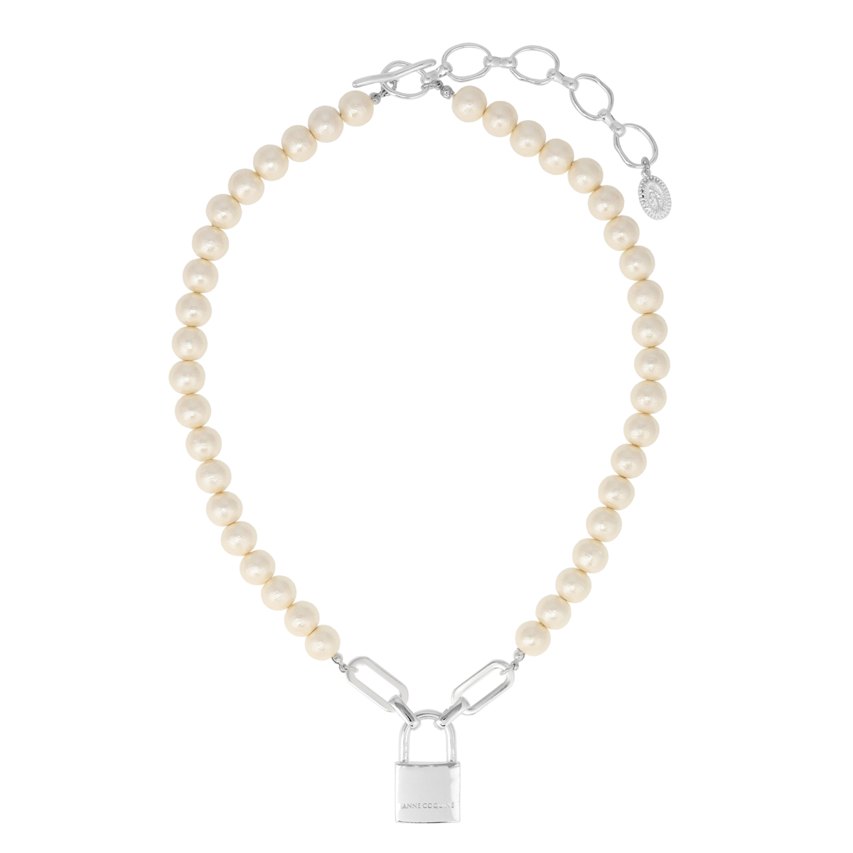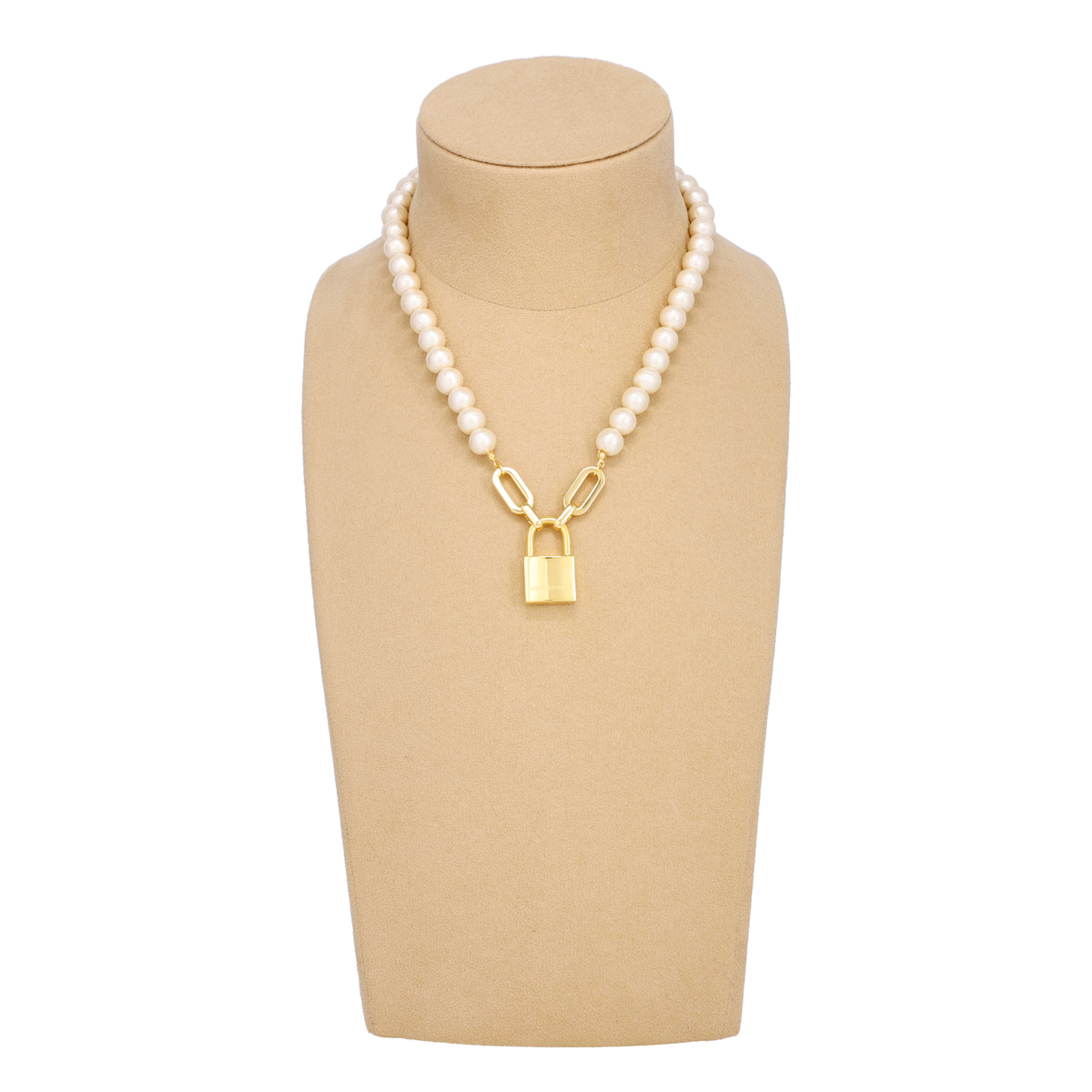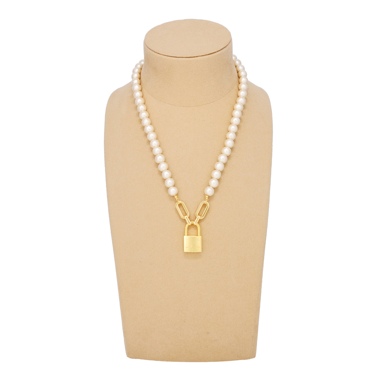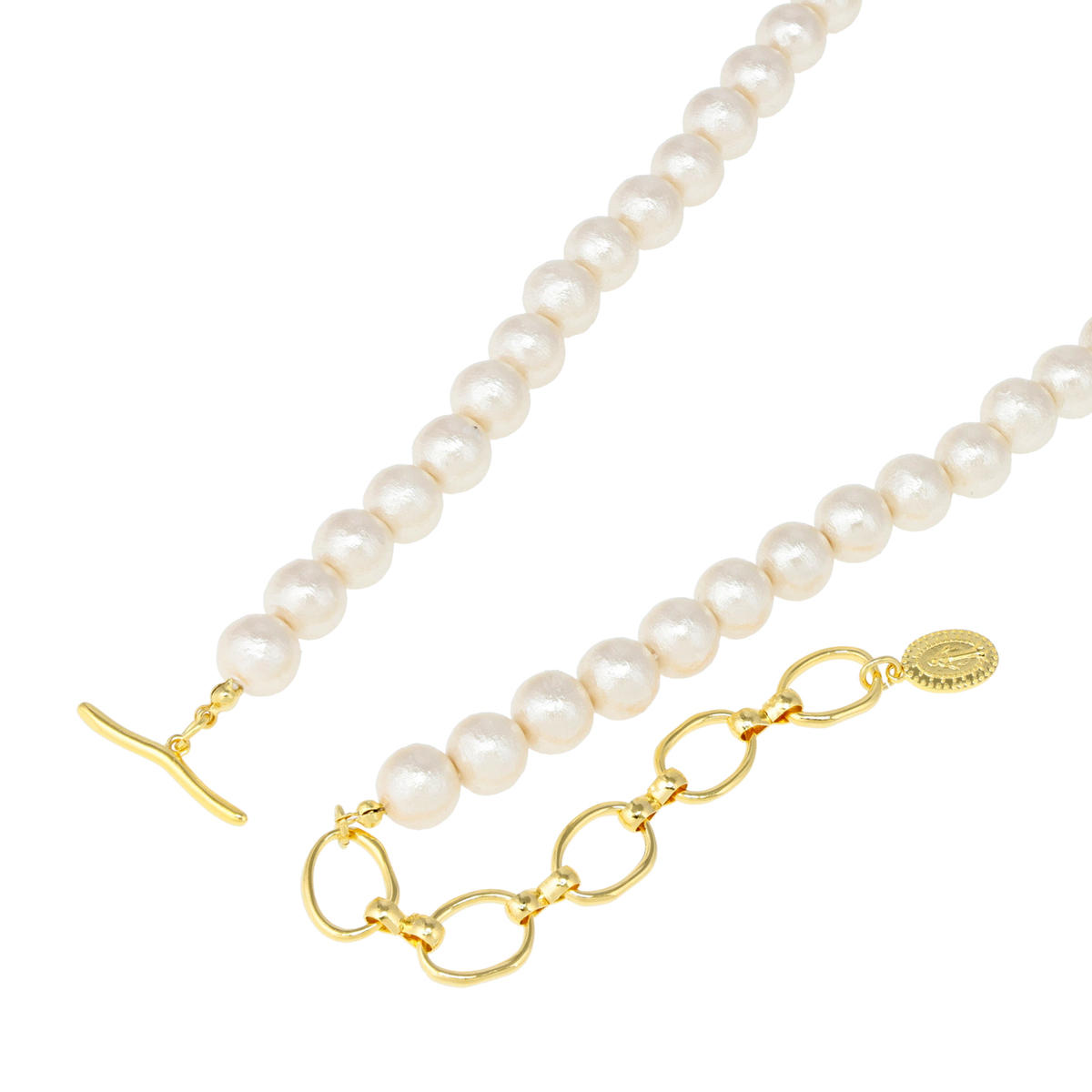 約10mmサイズのコットンパールを使用。アンコキーヌオリジナルデザインの南京錠(カデナ)を、ネックレスの中心に配してデザインしました。フェミニンなコットンパールにエッジの効いたチェーンと南京錠(カデナ)を組合わせ、甘くなりすぎない大人仕様に仕上げました