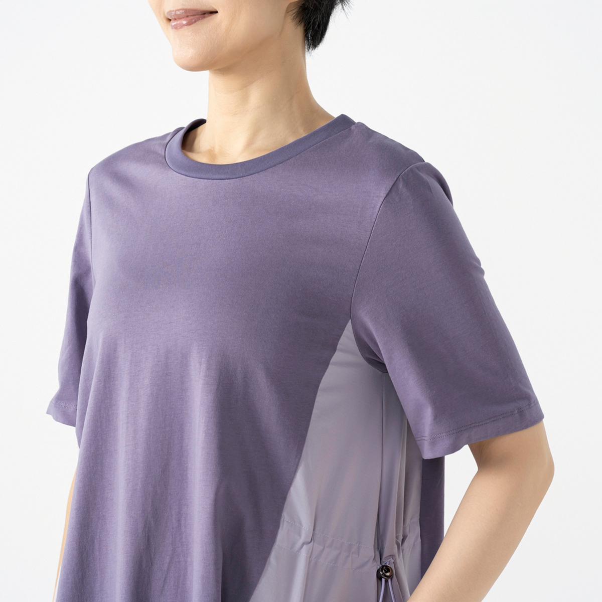 しっとりなめらかな着心地のAラインワンピース。エニワイズ加工で繊維に油脂分が含まれた、やわらかな風合いが魅力です。異素材を組合せた表情に、存在感のあるポケットが軽いアクセントを添える一着です