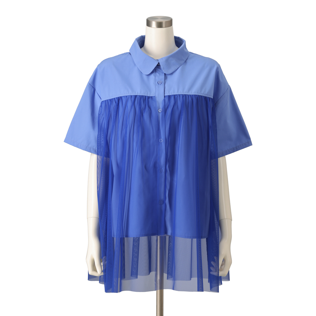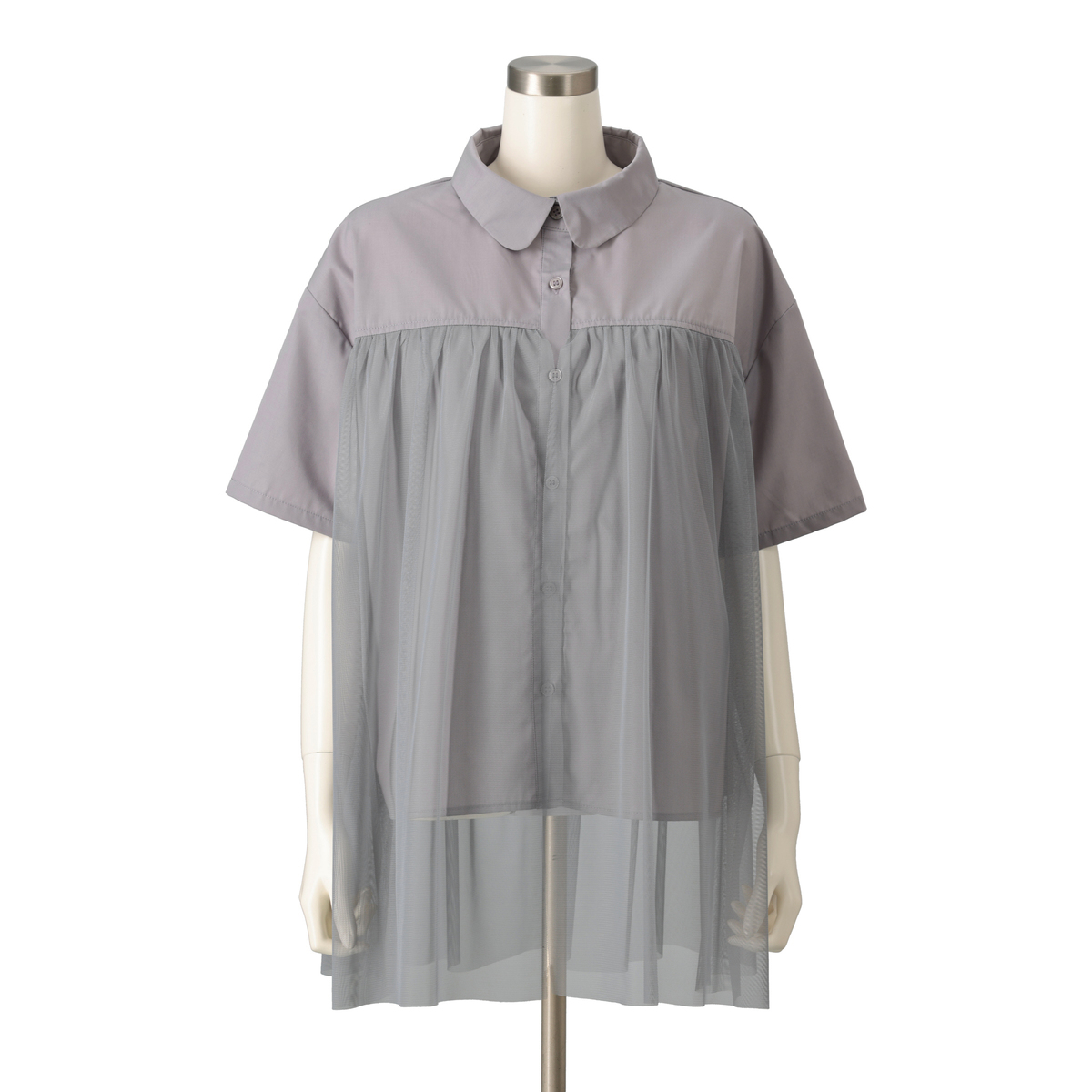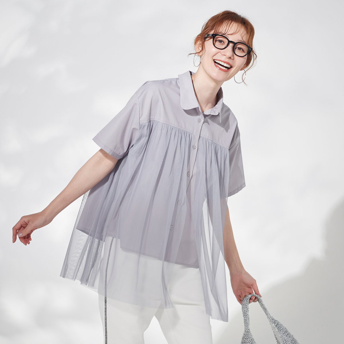 透け感が美しいチュール素材を重ねたブラウスです。軽やかなレイヤードが上品な印象を与え、コーディネートに立体感と遊び心をプラスします