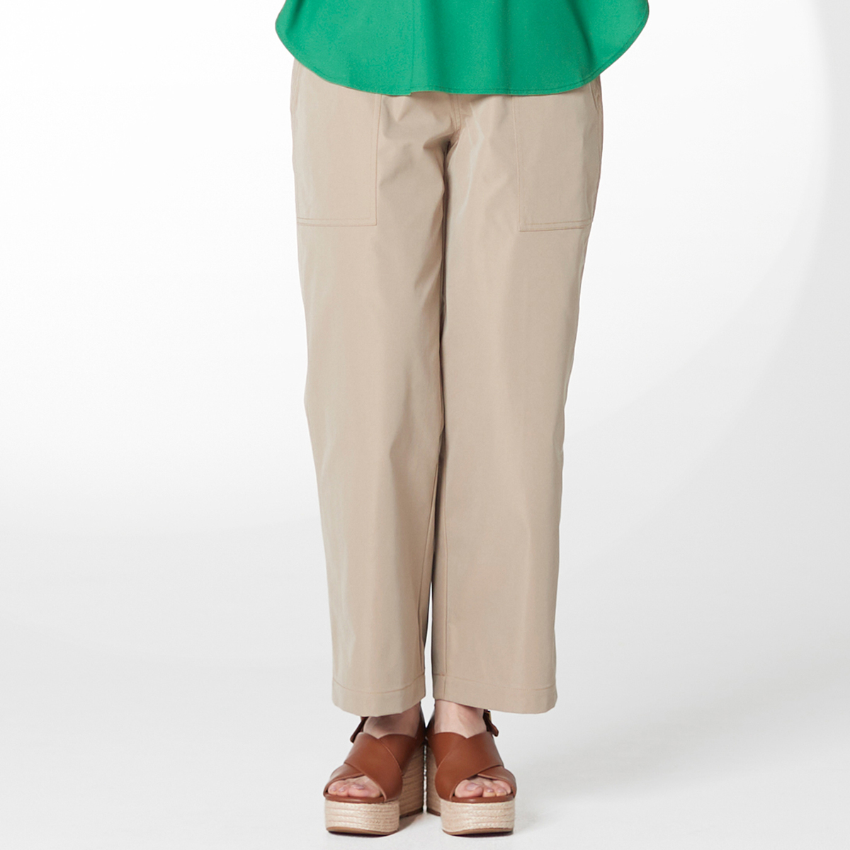 程よいハリと柔らかさを備えた布帛素材を使用し、穿いた時に美しいシルエットで、動きやすいセミワイドパンツです。生地には撥水加工を施し、突然の雨や水ハネも気になりにくいので、日常使いはもちろん旅行にも重宝します
