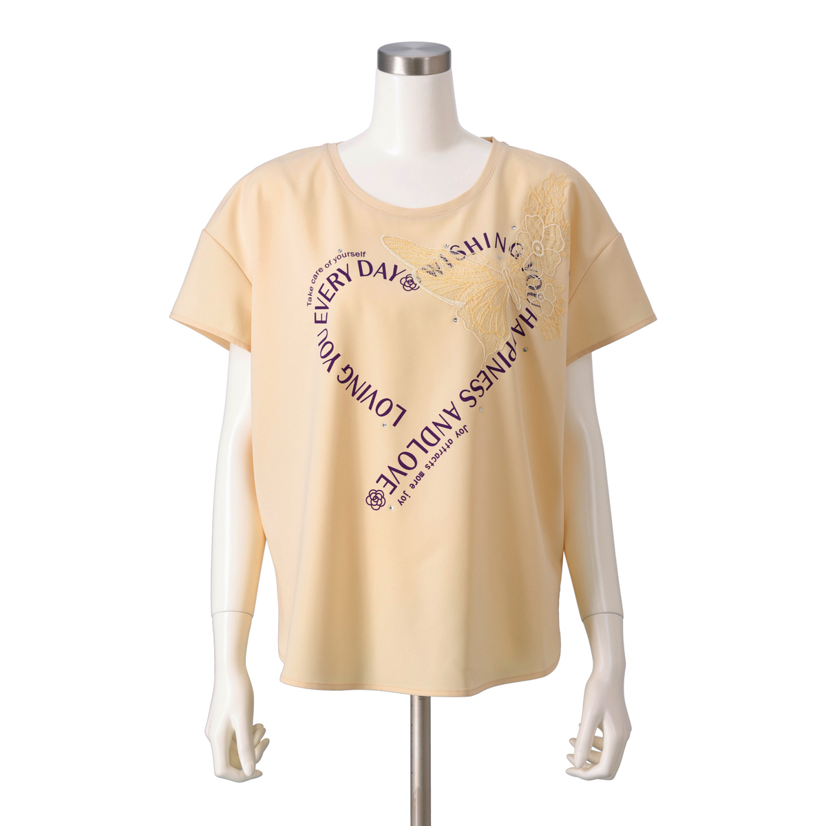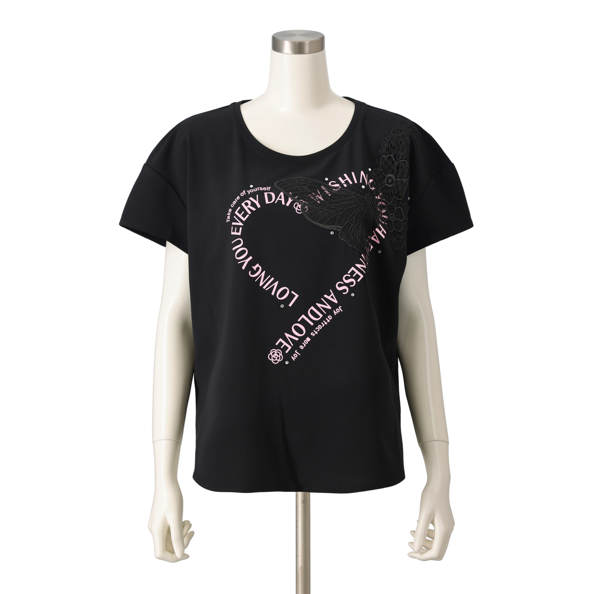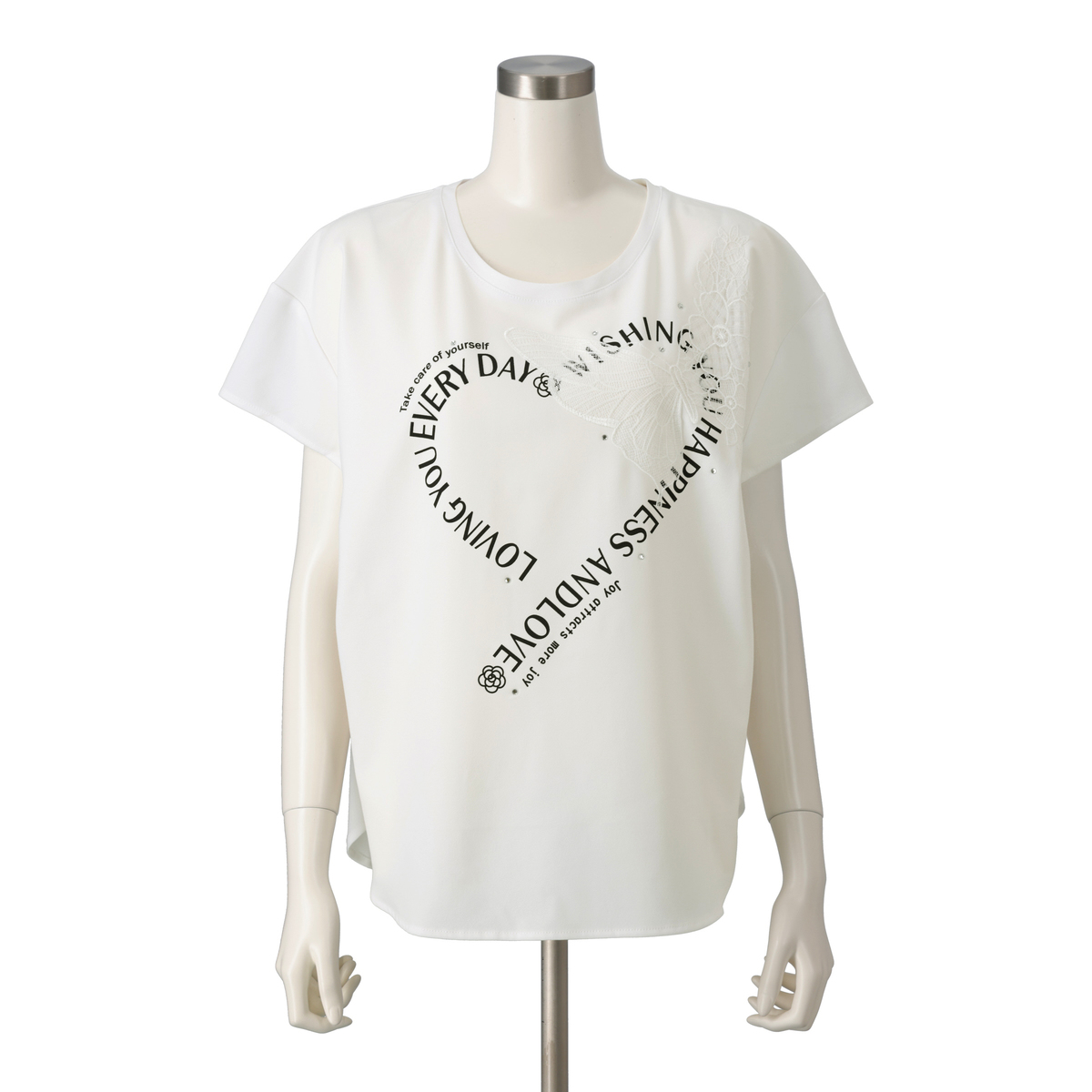 &LOVEオリジナルのハートのロゴプリントに、バタフライレースを重ねたTシャツ。キラキラのビジューもあしらい、華やかに仕上げました