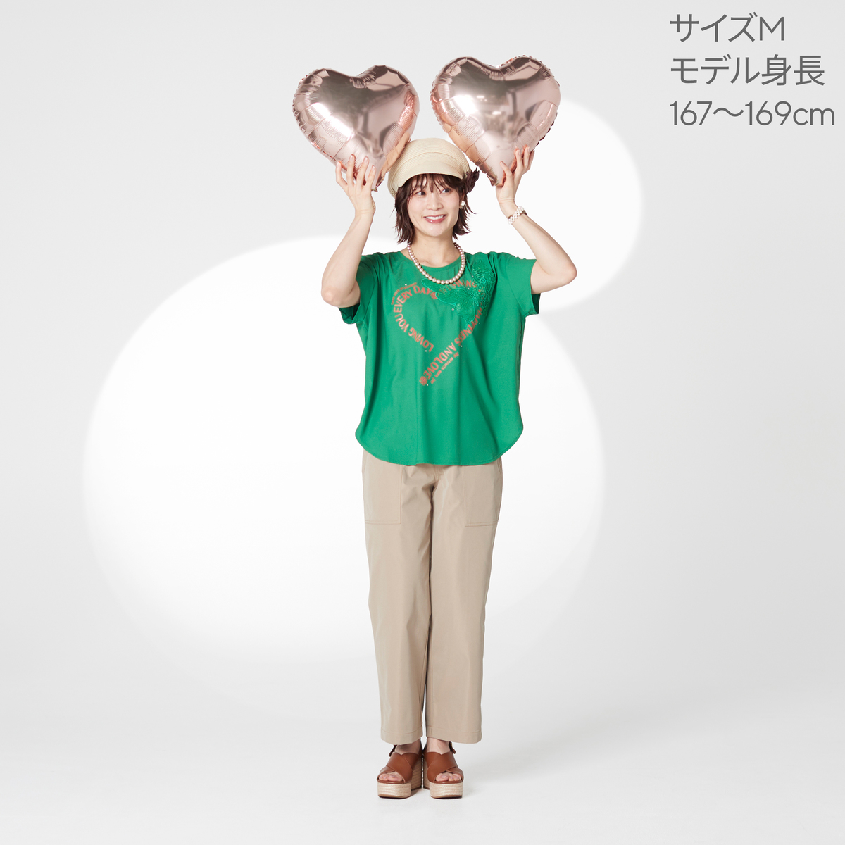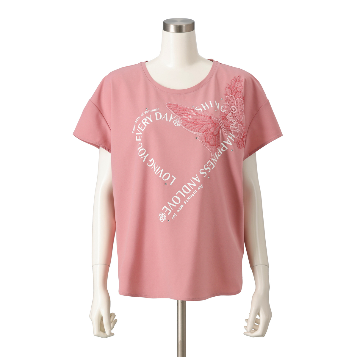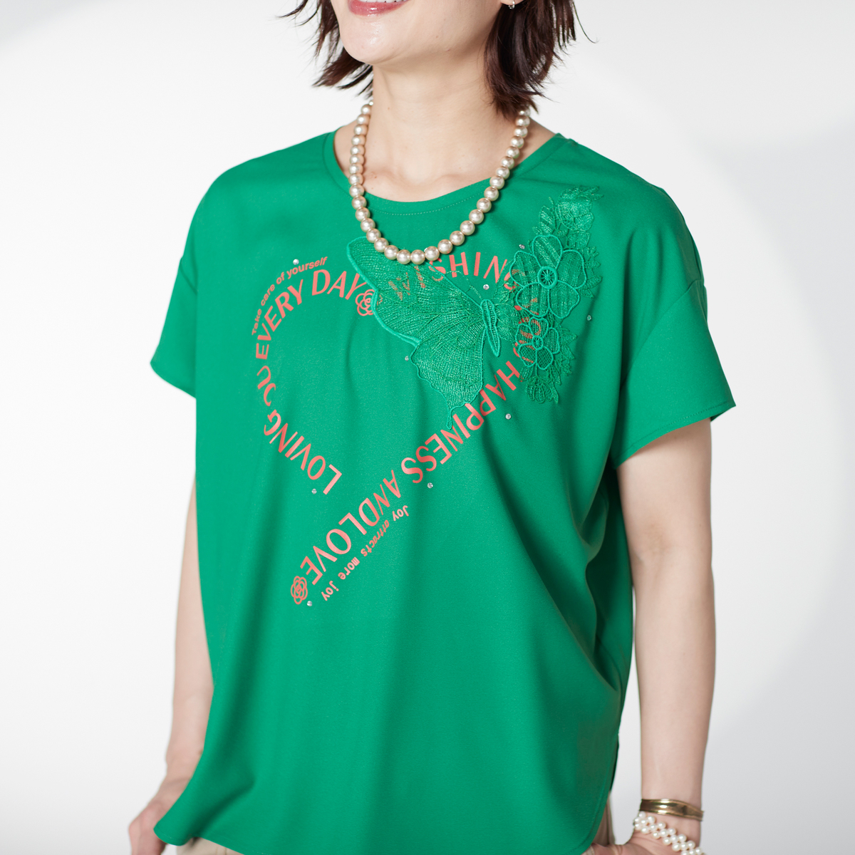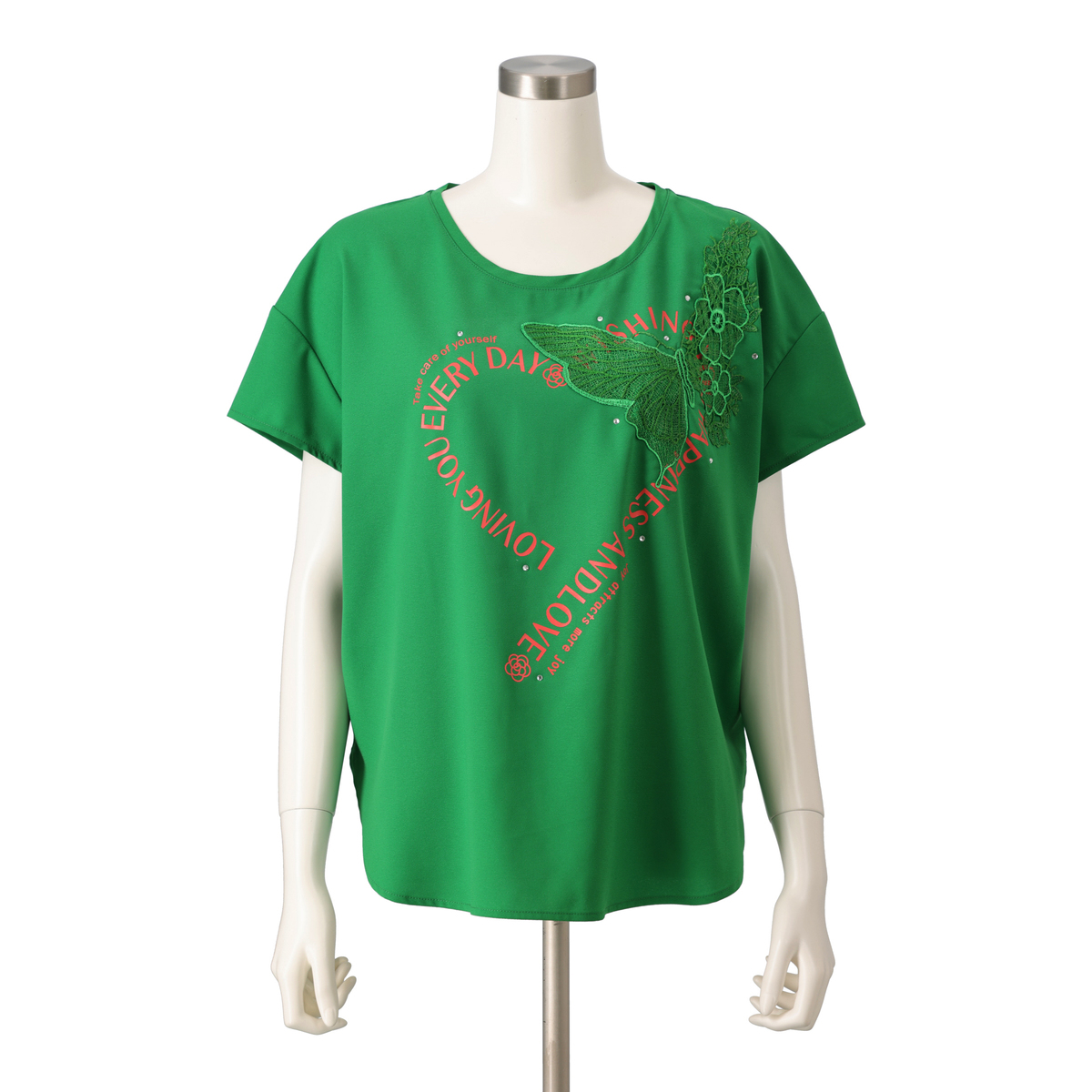 &LOVEオリジナルのハートのロゴプリントに、バタフライレースを重ねたTシャツ。キラキラのビジューもあしらい、華やかに仕上げました
