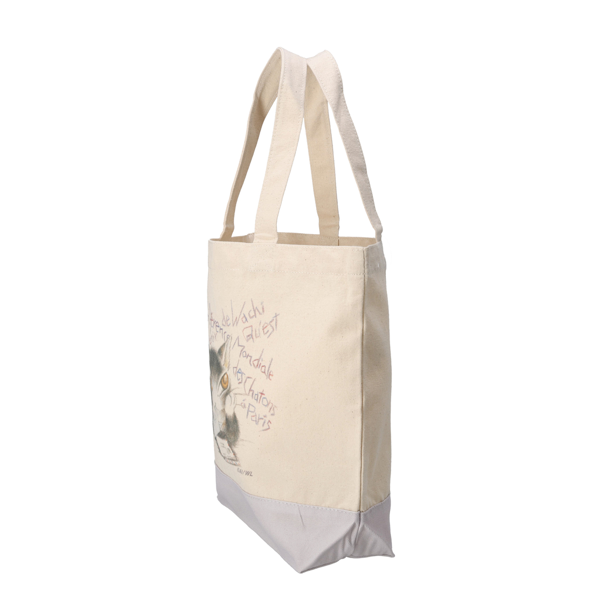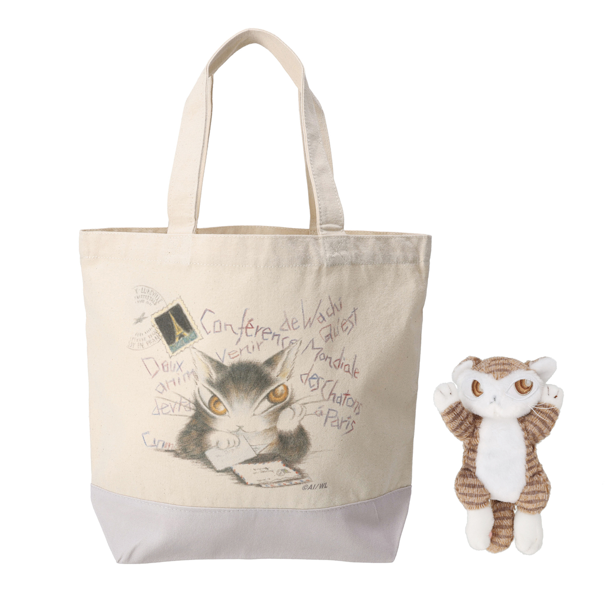 ぬいぐるみとミニトートの記念セットです。クタッと寝そべる姿のダヤンのぬいぐるみは、手のひらに収まるサイズ感で、正面から見ると両手を上げたポーズが印象的。おなかとしっぽに入ったペレットがほどよい触り心地です。「パリからの招待状」をプリントしたトートは、持ち歩きやすい大きさです