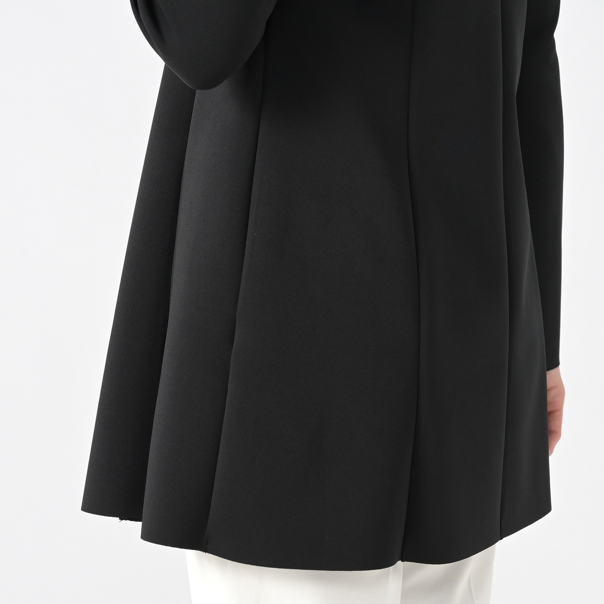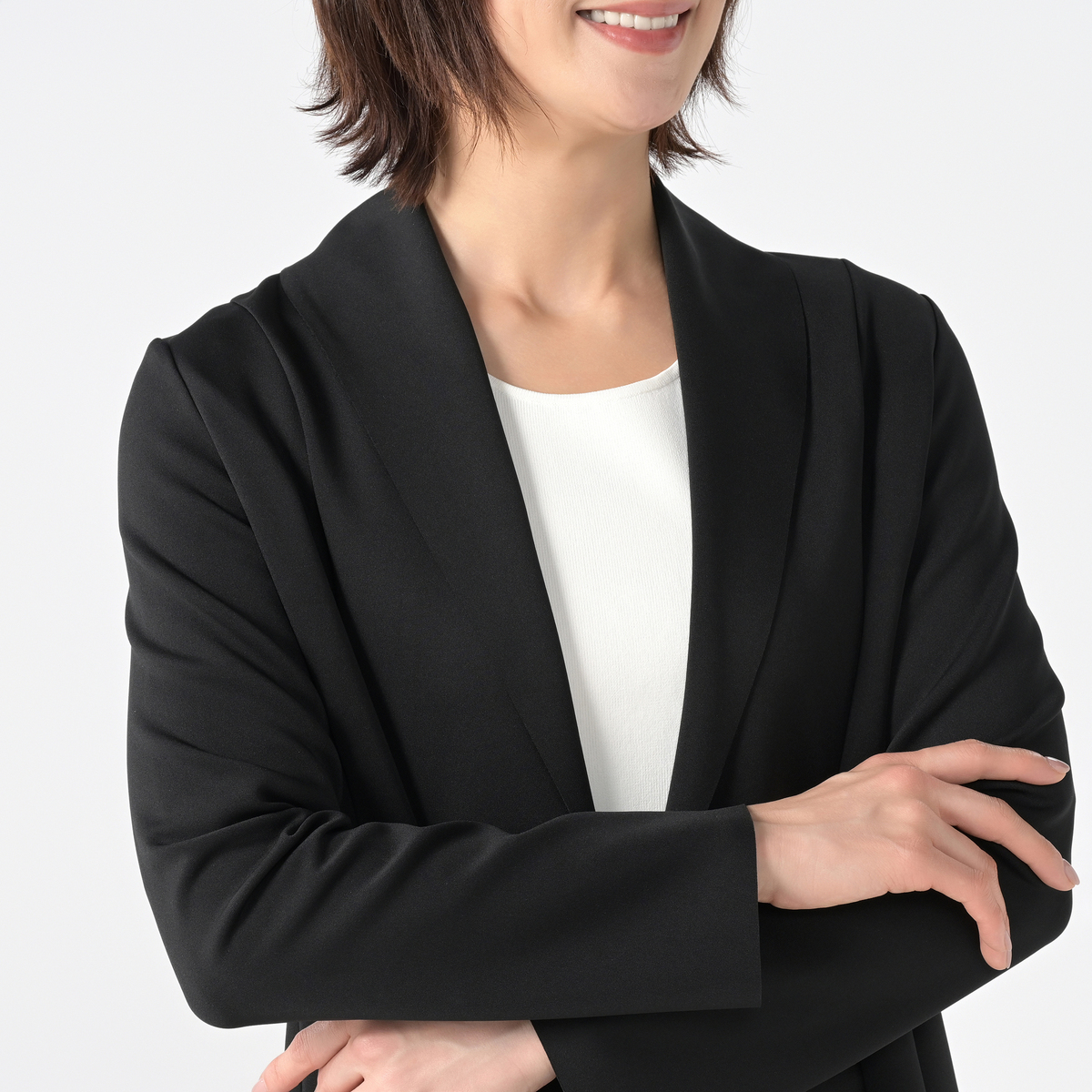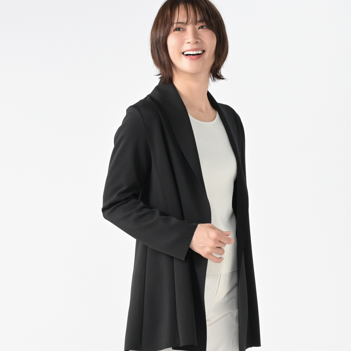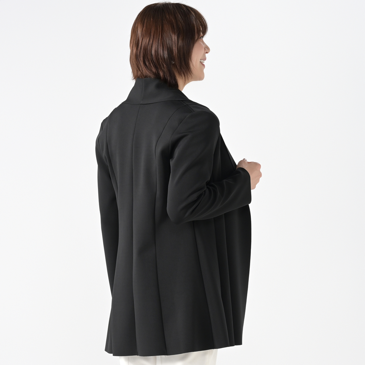 とろみ感のある素材を使用したドレープジャケット。肩から自然に落ちるしなやかなドレープが、優雅で洗練された印象を与えます