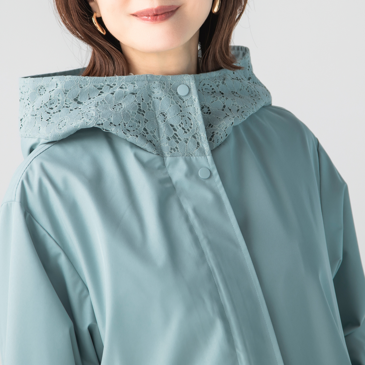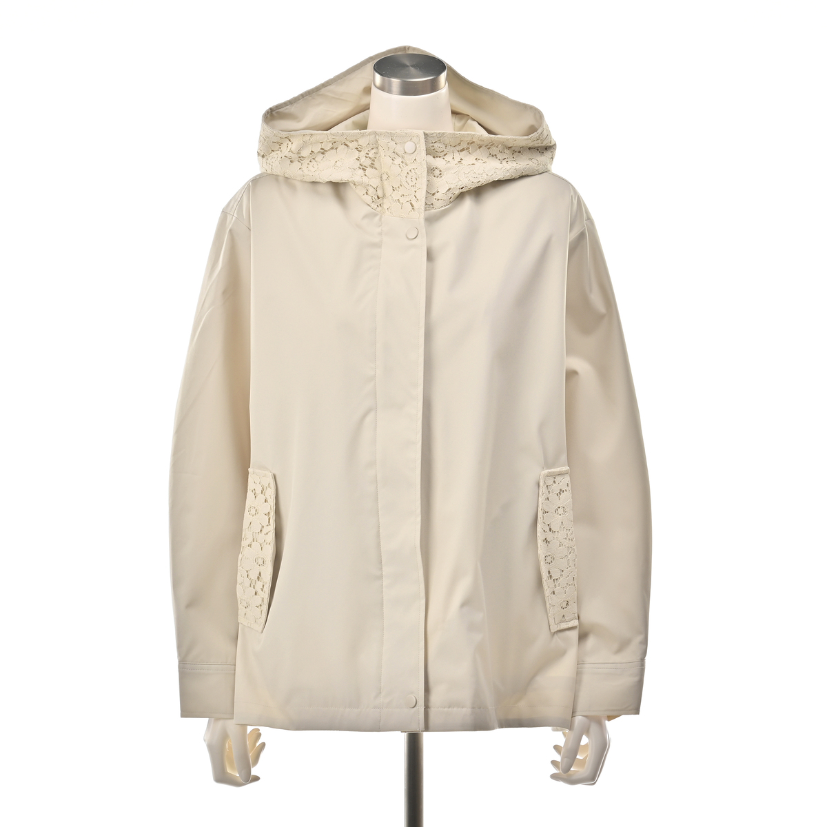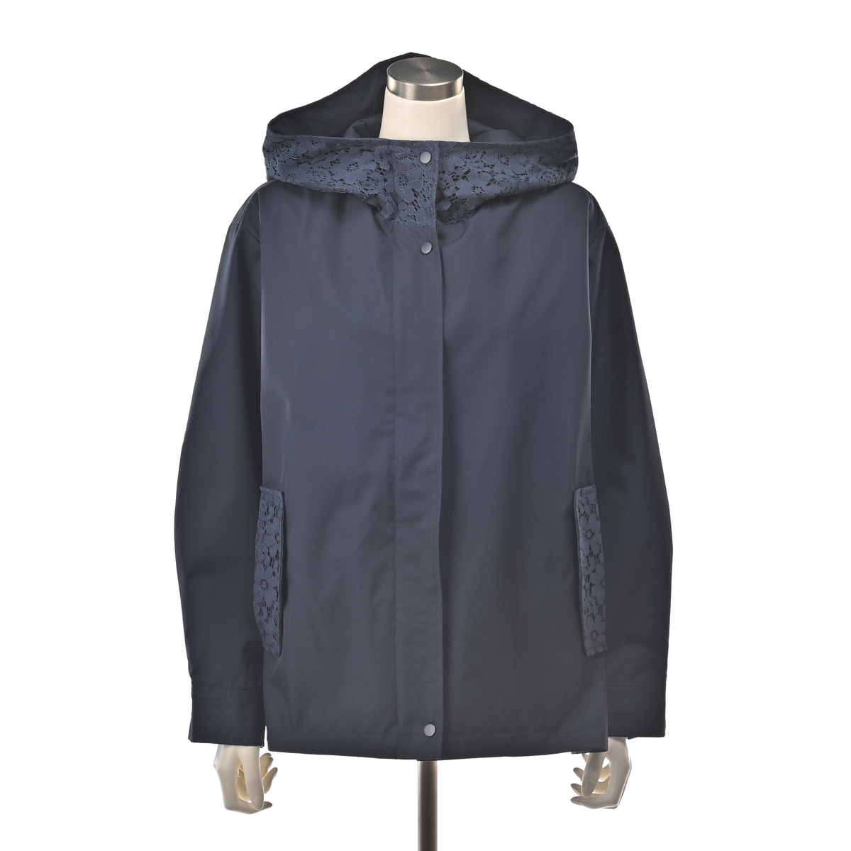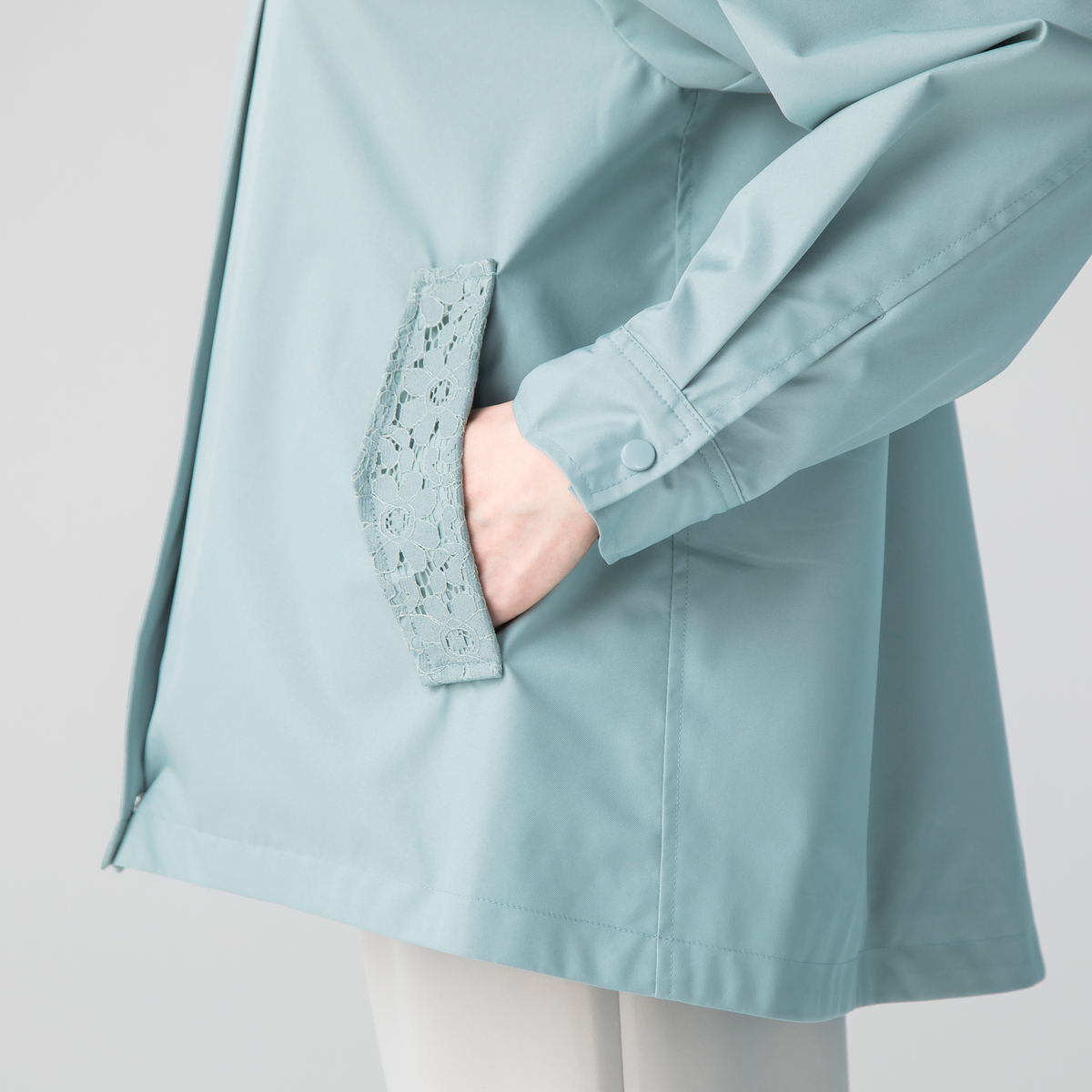 衿からフード周りとポケット口部分に施されたレースが、カジュアルなブルゾンに、フェミニンなニュアンスをプラス。レースのディテールが上品さを加えながら、落ち着いた雰囲気も。前開きのジップは着脱が簡単で、スタイリングの幅も広がります