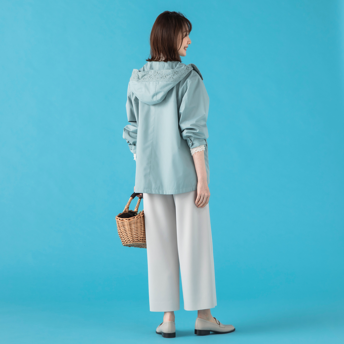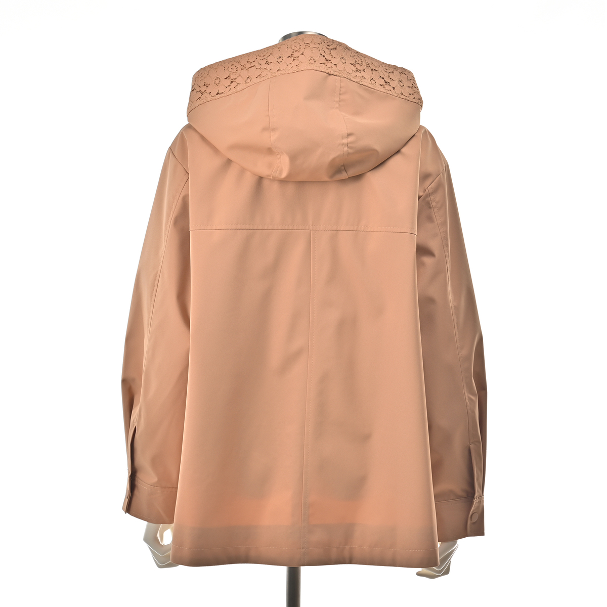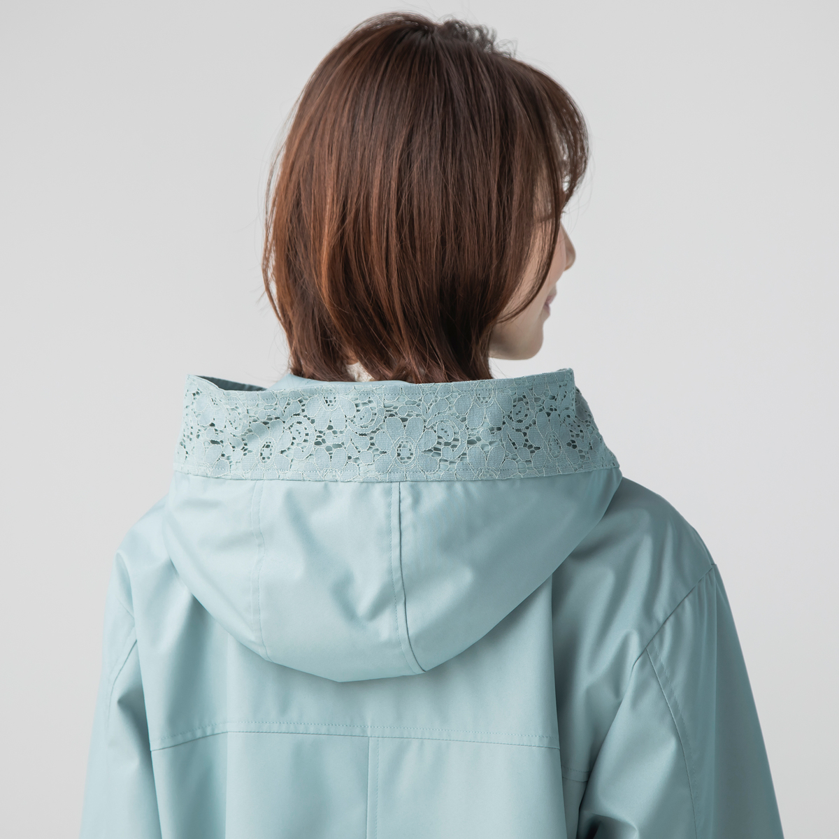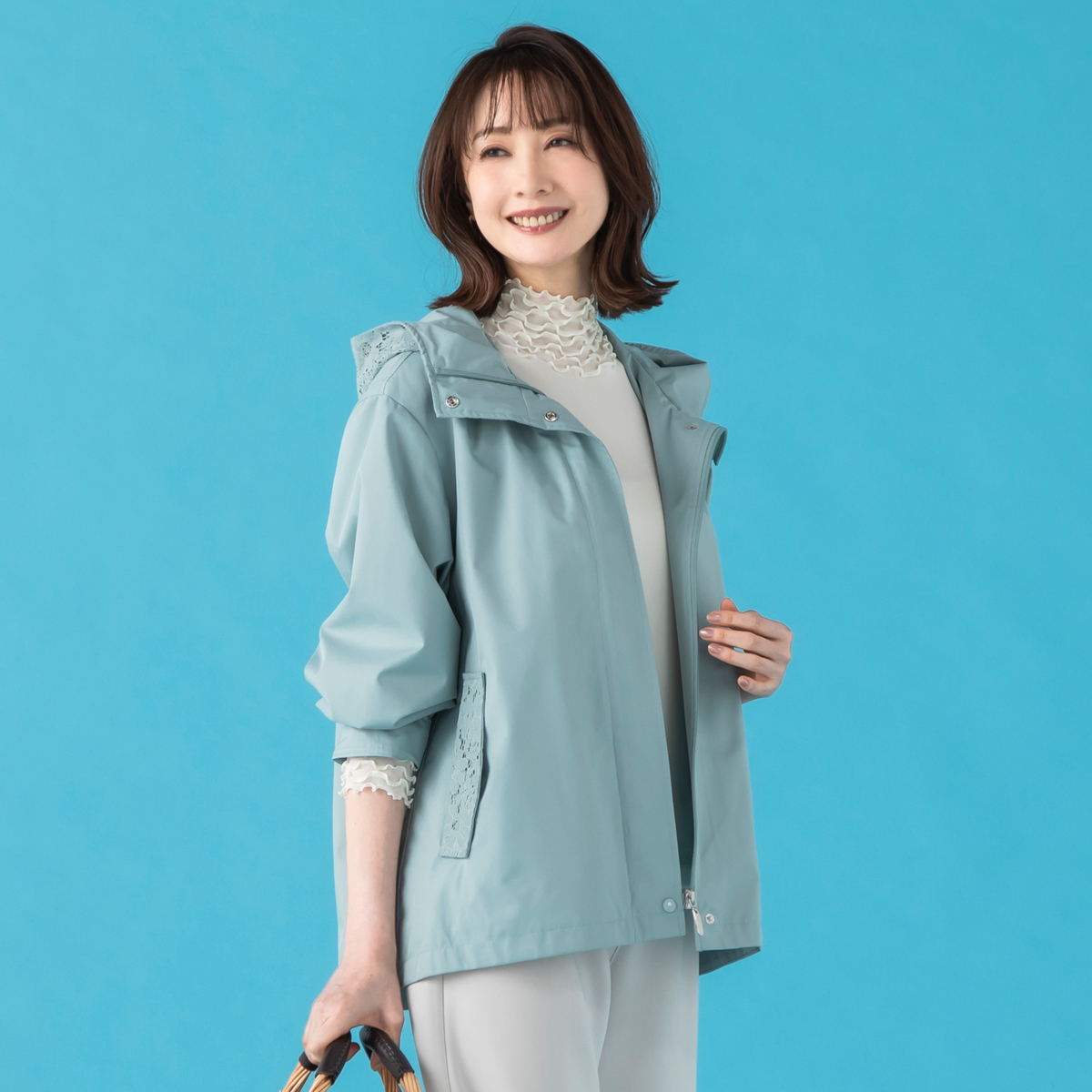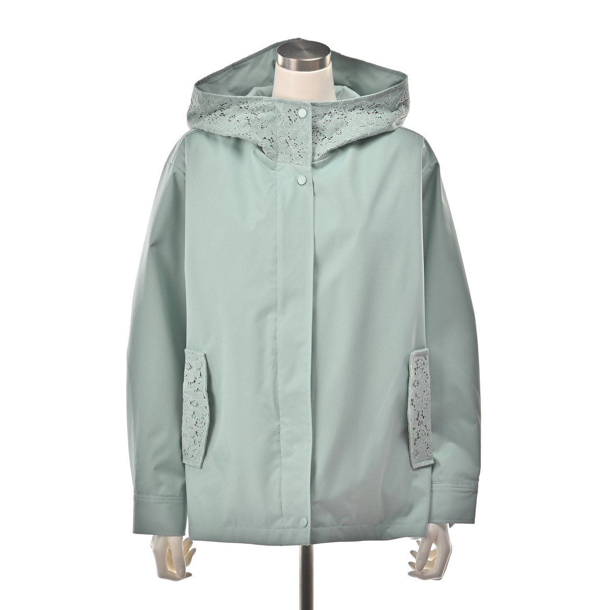 衿からフード周りとポケット口部分に施されたレースが、カジュアルなブルゾンに、フェミニンなニュアンスをプラス。レースのディテールが上品さを加えながら、落ち着いた雰囲気も。前開きのジップは着脱が簡単で、スタイリングの幅も広がります