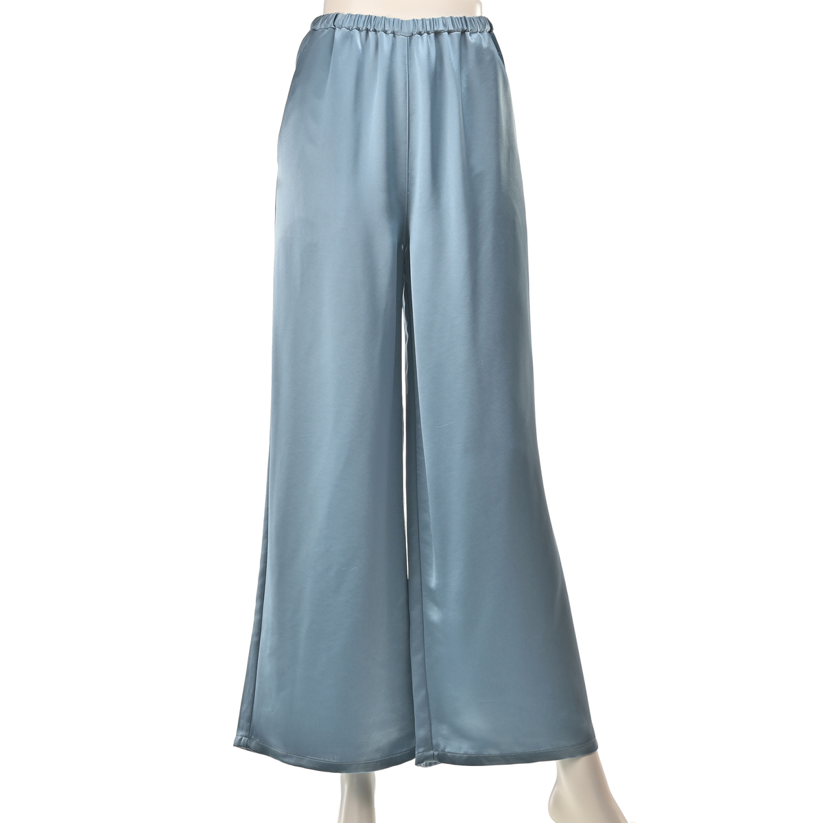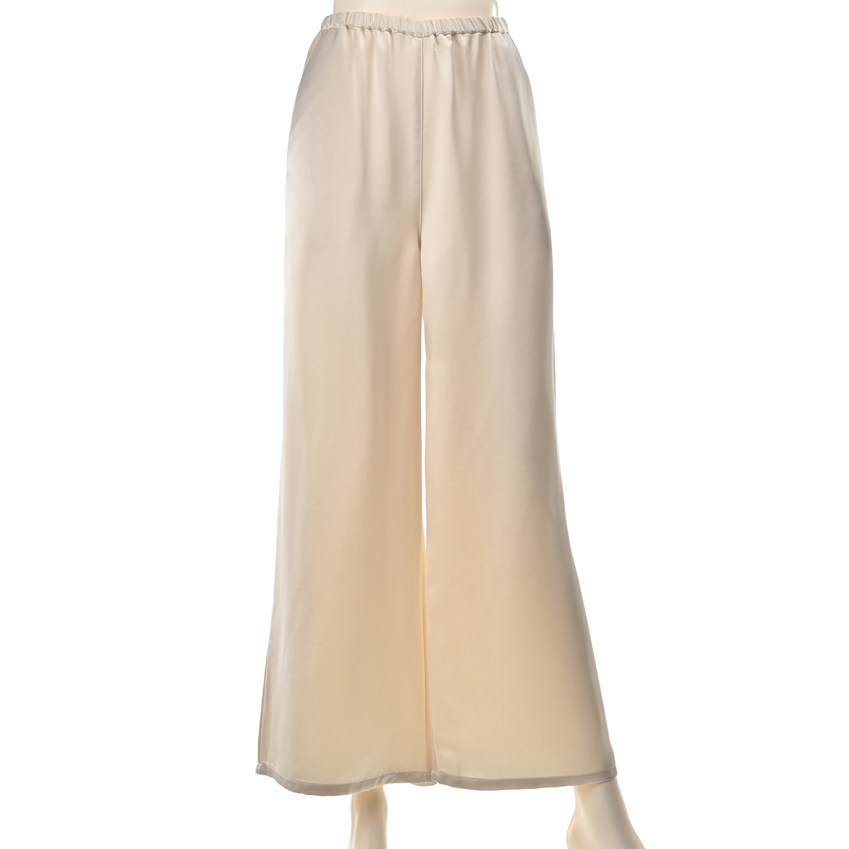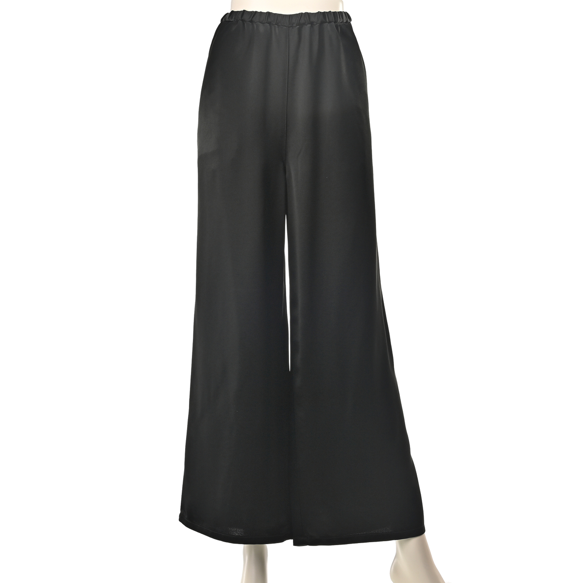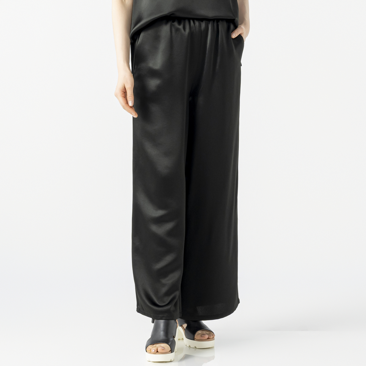 しなやかな光沢が映えるサテン素材のワイドパンツ。落ち感のあるシルエットがお洒落で、スタイリングにほどよい華やぎを添えます。左右脇にポケットを備え、ウエストは全体をゴム仕様にして、軽やかに穿ける仕上がりです