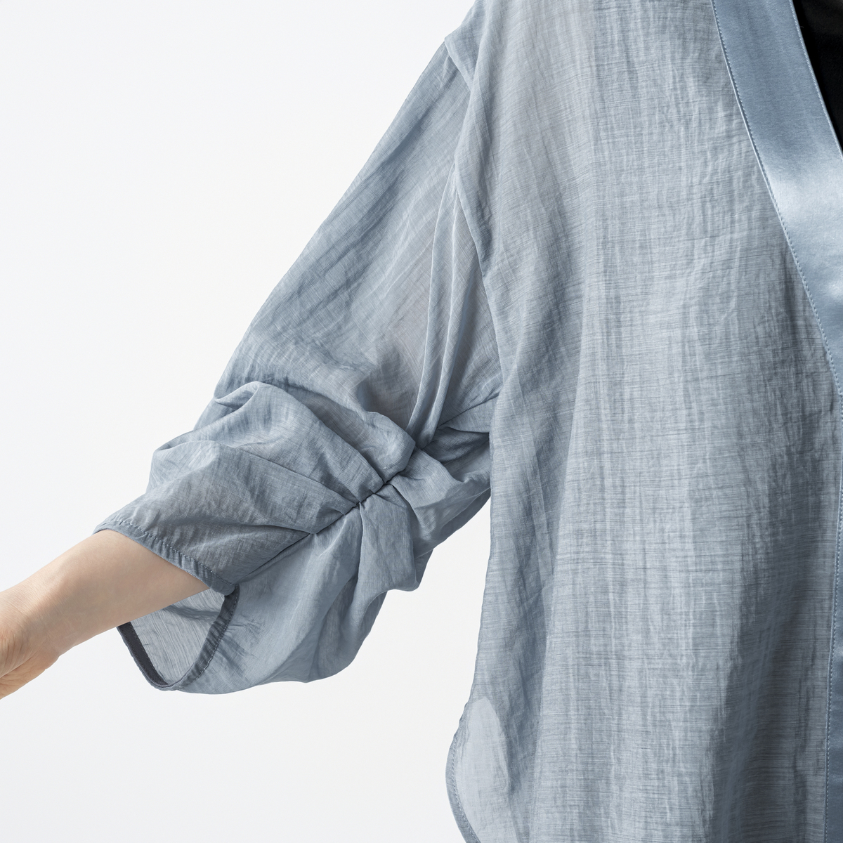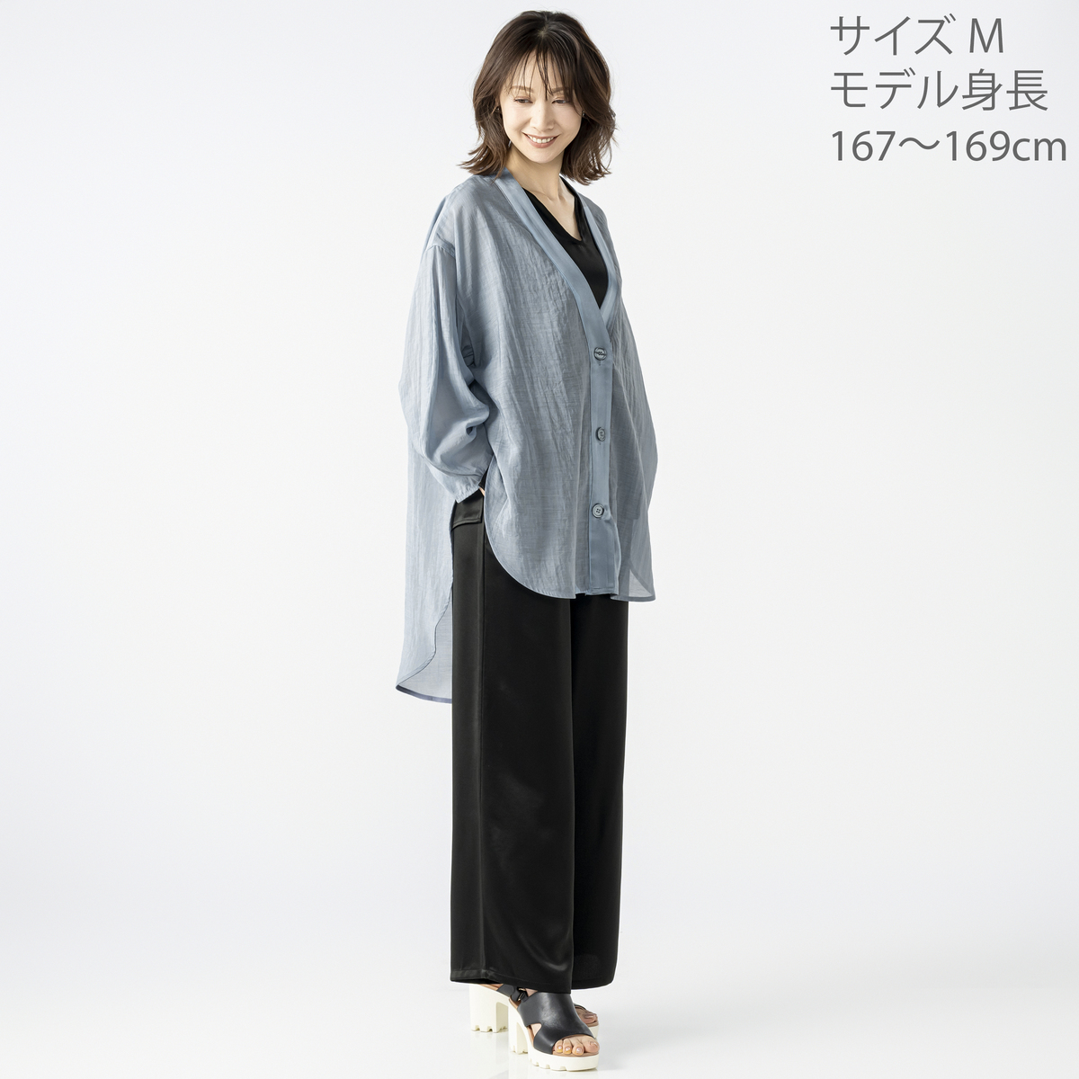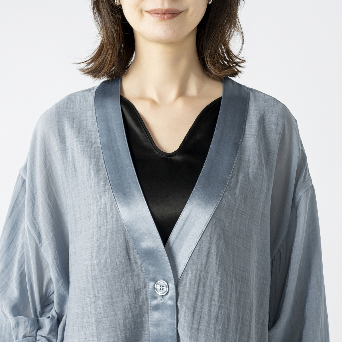 シアー素材とサテンを組合せたVネックカーディガンです。透け感が爽やかな印象を演出し、軽やかに羽織っていただけます