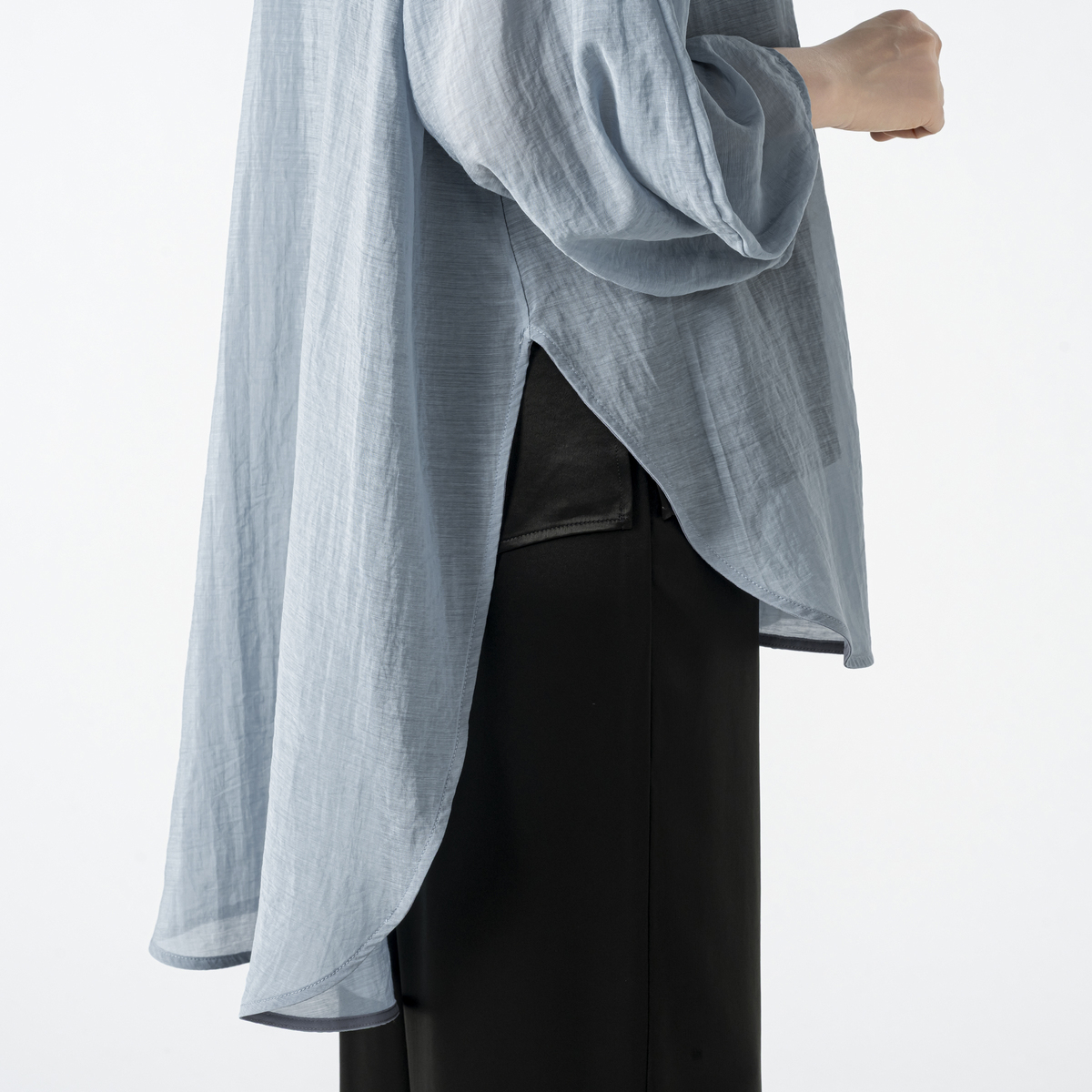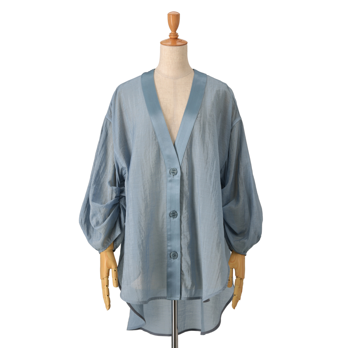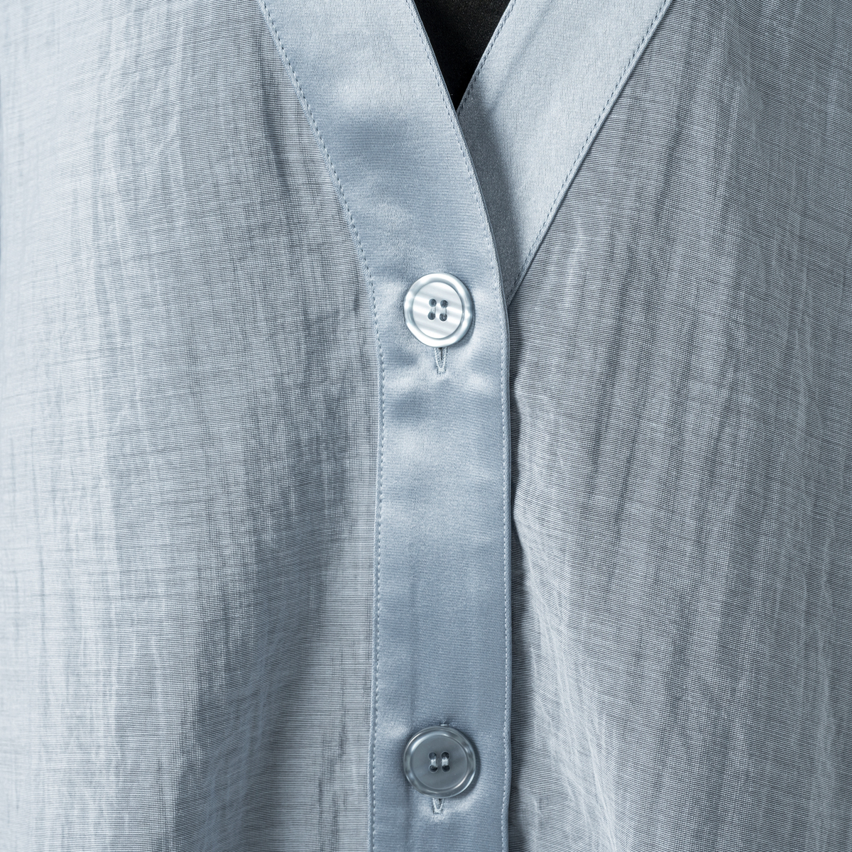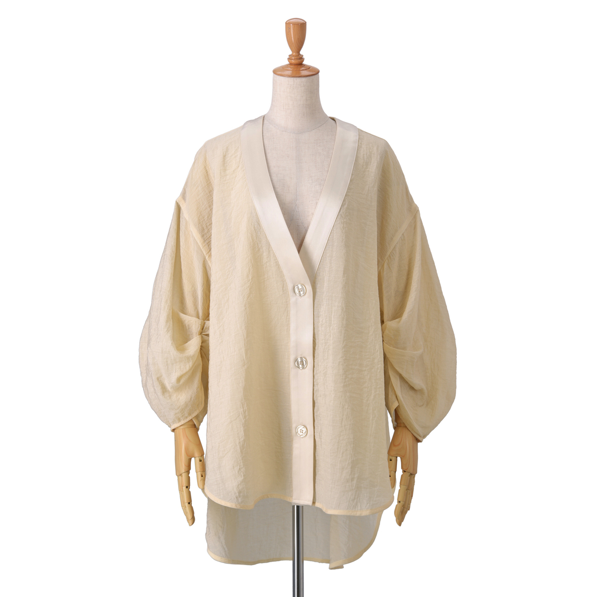 シアー素材とサテンを組合せたVネックカーディガンです。透け感が爽やかな印象を演出し、軽やかに羽織っていただけます