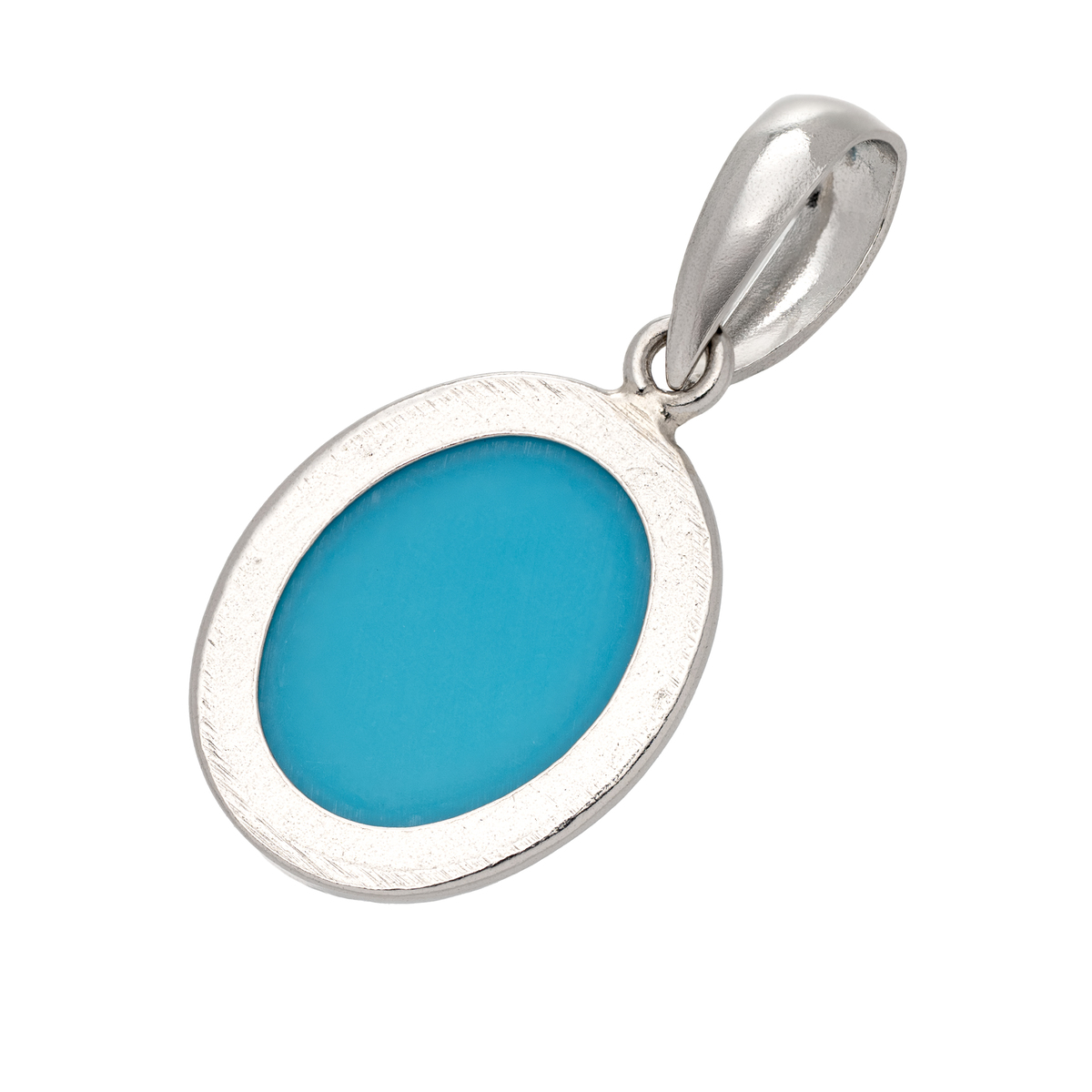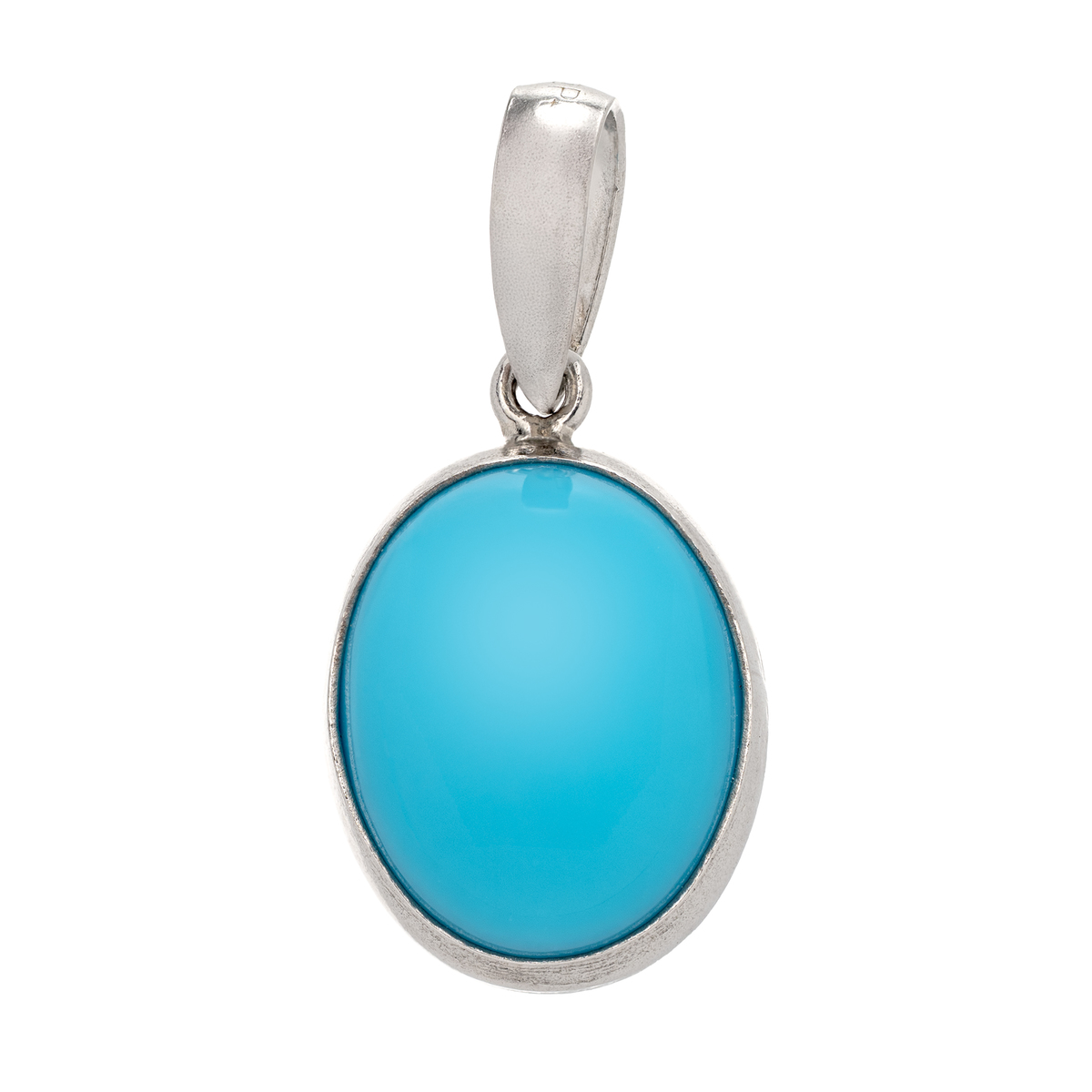 オーバルシェイプのスリーピングビューティートルコ石を使用したペンダントヘッド。澄み渡る空の色を映し出したような色合いが胸元を彩ります