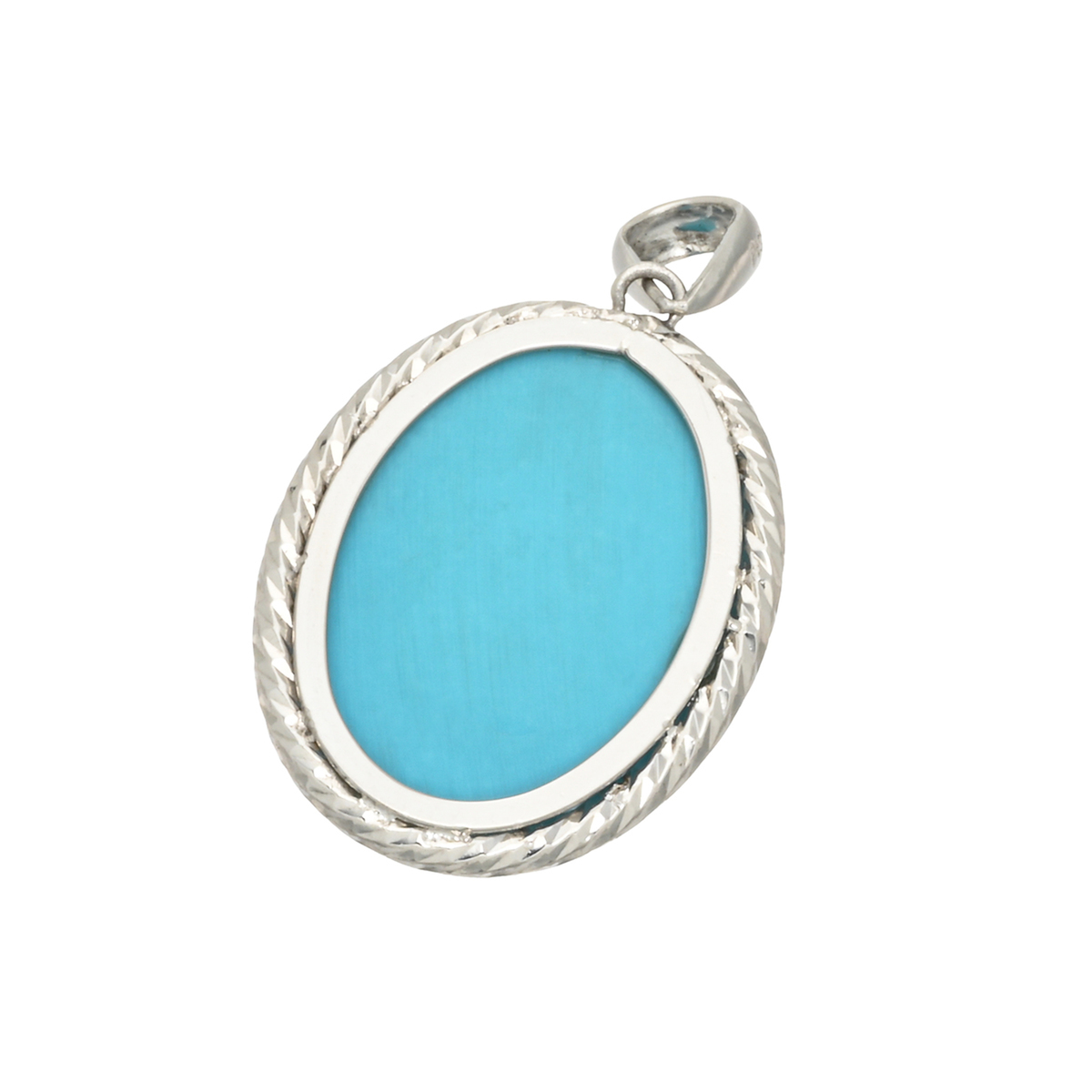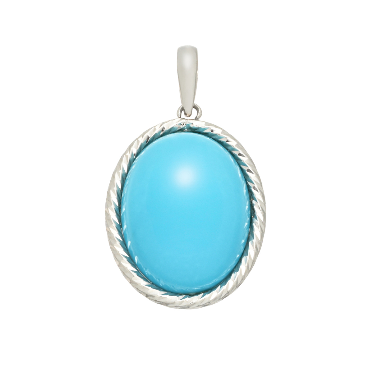 オーバルシェイプのスリーピングビューティートルコ石を使用したペンダントヘッド。澄み渡る空の色を映し出したような色合いが胸元を彩ります