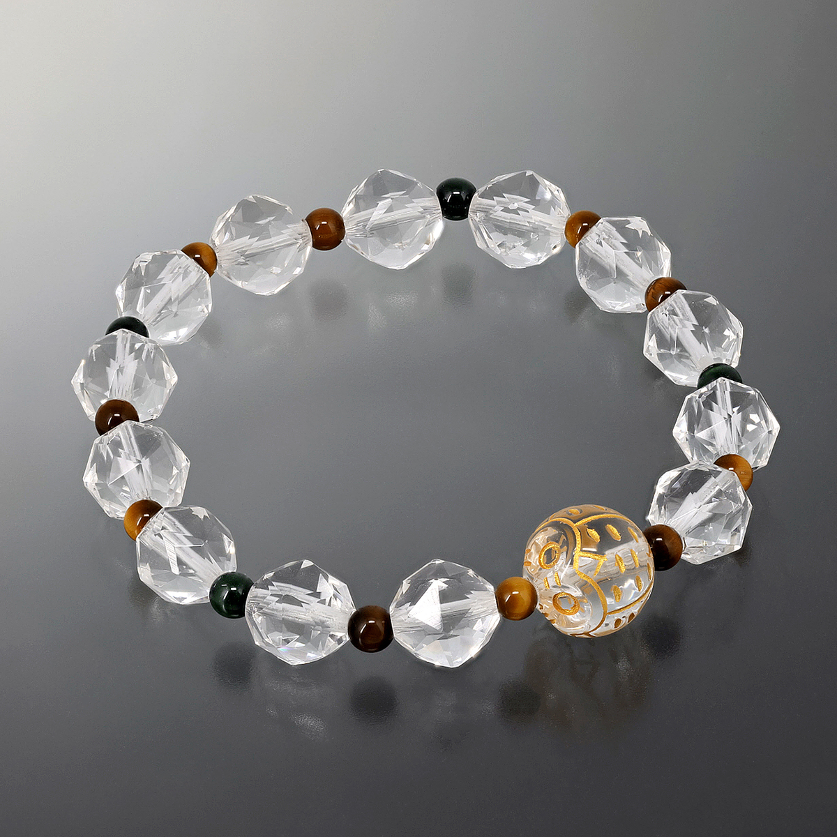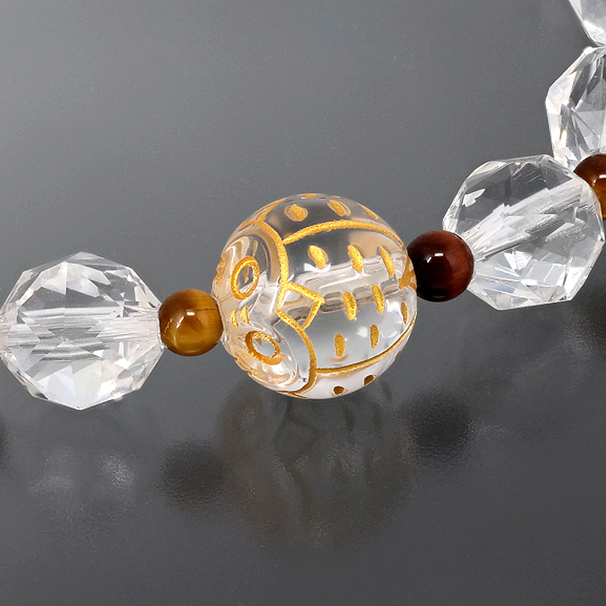 パワーストーンとしても人気の高い水晶にふくろうを手作業で彫上げ、ブレスレットにセット。透明感の美しい水晶に3色の虎目石でデザインしています