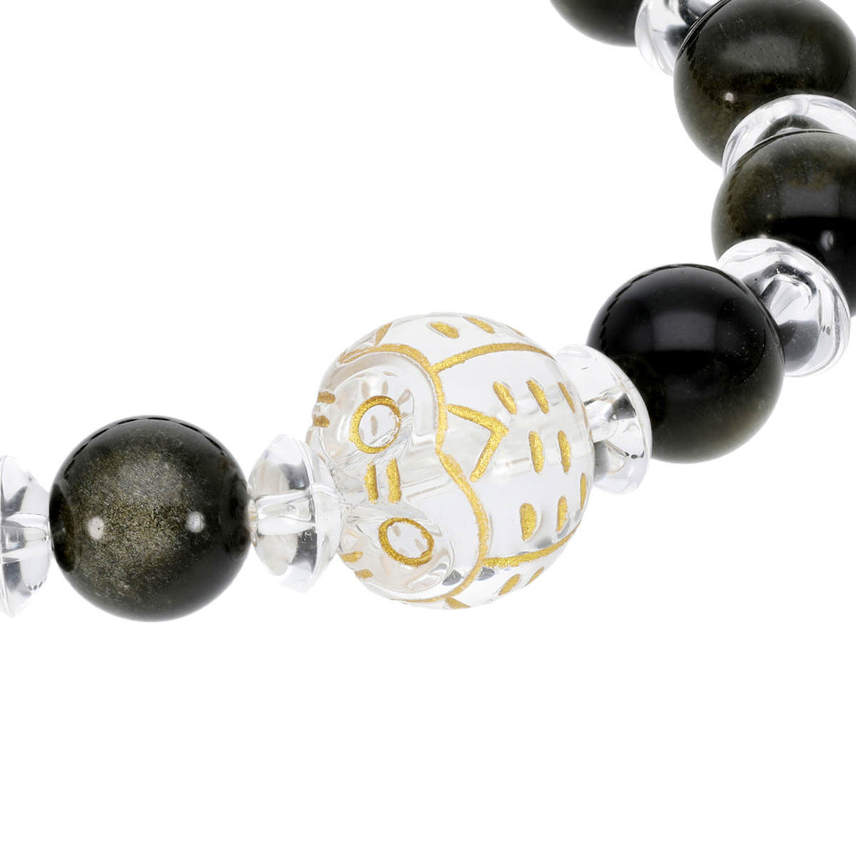 パワーストーンとしても人気の水晶に、手作業でふくろうを彫上げてセット。水晶とオプシディアンを連ねたサークルブレスです。オプシディアンは集中力・不思議・潜在能力の開花、水晶は幸運・浄化・純粋・無垢の石言葉を持っています