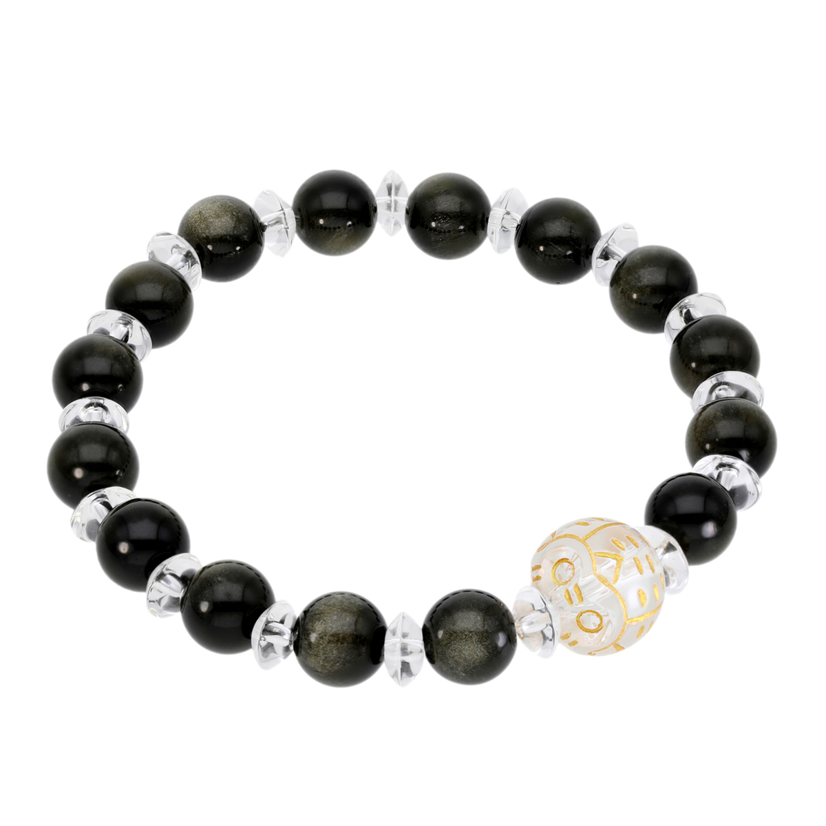 漆黒の美しさを持つオプシディアンをベースに、金色のシーン(光彩効果)が幻想的に煌めく、ゴールデンオプシディアンと呼ばれるオプシディアンを所々に配したデザイン。ストレッチタイプなので着脱ラクチンにお使いいただけます