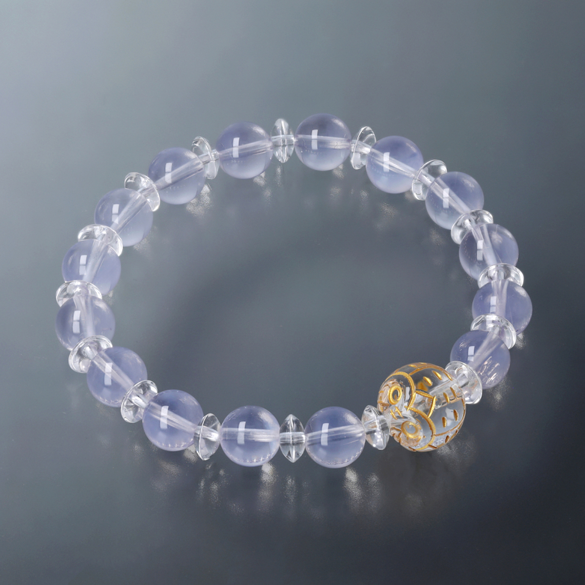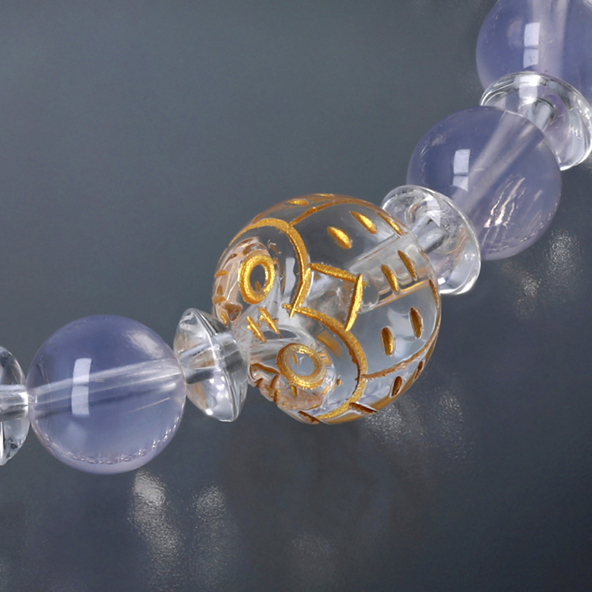 水晶にふくろうを彫り上げたモチーフが特徴のサークルブレス。パワーストーンとして人気の水晶に、動きに合わせて淡く輝くラベンダーカラーのクォーツを組合せました。水晶の石言葉は幸運、浄化、純粋、無垢、ミルキークォーツの石言葉は母性愛です