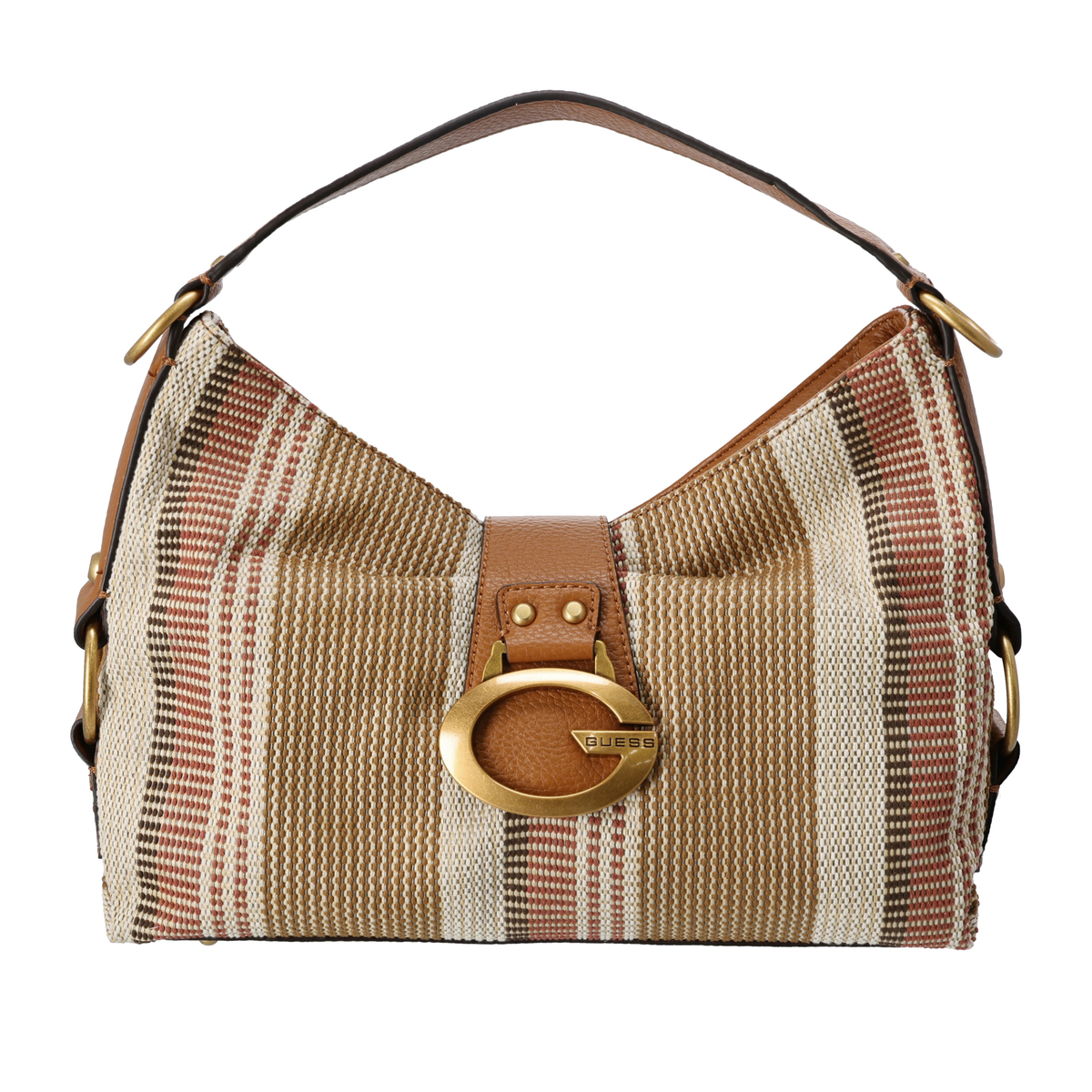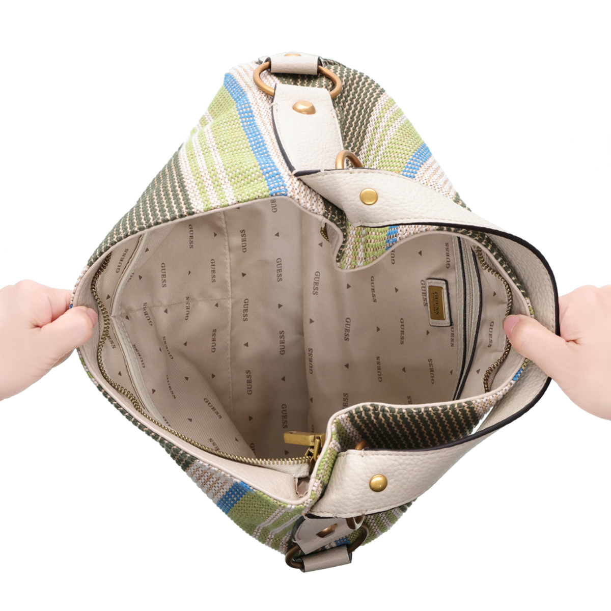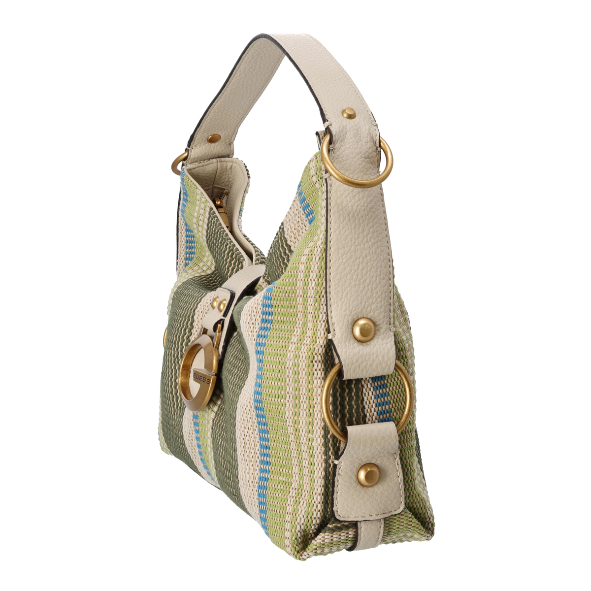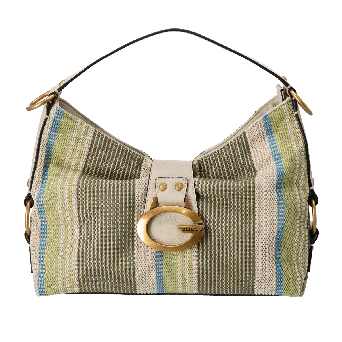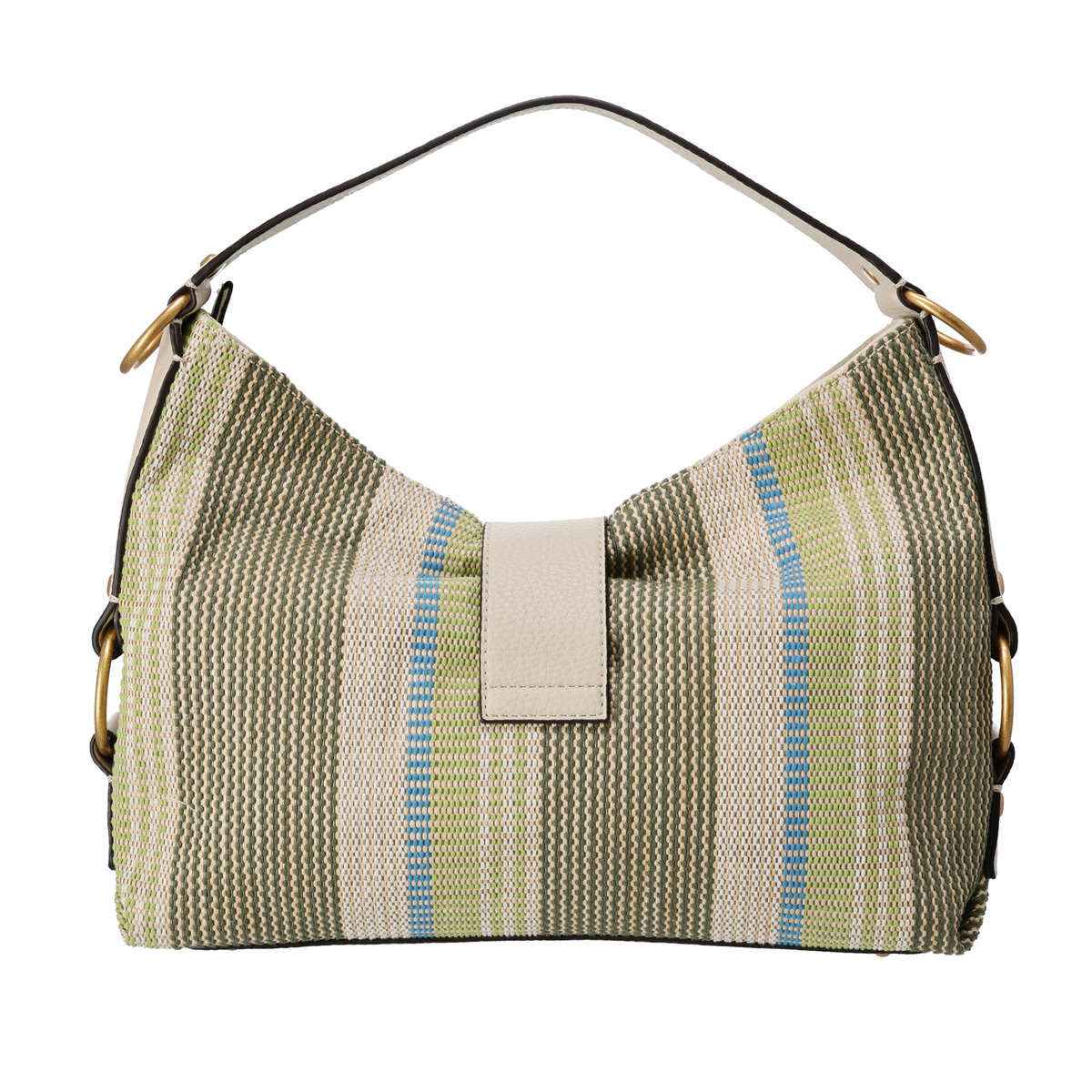 シーズンムードを高めるショルダーバッグ。春先から初夏に映える鮮やかなカラーが目を引き、マルチカラーのストライプは涼しげな印象。柔らかく大きく開くファスナーで使いやすく、カゴバッグ風の軽い編み込みデザインでカジュアルな装いにピッタリです