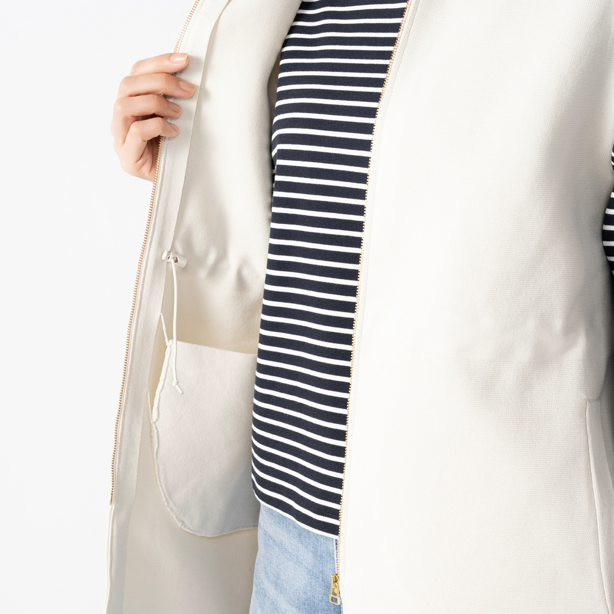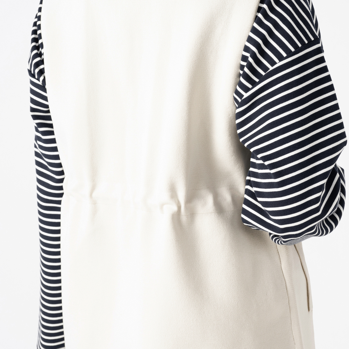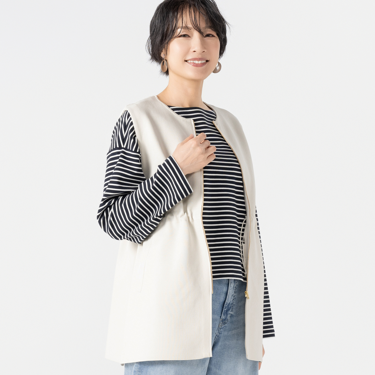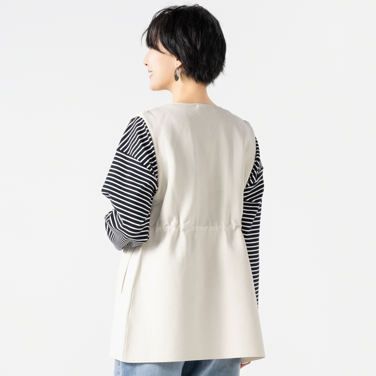 軽やかな着心地で、ストレッチ性のある素材を使用したニットジレです。ウエストのドロストコードでシルエットを調節でき、ZIP仕様でキーネックベスト風にも着用可能。スラッシュポケットで全体をシャープに仕上げました