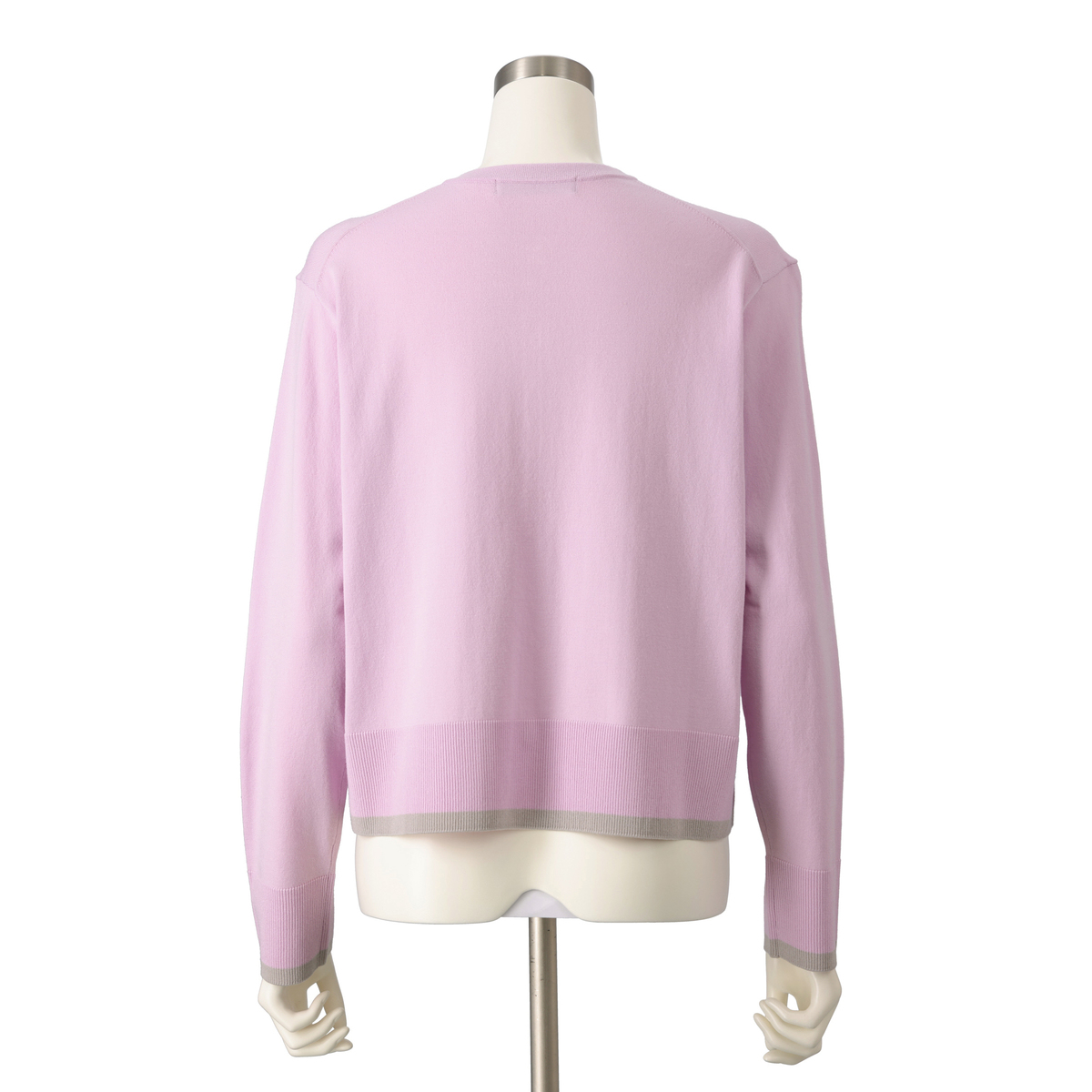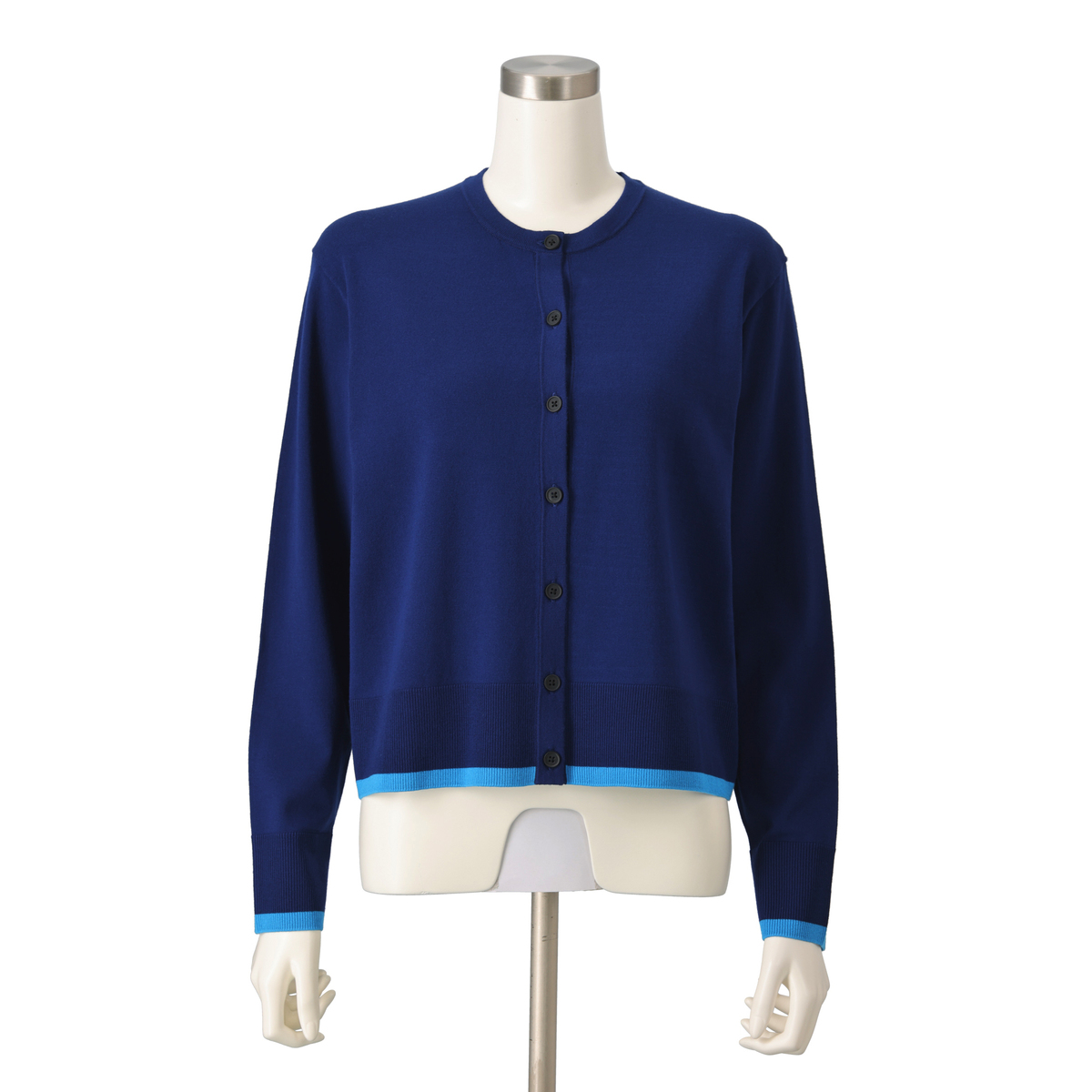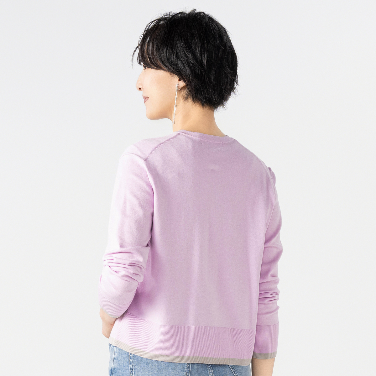 バイカラー配色のクルーネックカーディガン。袖口、裾の配色ラインに加えて、衿、前立て裏側の配色使いもポイントになっています。季節の変わり目などに気軽に羽織れるアイテムです