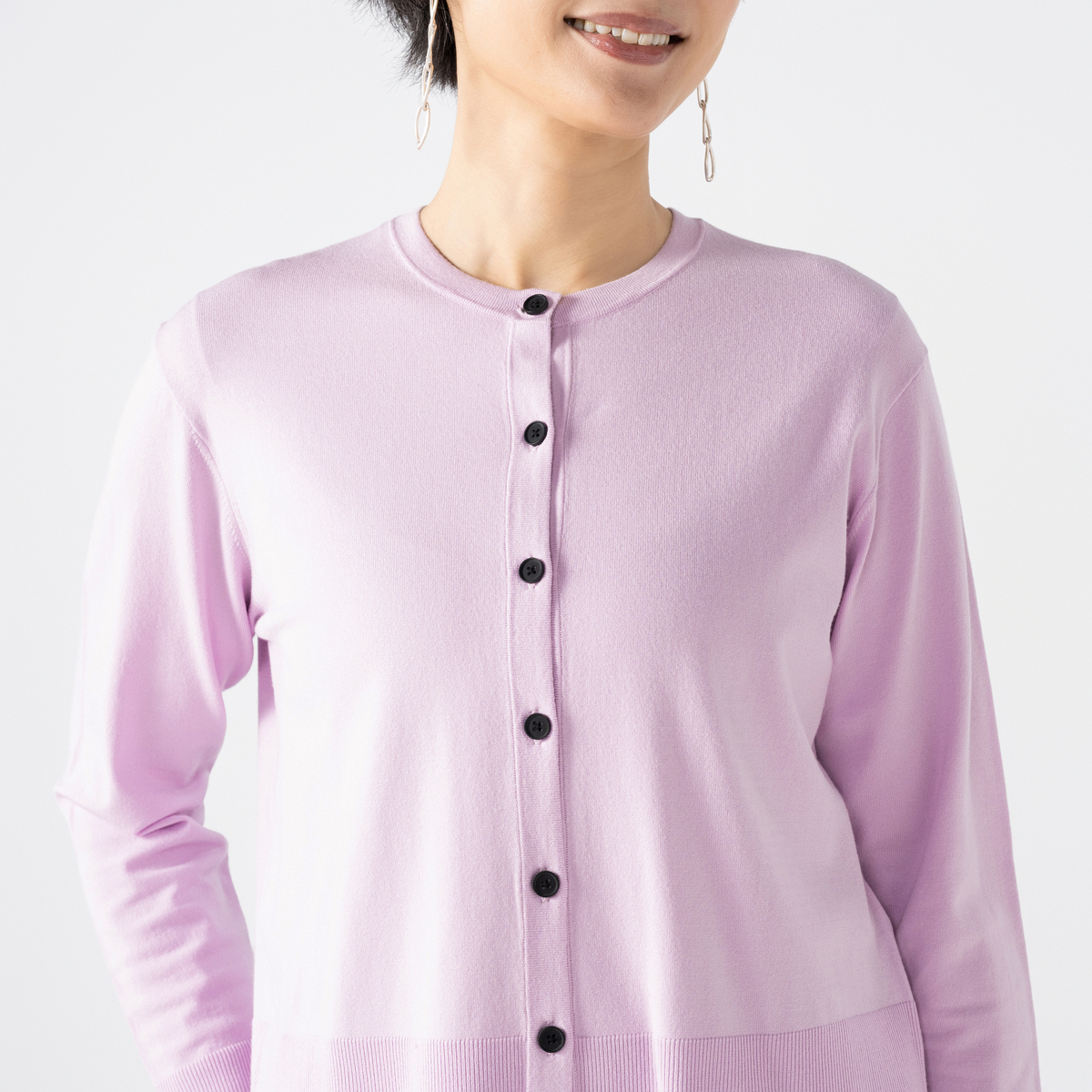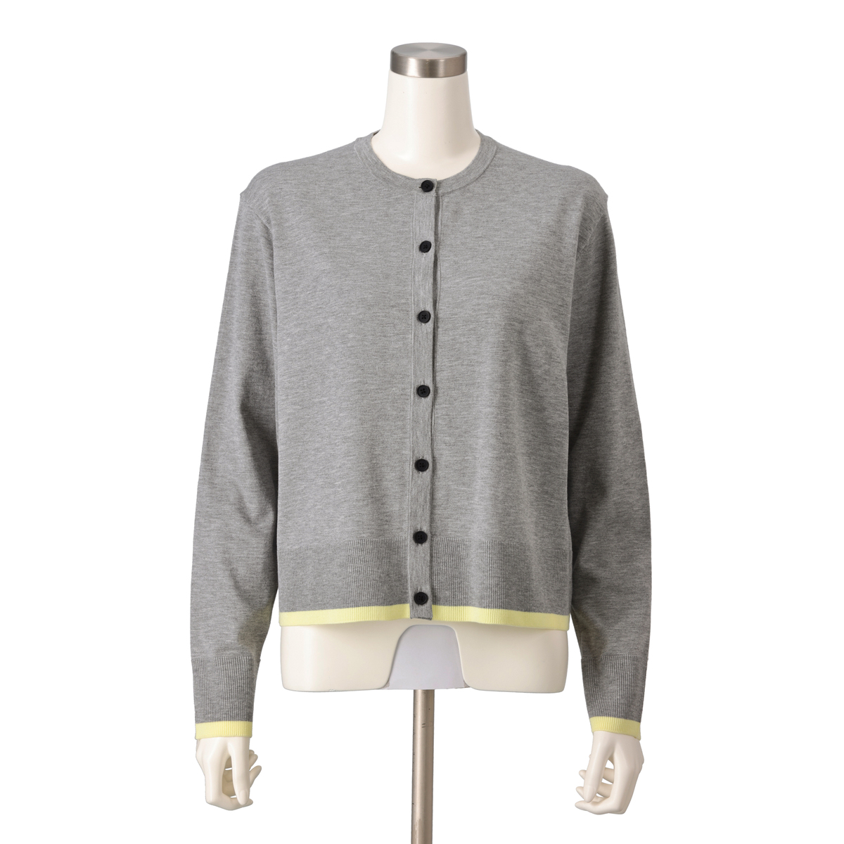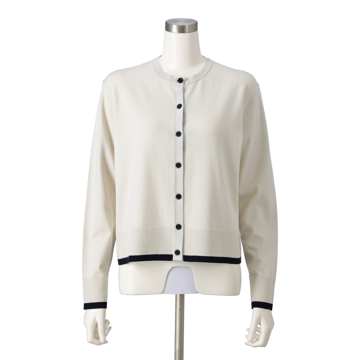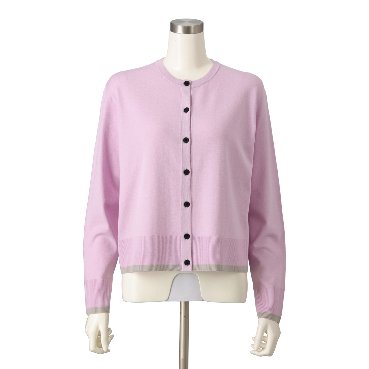 バイカラー配色のクルーネックカーディガン。袖口、裾の配色ラインに加えて、衿、前立て裏側の配色使いもポイントになっています。季節の変わり目などに気軽に羽織れるアイテムです