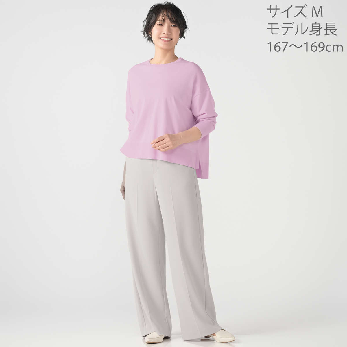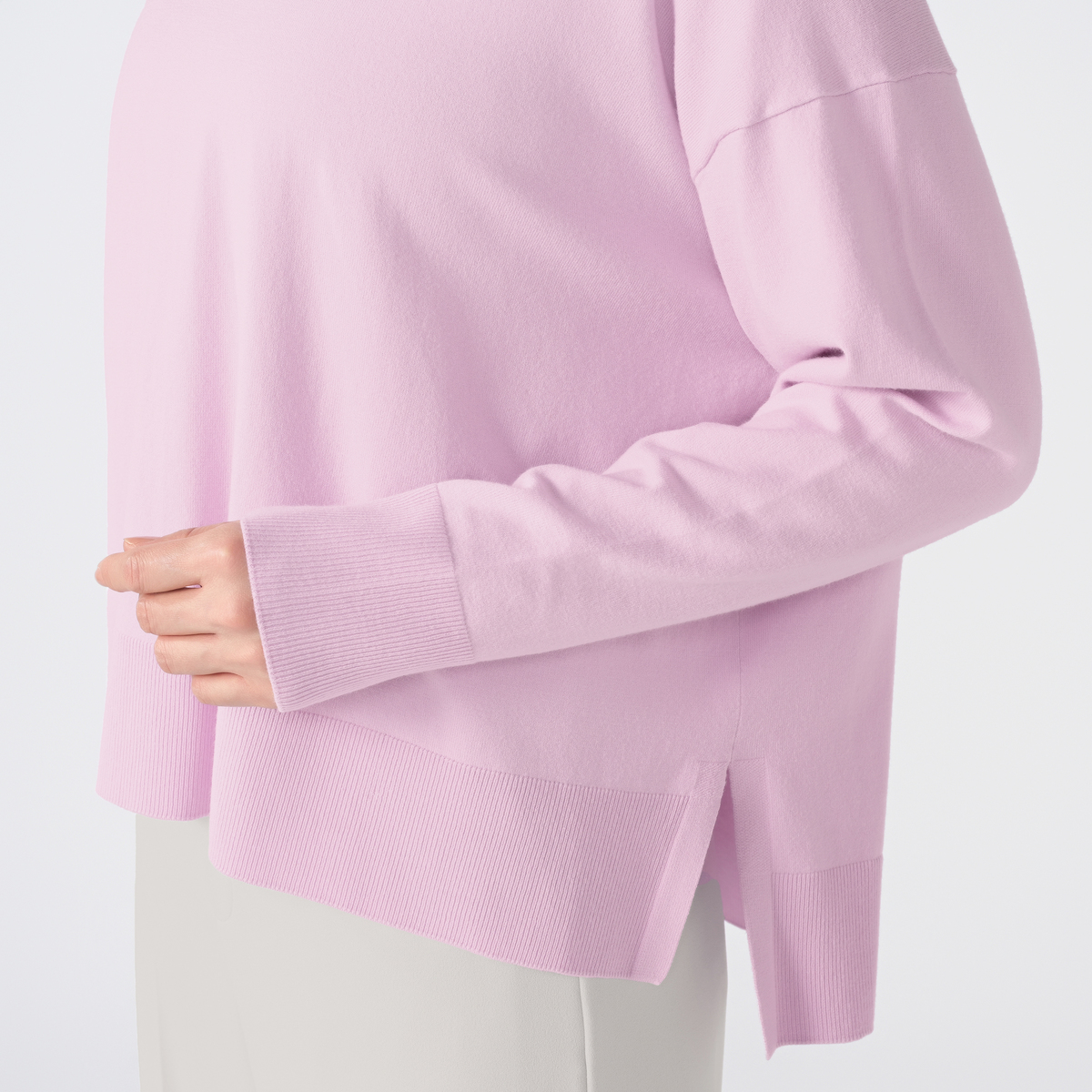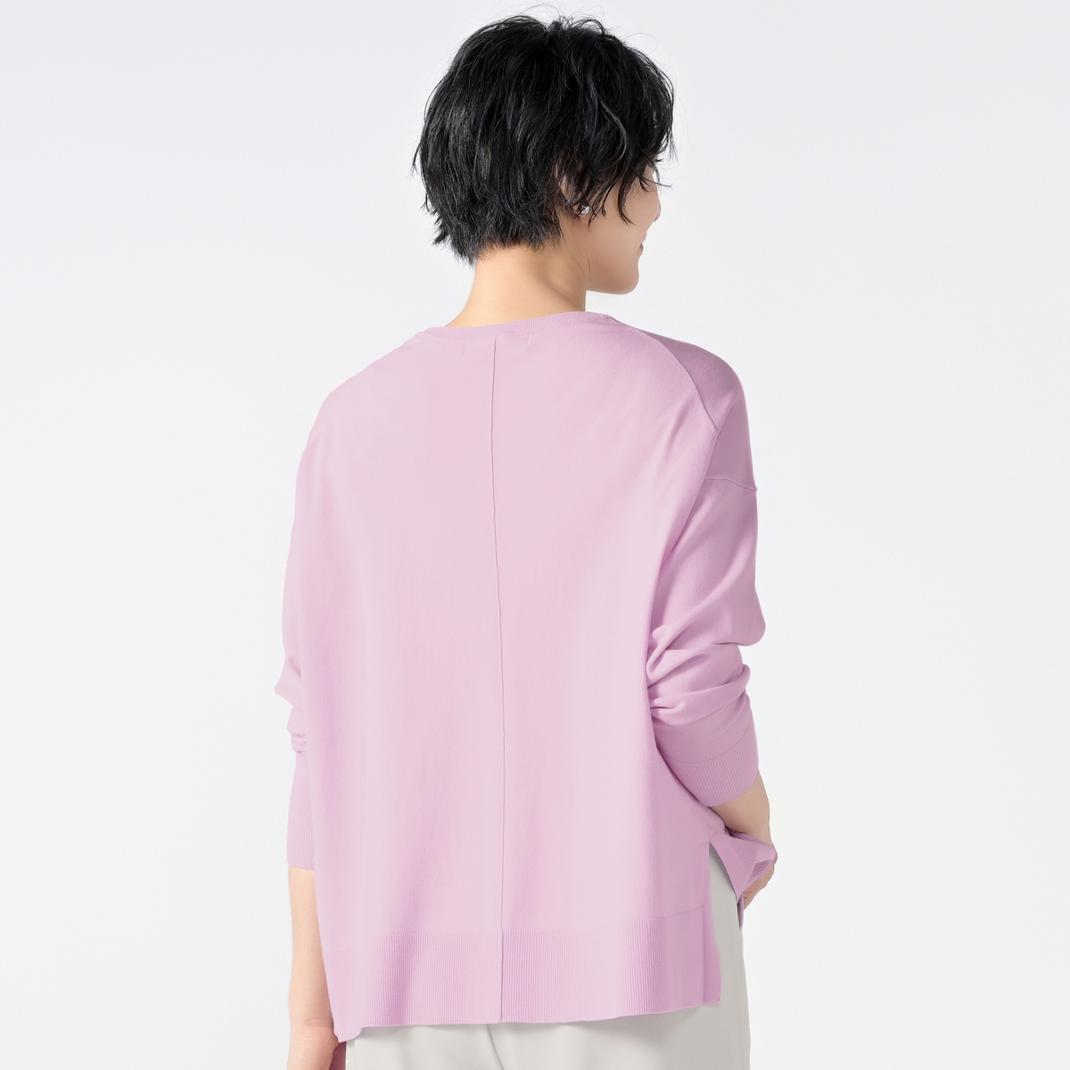 人気のワイドシルエットのクルーネックプルオーバー。ボリュームをおさえつつ、どんなボトムスとも合わせやすいサイズ感です。前後差のあるサイドスリットがレイヤードしやすく、ヘムラインに動きが出て軽い着心地です