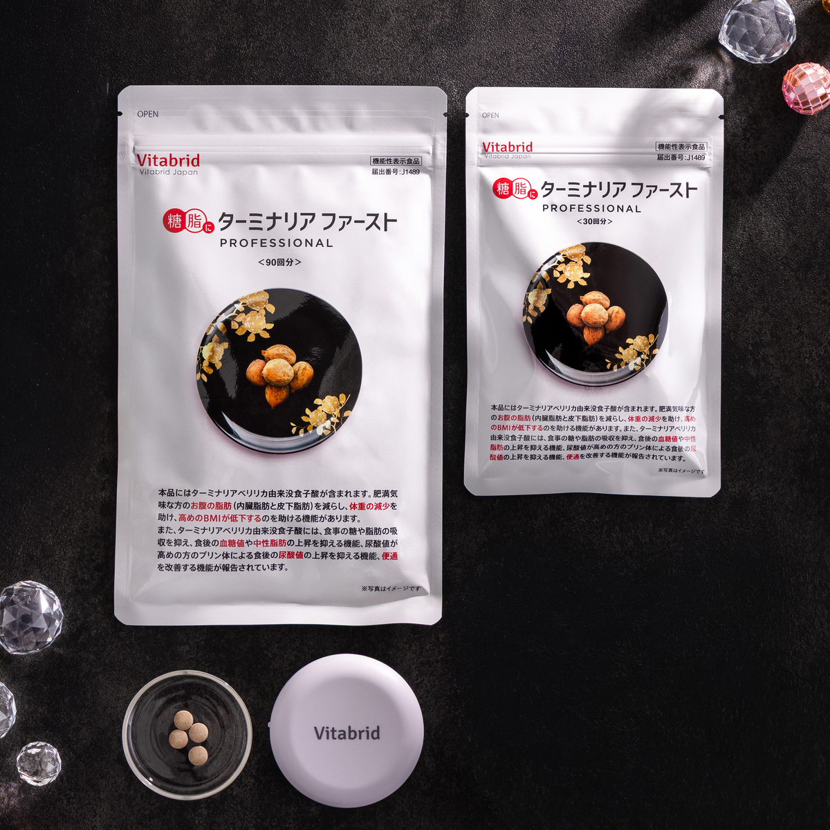 [アレルギー物質特定原材料8品目] なし [商品内容] ・360粒 ・120粒 ・サプリケース ※プレゼント [目安量] 食後の血糖値や中性脂肪、尿酸値が気になる方:1日1〜3回、1回4粒 便通が気になる方:1日1回4粒 肥満気味でお腹の脂肪が気になる方:1日当たり8粒(4粒を2回) [お召し上がり方] 食後の血糖値や中性脂肪、尿酸値が気になる方は1日1〜3回を目安に1回4粒を、便通が気になる方は1日1回4粒を、肥満気味でお腹の脂肪が気になる方は1日当たり8粒(4粒を2回)を目安に、食事とともに水などと一緒にお召し上がりください [届出番号]J1489 [機能性表示] 本品にはターミナリアベリリカ由来没食子酸が含まれます。本品は、肥満気味な方のお腹の脂肪(内臓脂肪と皮下脂肪)を減らし、体重の減少を助け、高めのBMIが低下するのを助ける機能があります。ターミナリアベリリカ由来没食子酸には、食事の糖や脂肪の吸収を抑え、食後の血糖値や中性脂肪の上昇を抑える機能、尿酸値が高めの方の食事のプリン体による食後の尿酸値の上昇を抑える機能、便通を改善する機能が報告されています。 [栄養成分表示 1日摂取目安量] 1回4粒:エネルギー2.8kcal、たんぱく質0〜0.05g、脂質0〜0.02g、炭水化物0.9g、糖類0.03〜0.06g、食塩相当量0〜0.004g 2回8粒:エネルギー5.6kcal、たんぱく質0〜0.09g、脂質0〜0.04g、炭水化物1.8g、糖類0.06〜0.12g、食塩相当量0〜0.008g 3回12粒:エネルギー8.4kcal、たんぱく質0〜0.13g、脂質0〜0.06g、炭水化物2.6g、糖類0.09〜0.18g、食塩相当量0〜0.012g ターミナリアベリリカ由来没食子酸 1回4粒:20.8mg/2回8粒/41.6mg/3回12粒:62.4mg [保存方法] 高温、多湿及び直射日光を避けて保存してください ■機能性表示食品 ※機能性関与成分(1日摂取目安量) ターミナリアベリリカ由来没食子酸 1回4粒:20.8mg/2回8粒/41.6mg/3回12粒:62.4mg [原料原産地] 還元パラチノース(国内製造) [原産国] 日本 (サプリケースは中国製 ) [注意事項] ※2、3回分を一度にお召し上がりにならないでください。多量摂取により疾病が治癒したり、より健康が増進するものではありません。また、妊娠中の方あるいは妊娠の可能性のある方は医師に相談してください。※鉄の吸収を阻害する可能性がありますので、貧血のお薬を服用している方はご注意ください ※医薬品ではありません ※本品は、疾病に罹患している者、未成年者、妊産婦(妊娠を計画している者を含む)及び授乳婦を対象に開発された食品ではありません ※疾病に罹患している者は医師に、医薬品を服用している者は医師、薬剤師に摂取について相談してください ※体調に異変を感じた際は、速やかに摂取を中止し、医師に相談してください ※本品は、特定保健用食品と異なり、機能性及び安全性について国による評価を受けたものではありません。届け出られた科学的根拠等の情報は消費者庁のウェブサイトで確認できます ※食物アレルギーのある方は原材料をご確認の上、お召し上がりください ※本品は天産物を使用しておりますので、収穫時期などにより色・風味のばらつきがございますが、品質に問題はありません ※原料由来の斑点が見られることがございますが、品質に問題はありません。 乾燥剤が入っていますので、お召し上がりにならないようにご注意ください ※食生活は、主食、主菜、副菜を基本に、食事のバランスを [原材料] ターミナリアファースト プロフェッショナル5:還元パラチノース(国内製造)、ターミナリアベリリカ抽出物、難消化性デキストリン(水溶性食物繊維)、有胞子性乳 酸菌末、クロム含有酵母、桑葉末、ウコン抽出物、杜仲葉抽出物、白インゲン豆抽出物、サラシア抽出物、シジミ抽 出物、ヒハツ抽出物、殺菌乳酸菌末、青トウガラシ発酵抽出物、豚肝臓酵素分解物(豚肉を含む)/セルロース、ス テアリン酸カルシウム、二酸化ケイ素、塩化カリウム、ビタミンB6、ビタミンB12