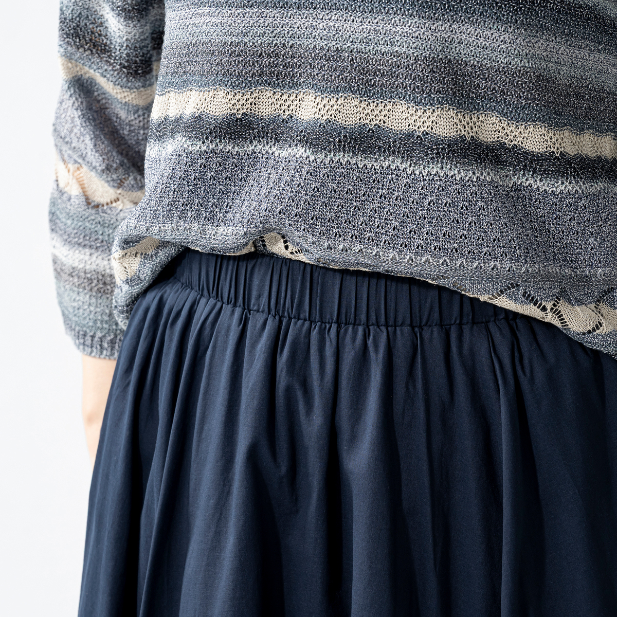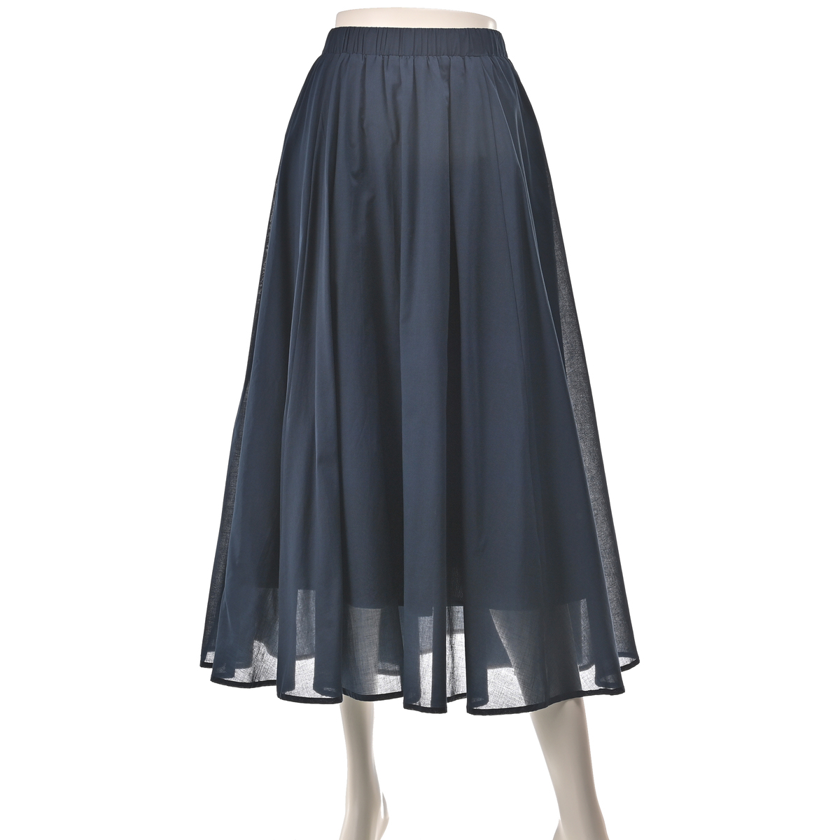 軽やかさとふんわり感を備えた、コットン100%のスカート。表地と裏地に同素材を用いた二重仕立てで、たっぷりとしたフレアでも重たくなりにくい設計です。薄く涼しげな生地で、ウエストは全面ゴム仕様です