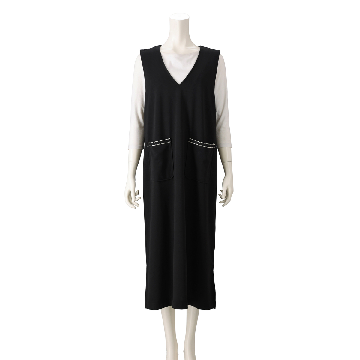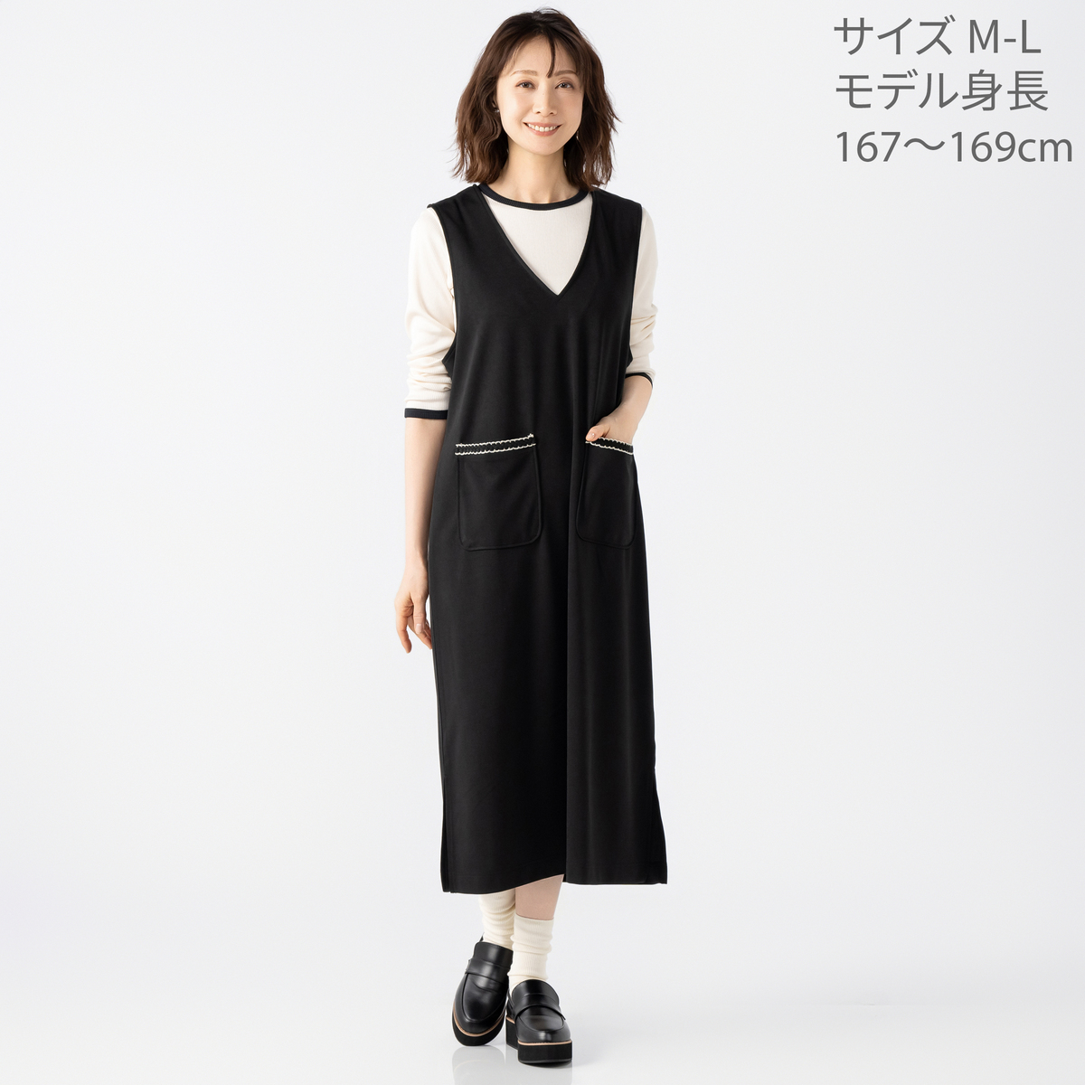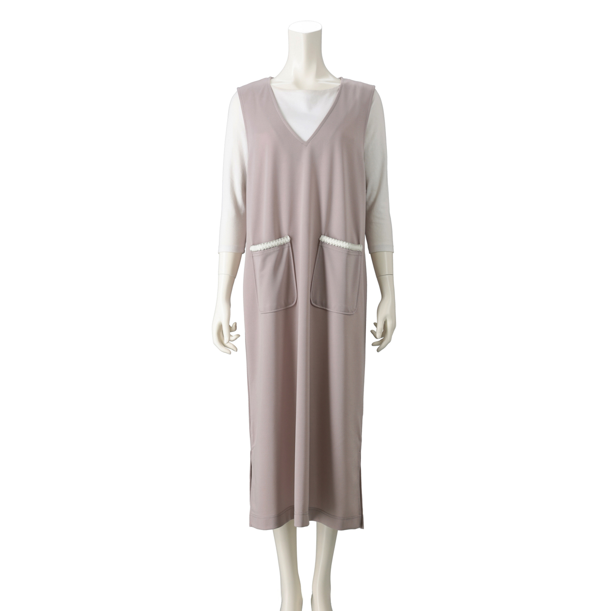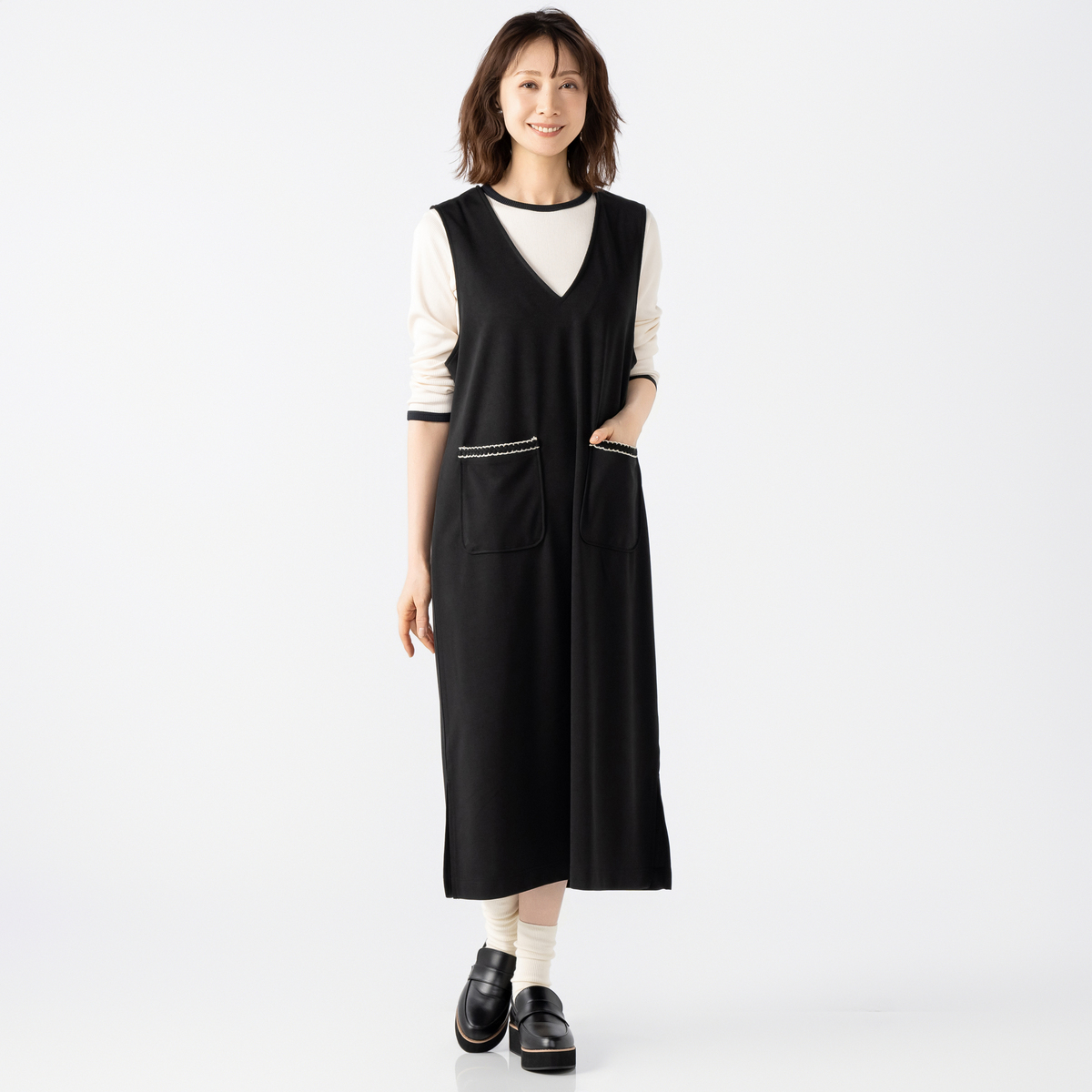 顔周りをすっきり見せるVネックと、ポケット口に施したレーステープが大人可愛いジャンパースカート。裾のスリットが足さばきを良くし、ストンとしたAラインシルエットが自然に体型をカバーします