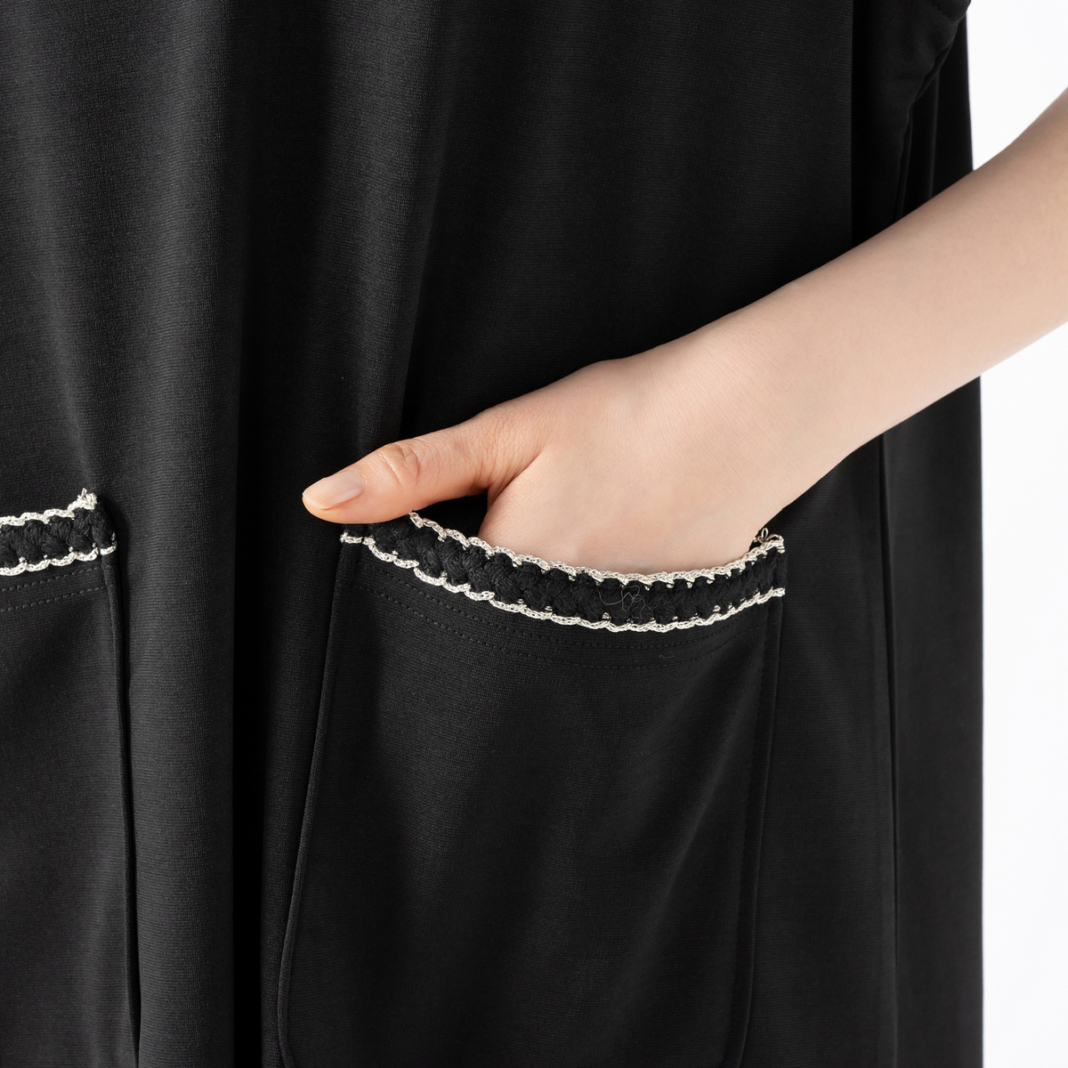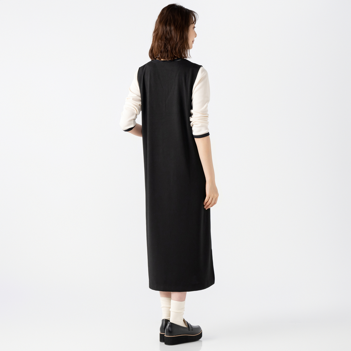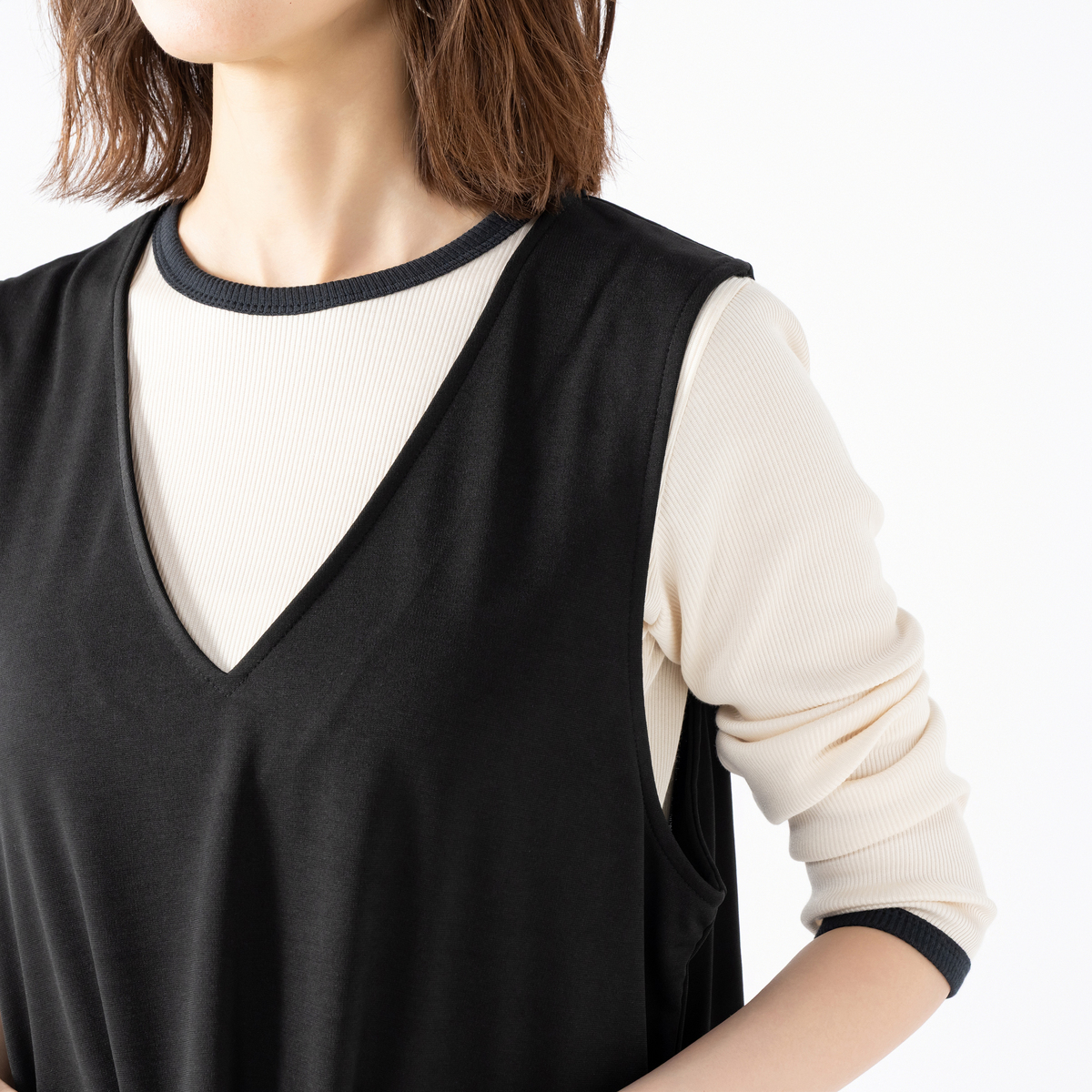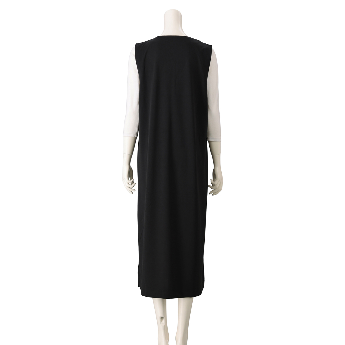 顔周りをすっきり見せるVネックと、ポケット口に施したレーステープが大人可愛いジャンパースカート。裾のスリットが足さばきを良くし、ストンとしたAラインシルエットが自然に体型をカバーします
