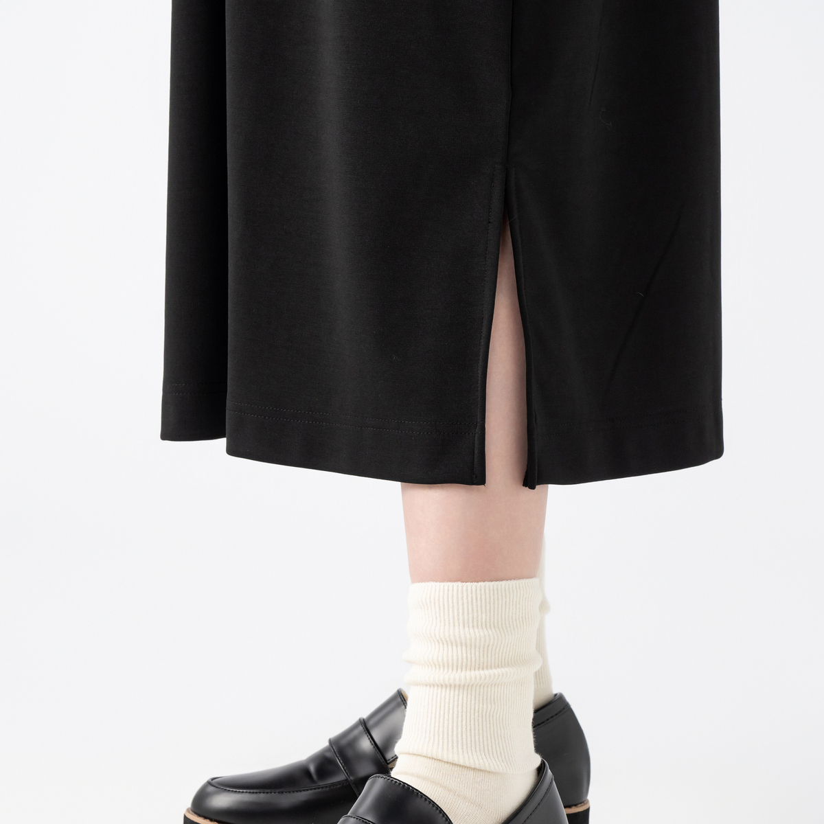 ハリ感と伸縮性を持つストレッチポンチ素材を使用し、なめらかな肌触りと程良い厚みできちんと感のある見た目を保ちます。編地でポリウレタンも入っているので、身体の動きにフィットし、ストレスフリーな着心地です