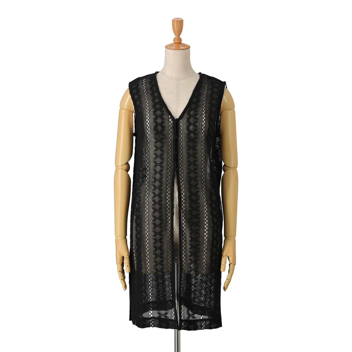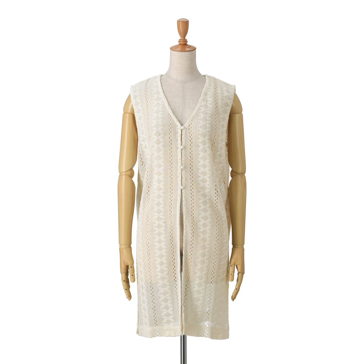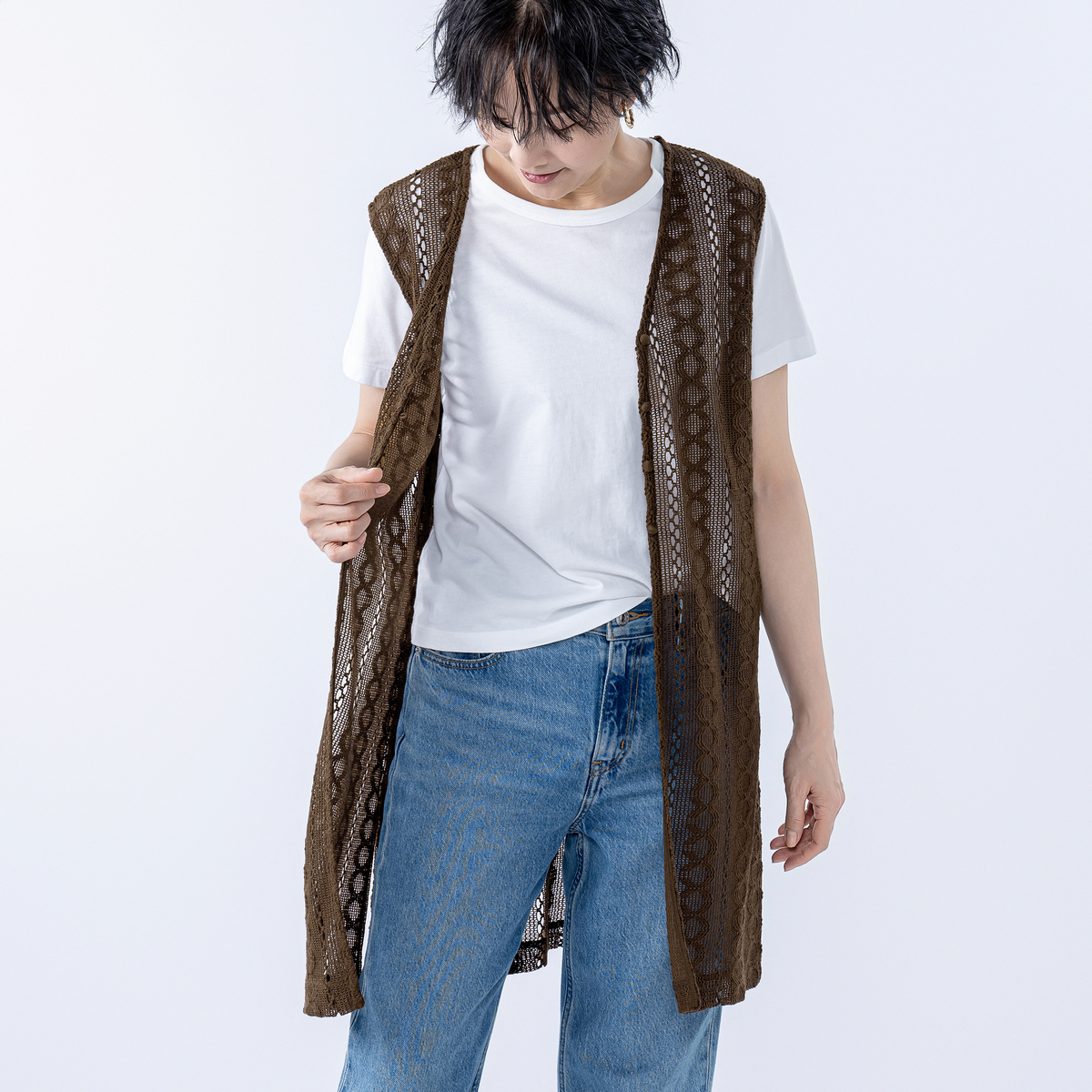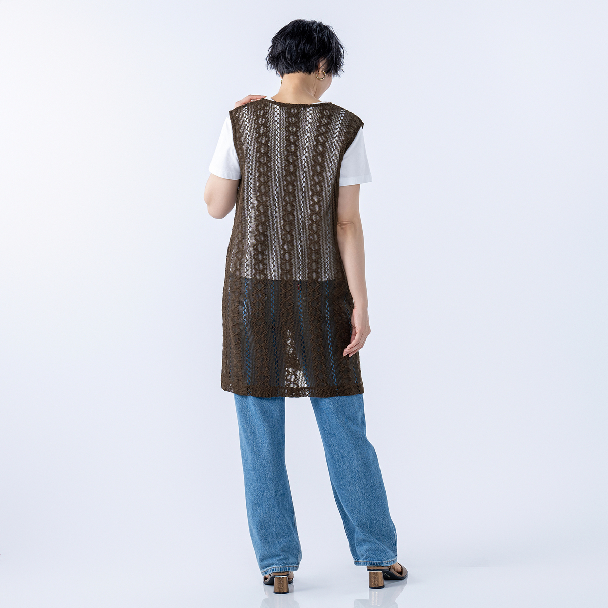 クロシェレースの縦ライン柄が特徴のジレ。柔らかな印象のレースを使用し、Iラインのすっきりとしたシルエットに仕上げました。Tシャツやブラウスに重ねることで、装いに程よいアクセントを加えます