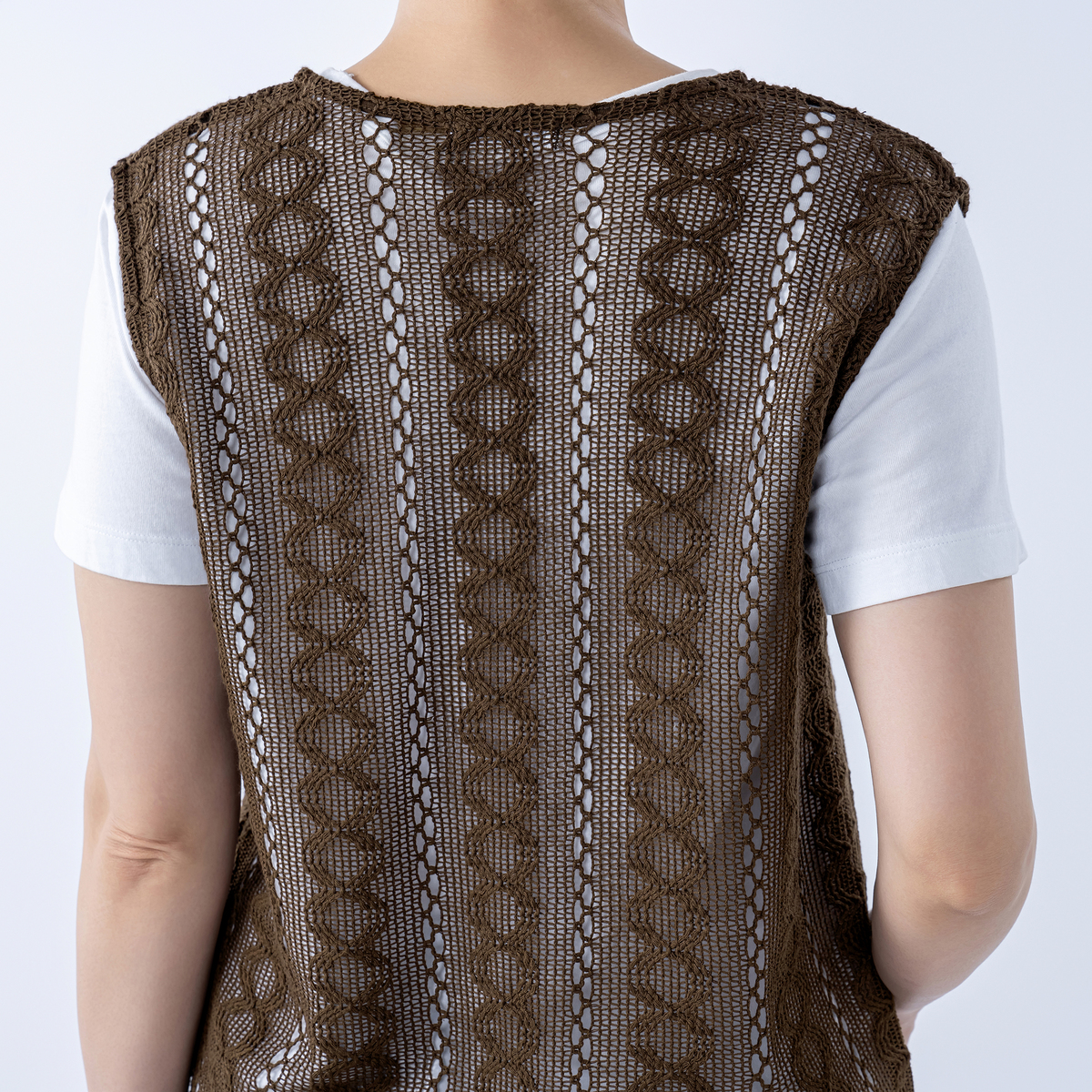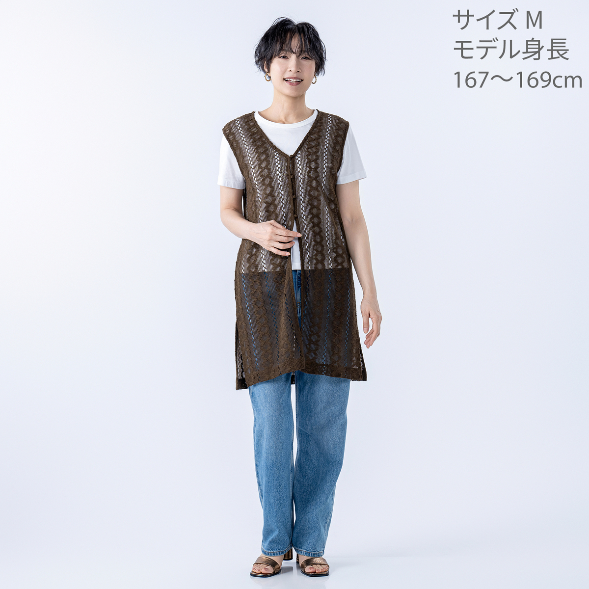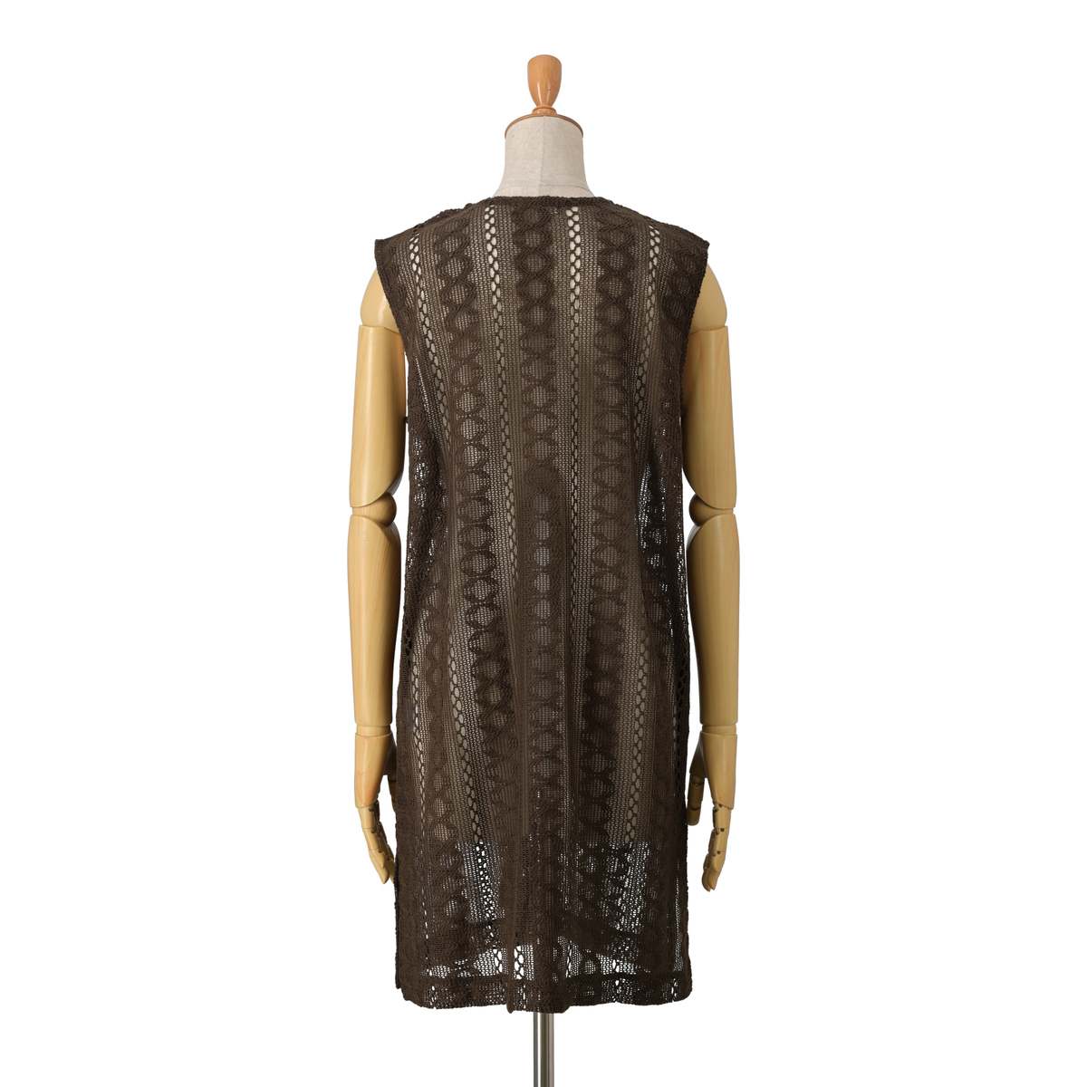クロシェレースの縦ライン柄が特徴のジレ。柔らかな印象のレースを使用し、Iラインのすっきりとしたシルエットに仕上げました。Tシャツやブラウスに重ねることで、装いに程よいアクセントを加えます