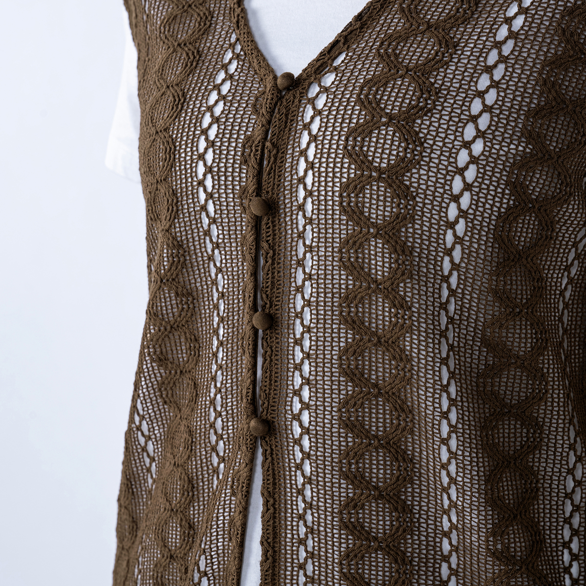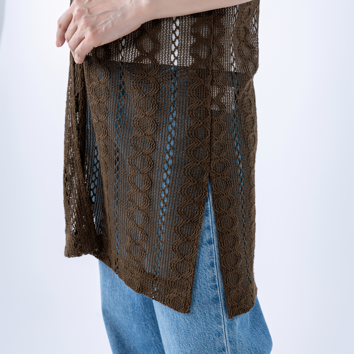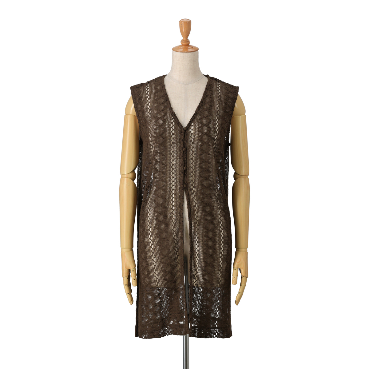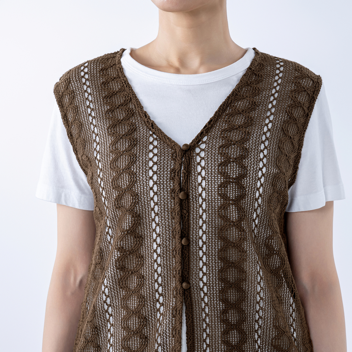 クロシェレースの縦ライン柄が特徴のジレ。柔らかな印象のレースを使用し、Iラインのすっきりとしたシルエットに仕上げました。Tシャツやブラウスに重ねることで、装いに程よいアクセントを加えます