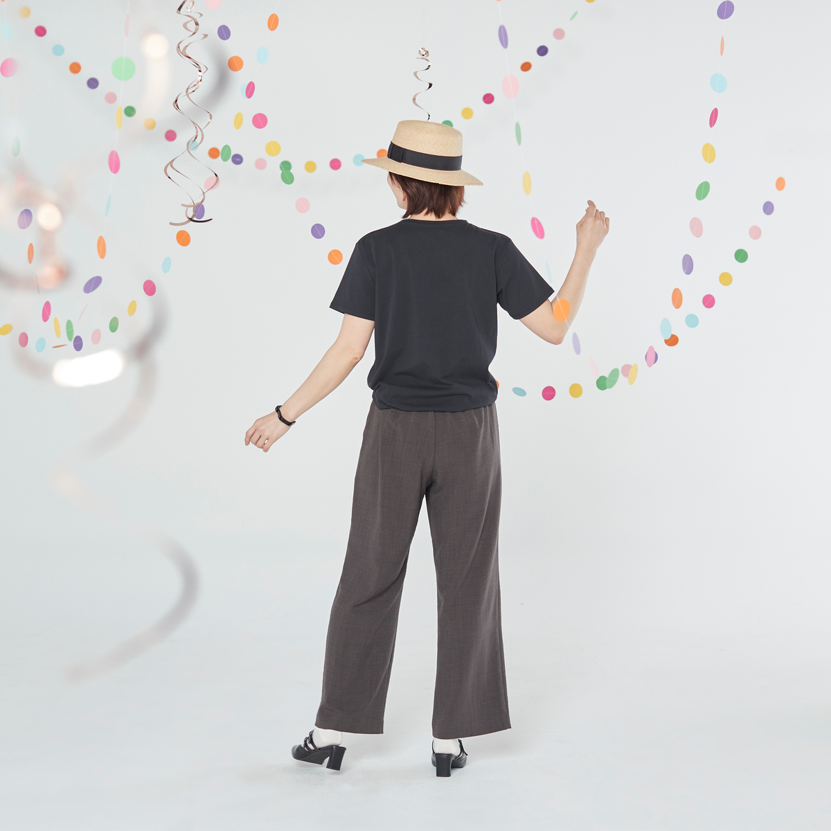 箔ロゴが上品に映えるTシャツ。肌離れのよい綺麗な目面の素材で、ゆったりとしつつ裾に向かって少し締まるシルエットが腰まわりをすっきり見せます